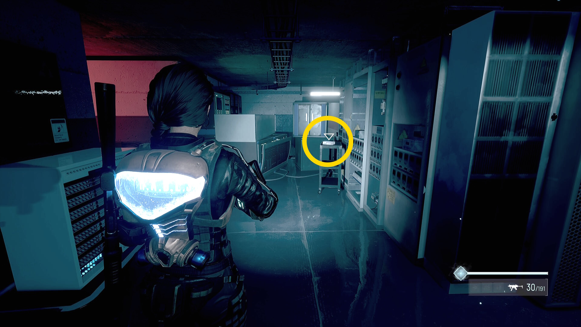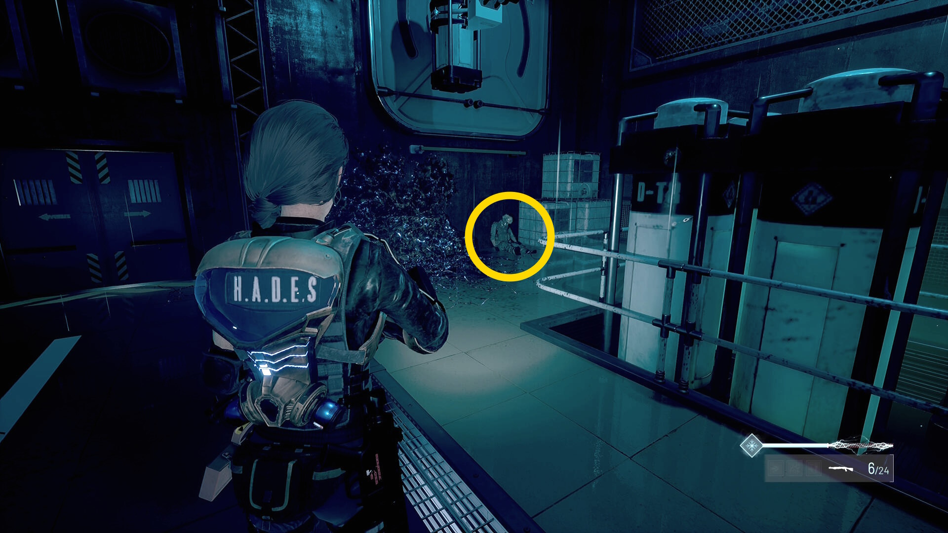 - 通路の突き当り、2体の死体から マシンガンの弾 を回収