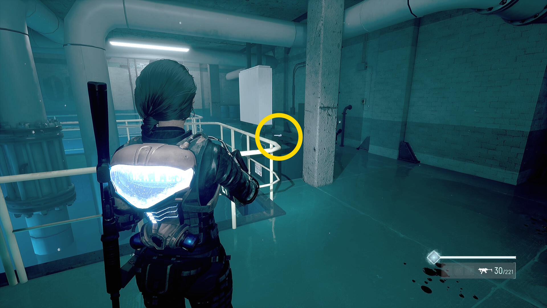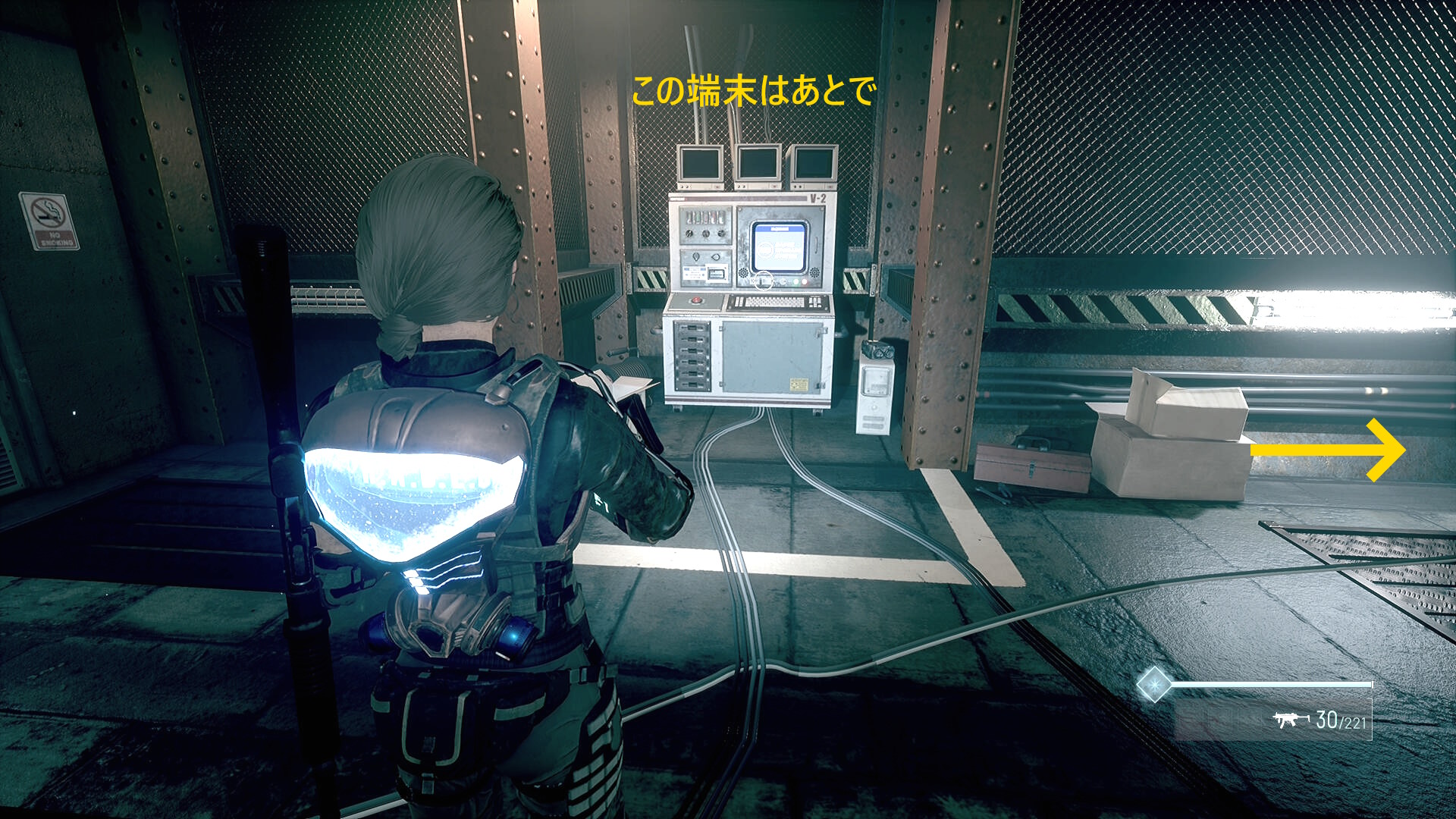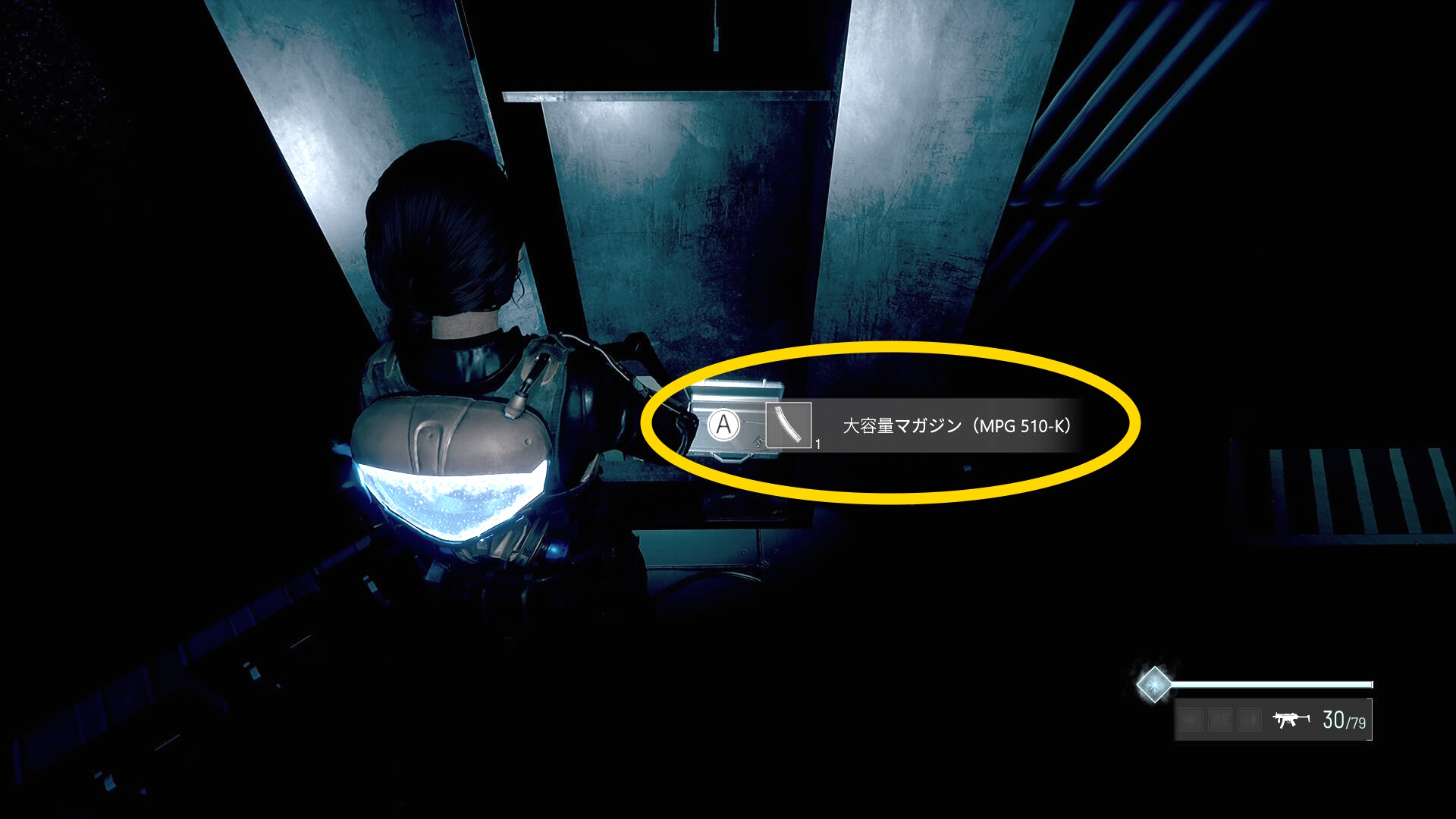 - 左に進み、スクリーンの下の死体から マシンガンの弾