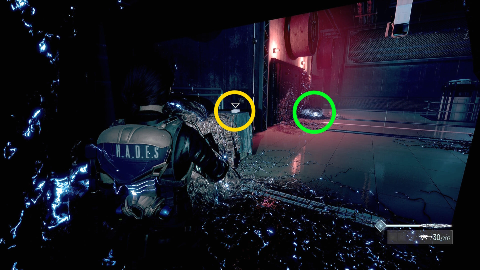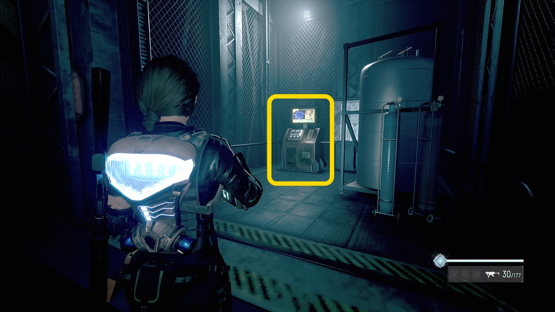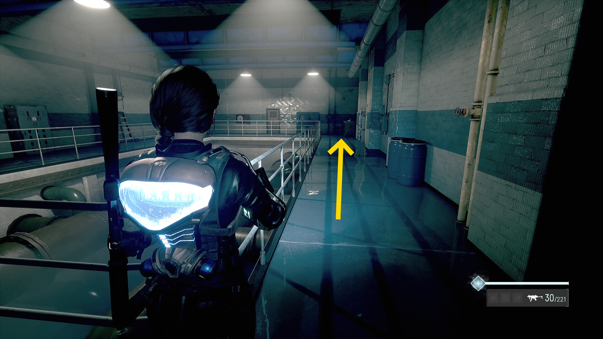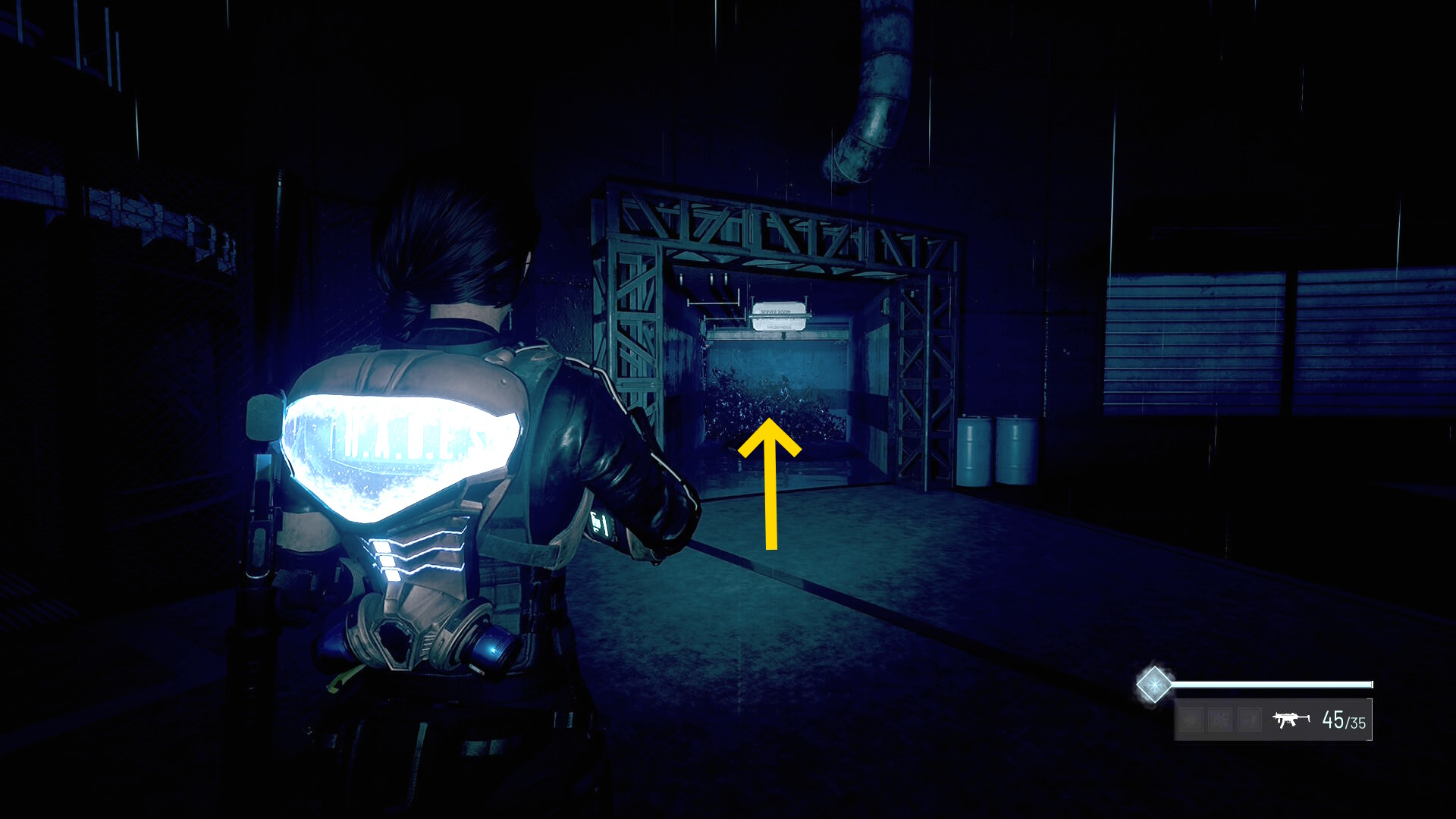- 左に進み、スクリーンの下の死体から マシンガンの弾