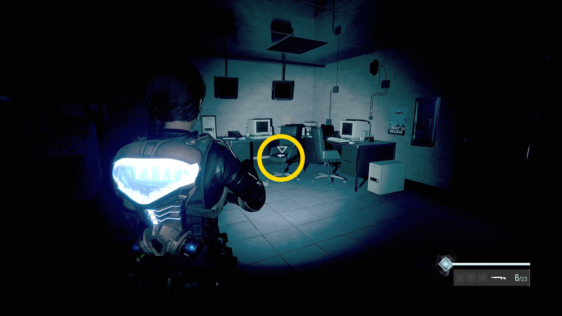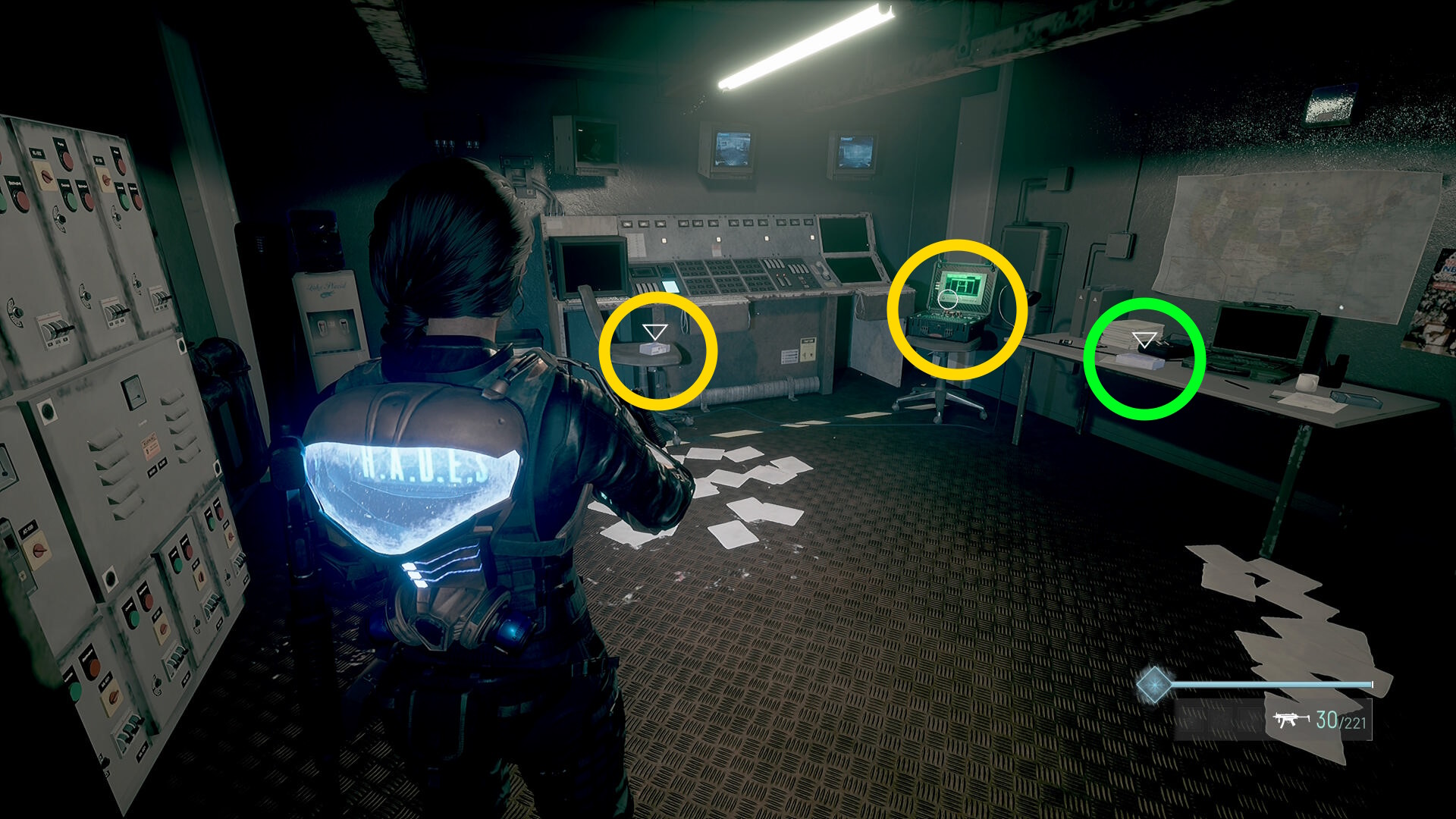 - 部屋に入ると正面の椅子の上に マシンガンの弾、右の椅子の上に 手動セーブ端末、右のテーブルに キーケース(緑◯)