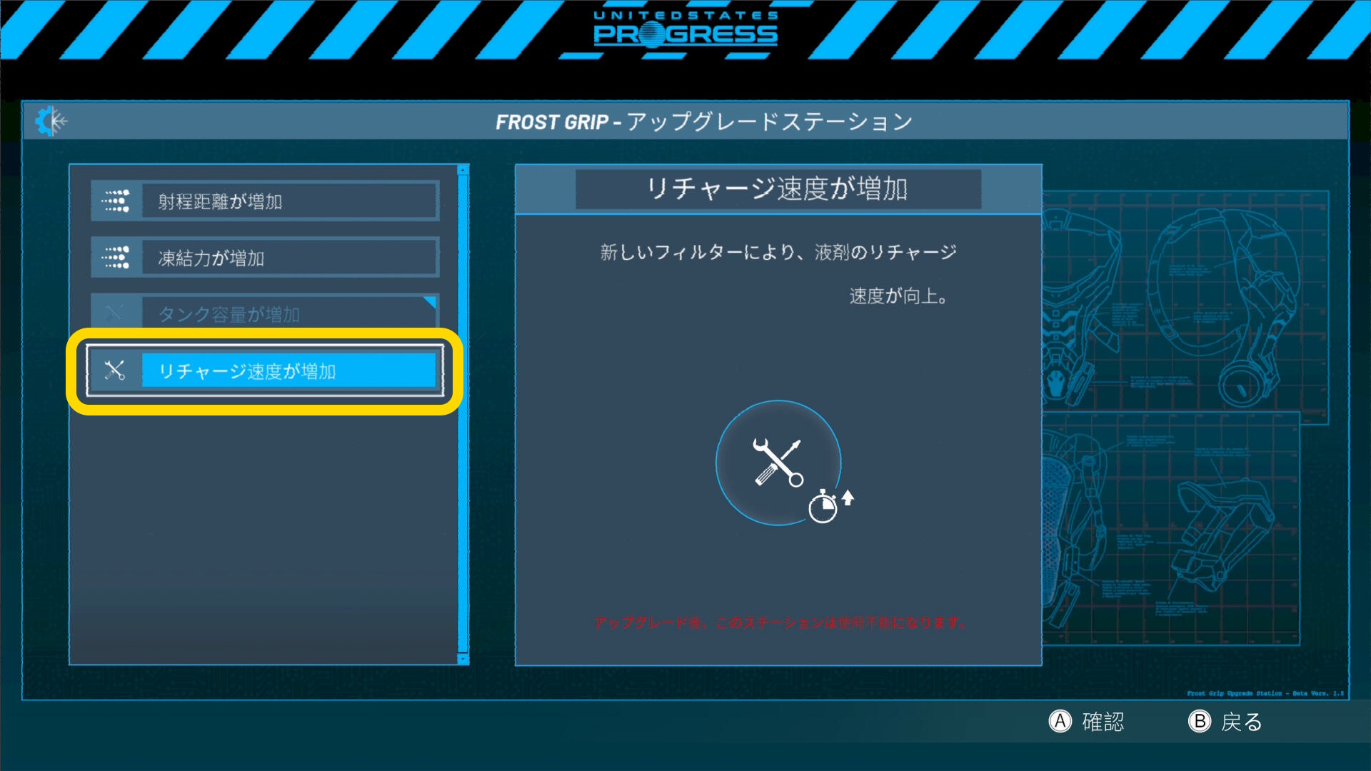 - 好きな項目をアップグレードしていただければ(当サイトでは「リチャージ速度が増加」を選んだ)