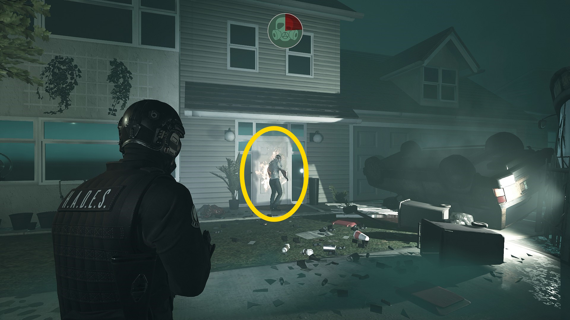 - そこから左前方の家に進み、ドア前に突っ立っているゾンビをキルして2軒目の家に入る
