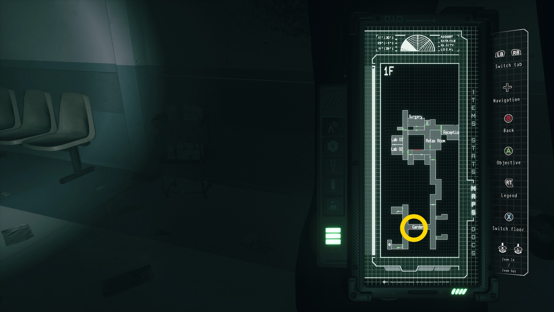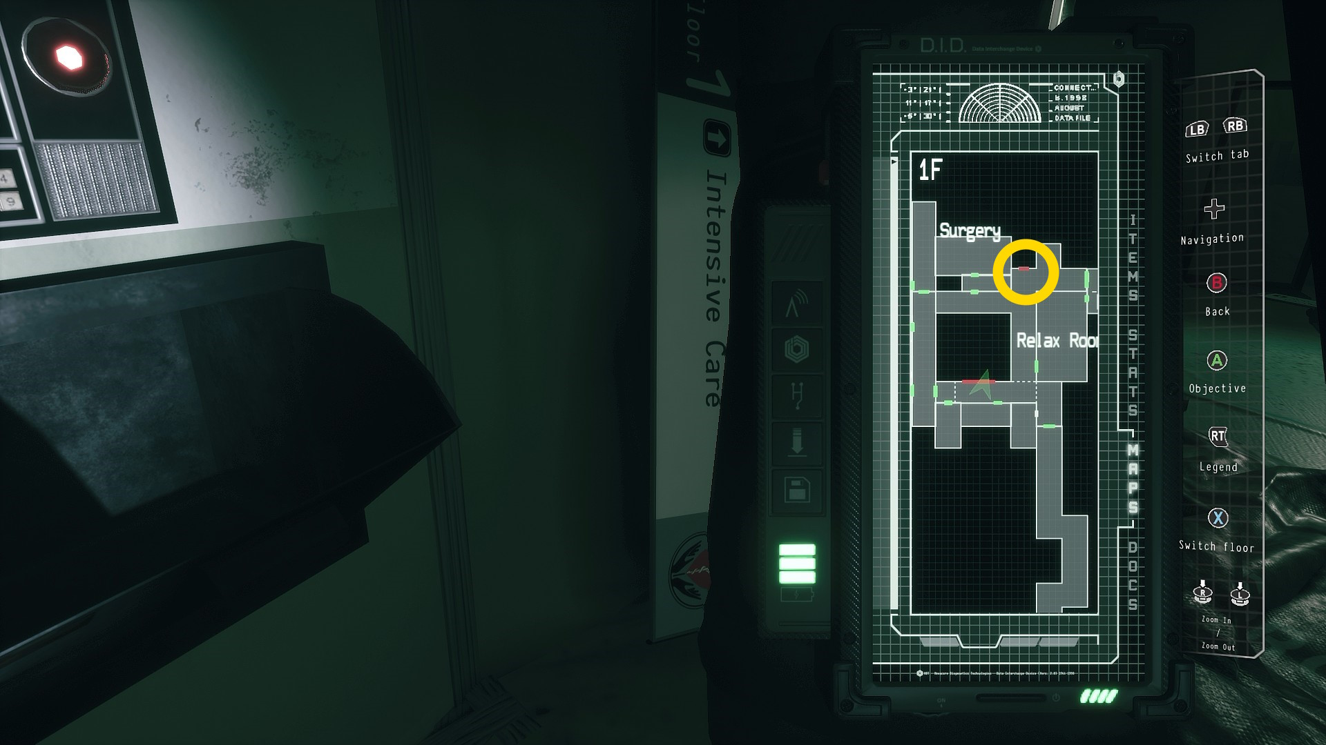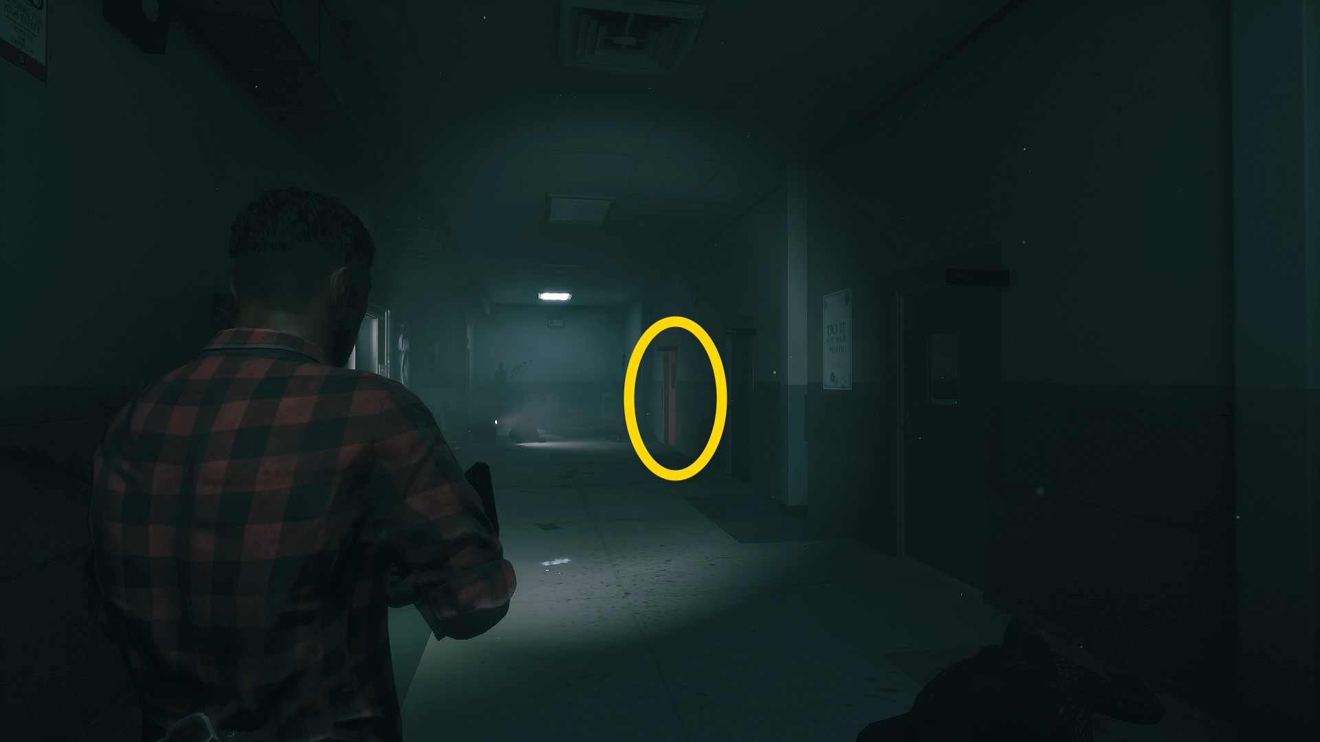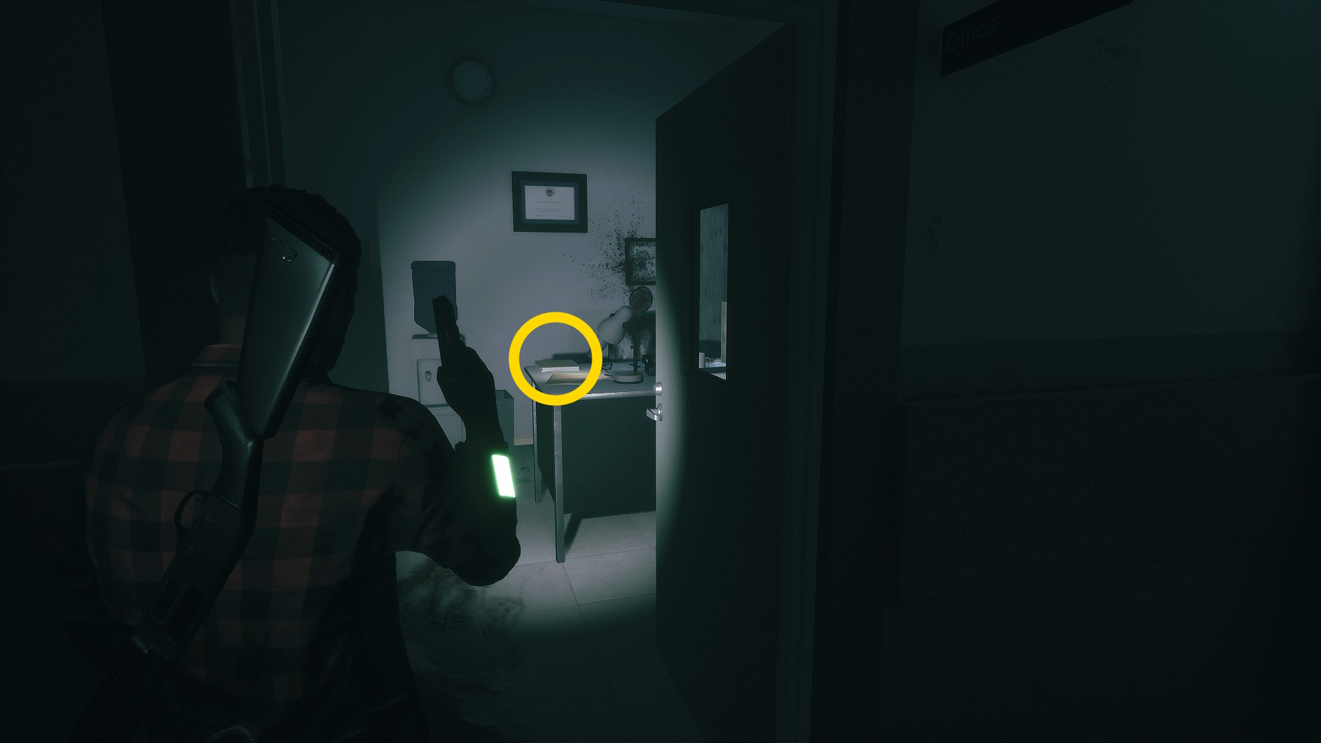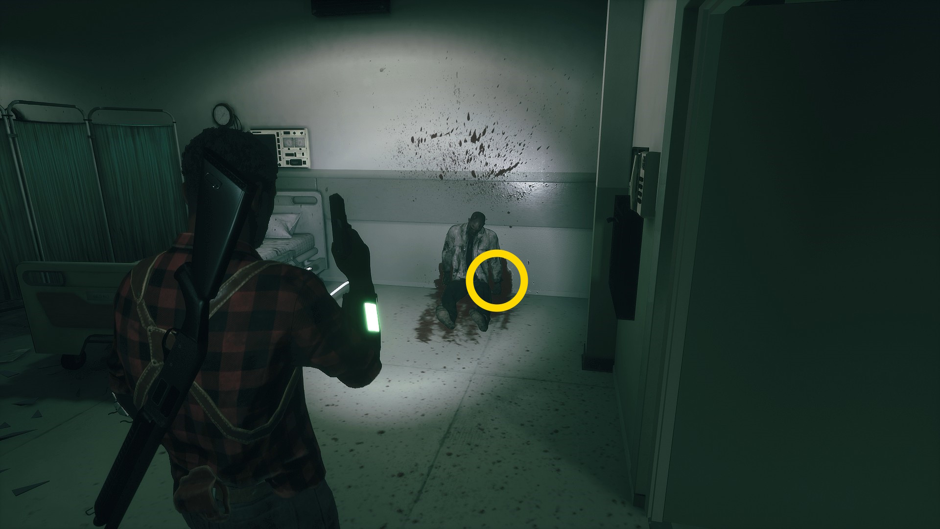 - 殲滅したら、彼らが来たほうへ移動(廊下を右折)し、右前方を見ると処置室のドアが開いているのが確認できる