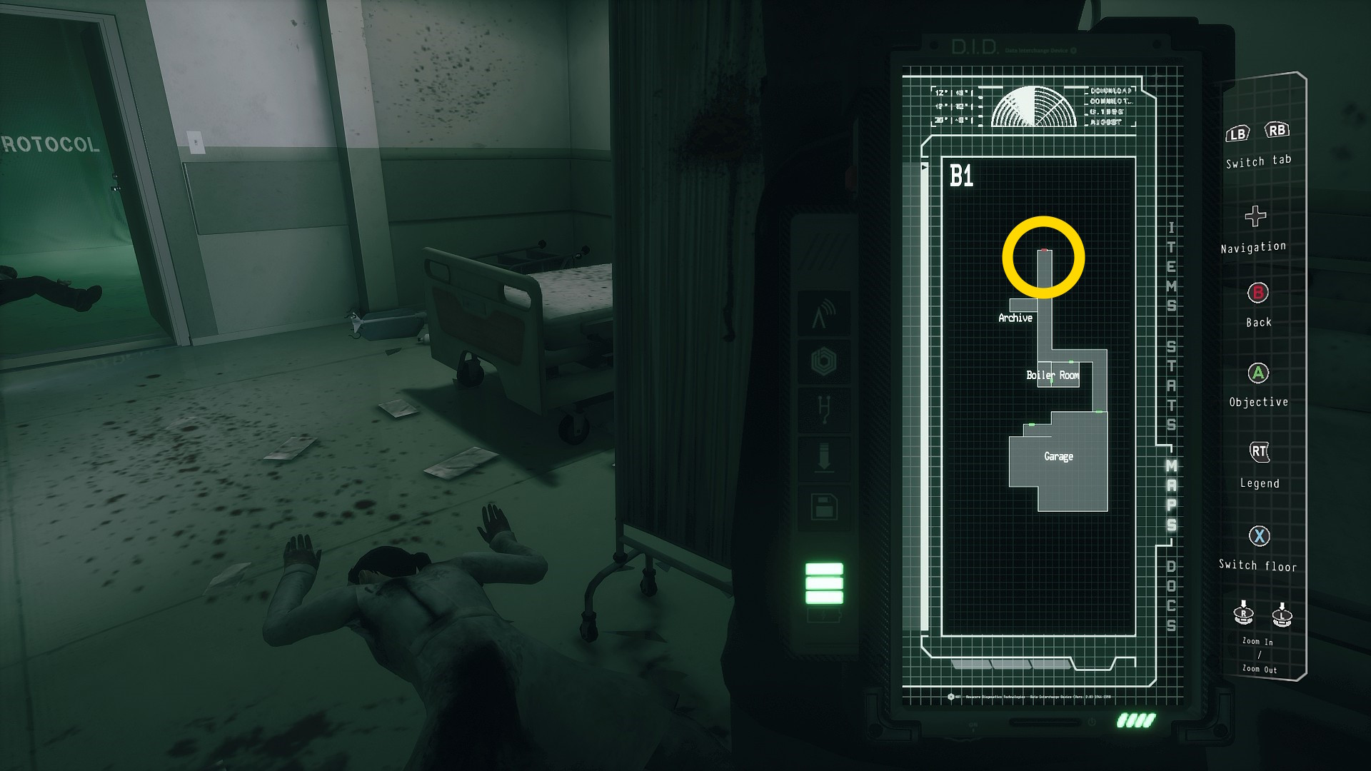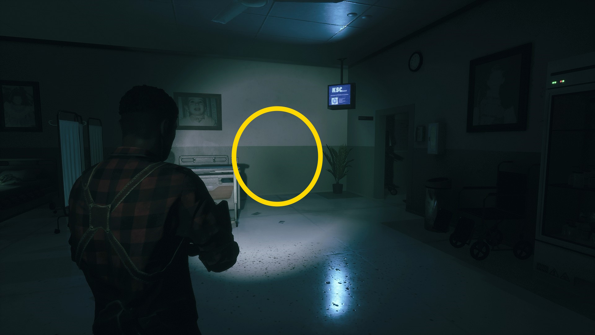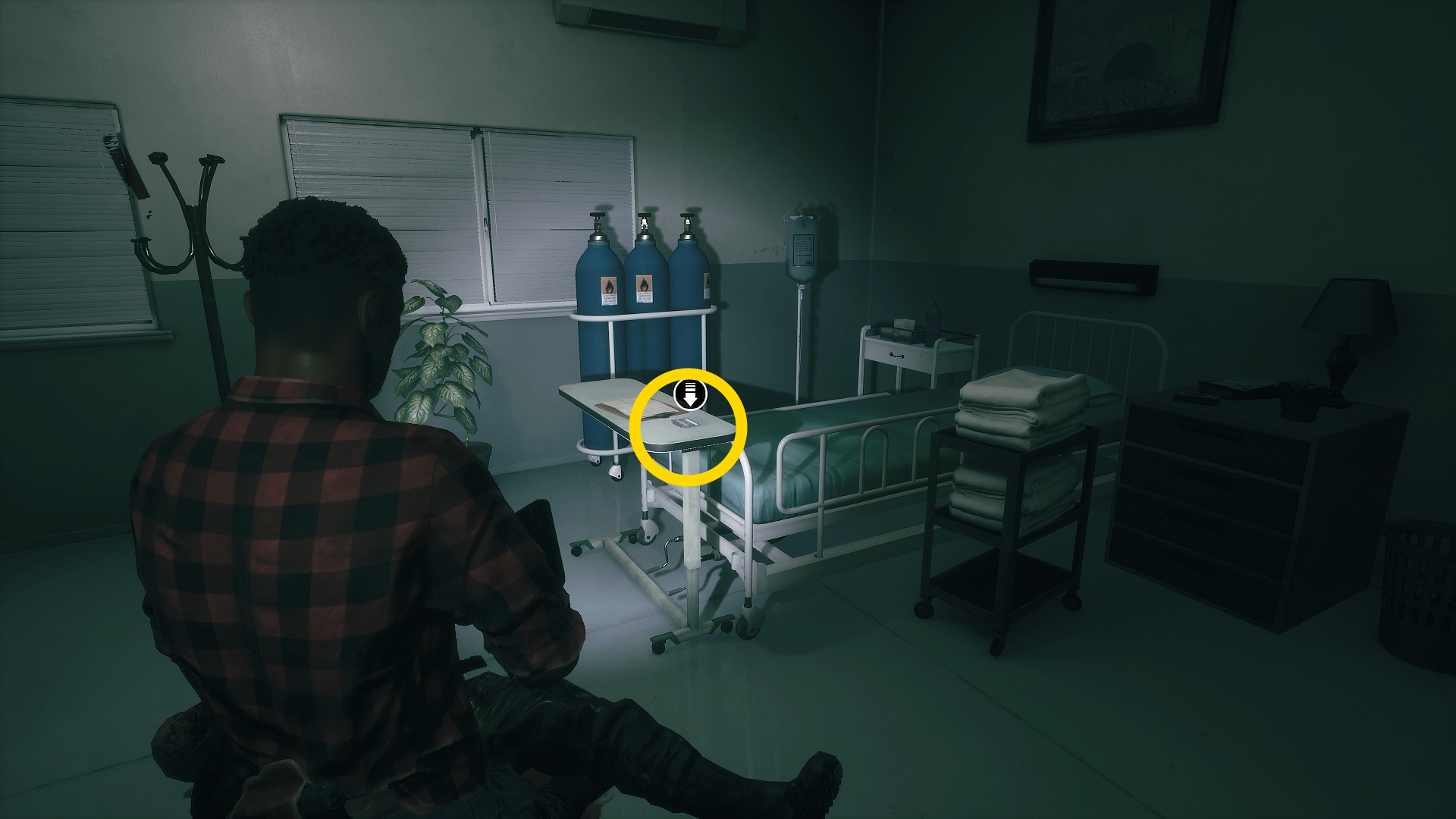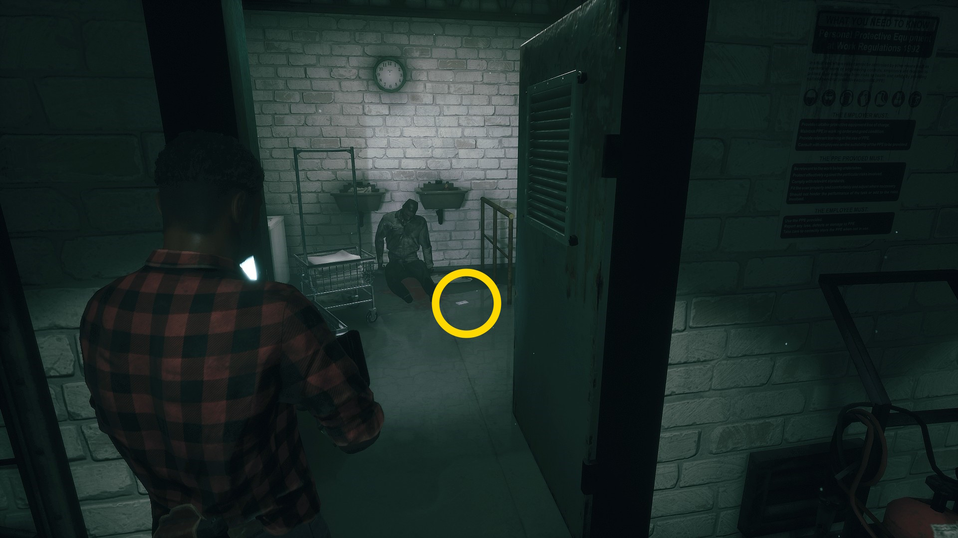 - 部屋の奥に停まっている車椅子の手前、左側の死体のそばに Morgue Key(以降、遺体安置所の鍵)が落ちているので回収
