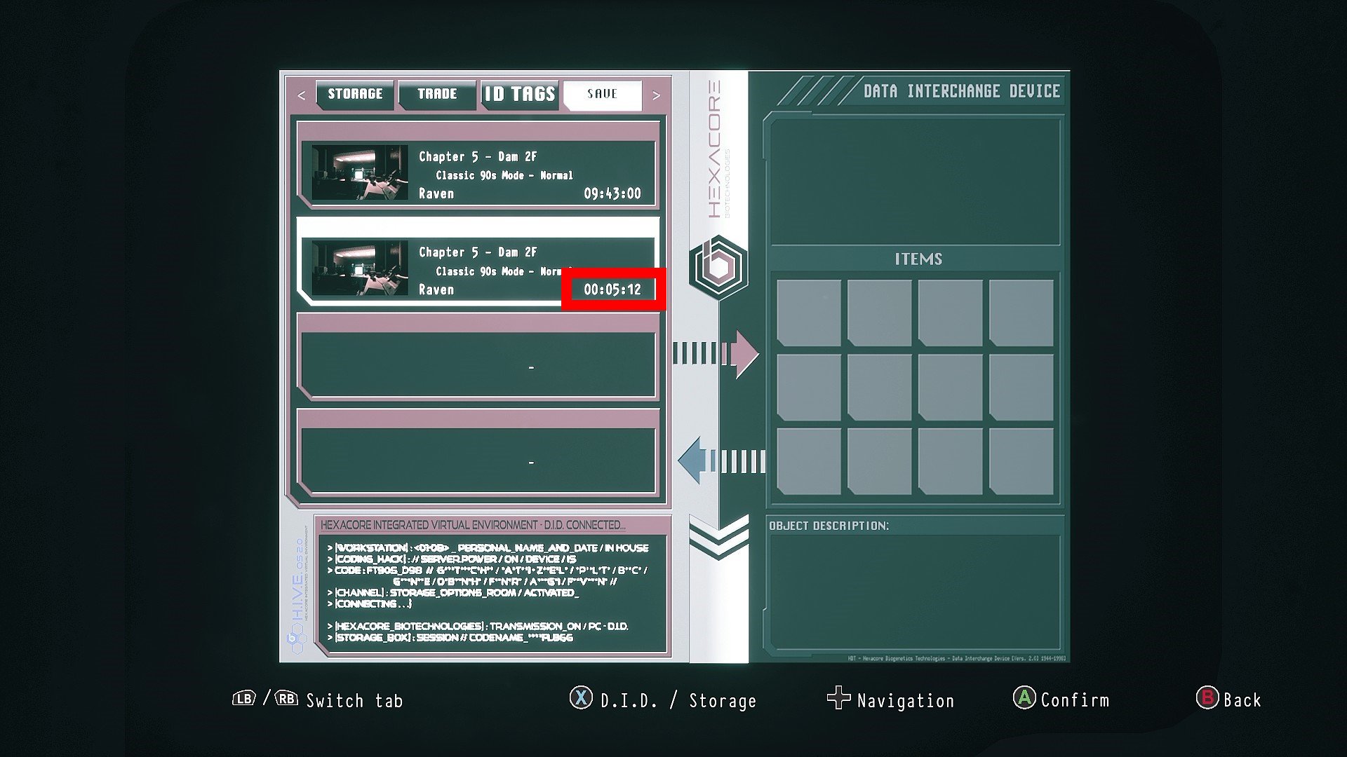 - H.I.V.E 端末で手動セーブするとプレイ時間が分かる(タイトルに戻り、Load を選べばオートセーブのプレイ時間も分かる)