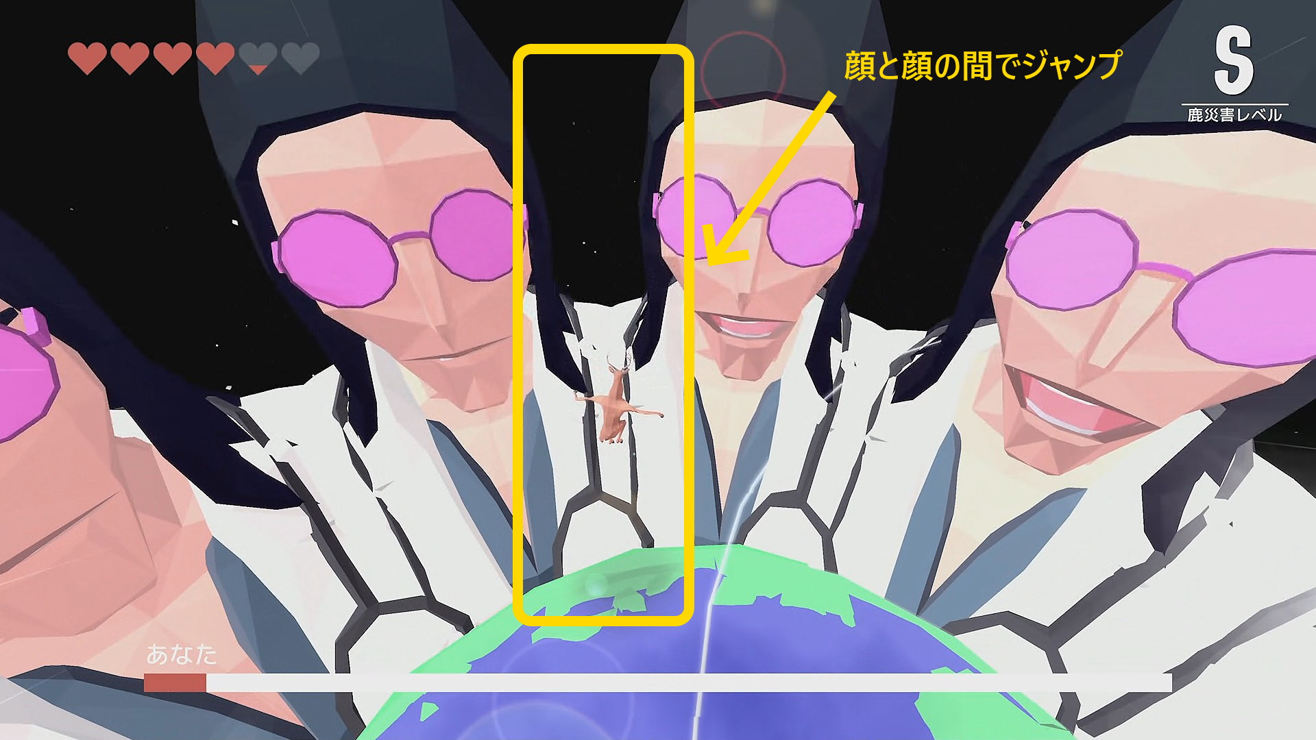 - 終盤、ラスボスの顔に囲まれたらレーザー攻撃を避けるのだが、顔と顔の間でタイミングよく垂直ジャンプを繰り返していたほうが安全だったりする