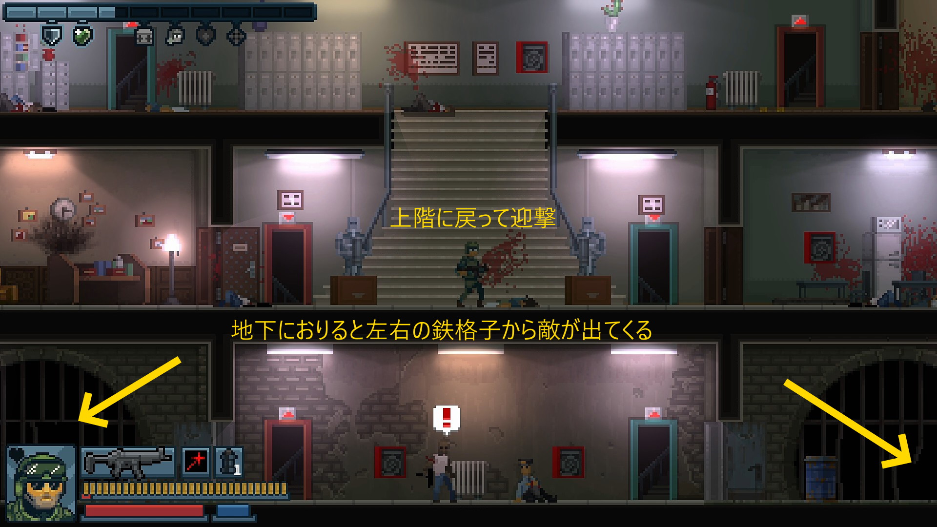 - 地下におりると左右にある鉄格子から敵が出現し、こちらに向かってくるので上階で迎撃すると安全