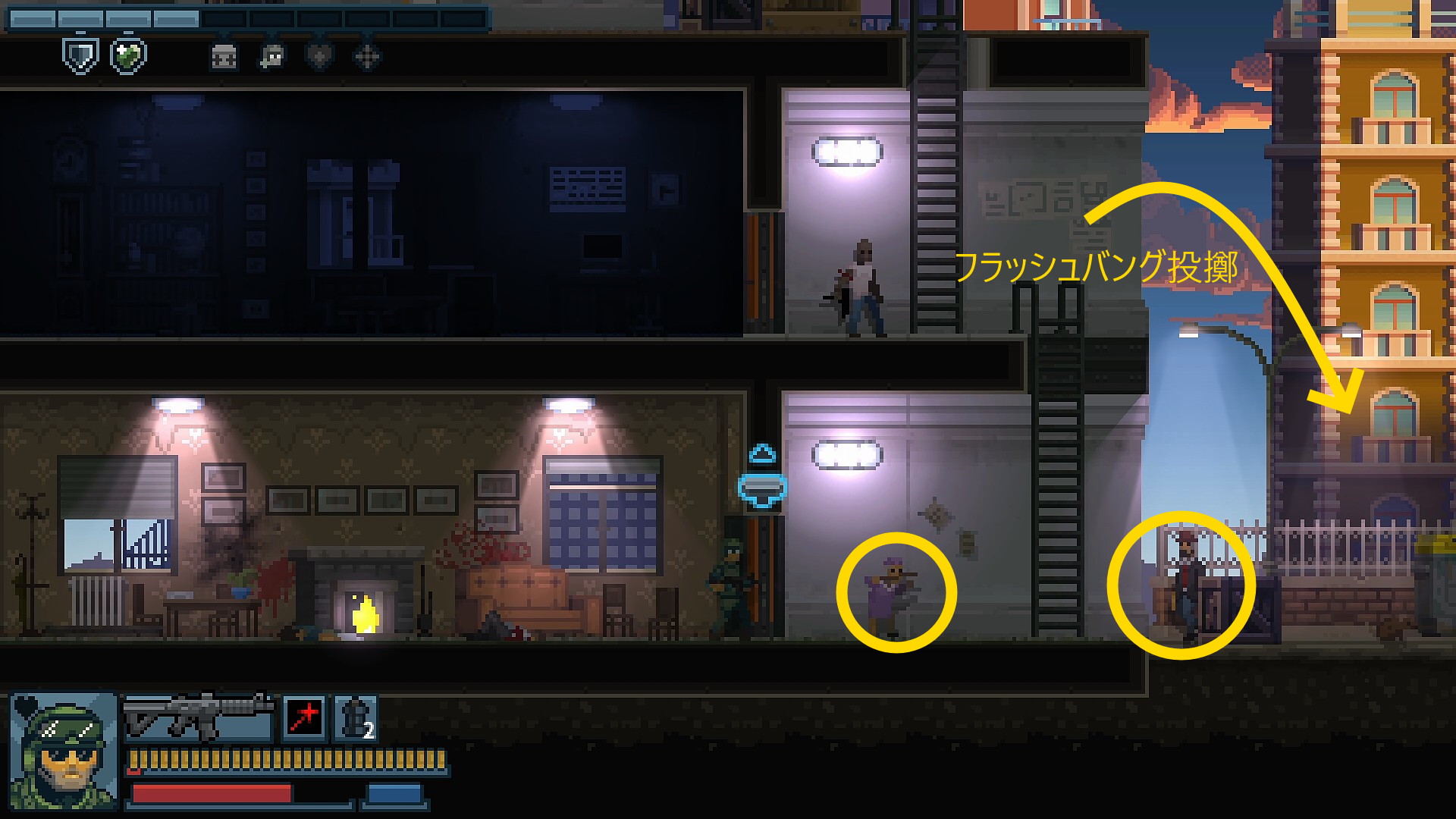 • 2階の外はしごのところからフラッシュバングを投擲して一気に片付けると安全