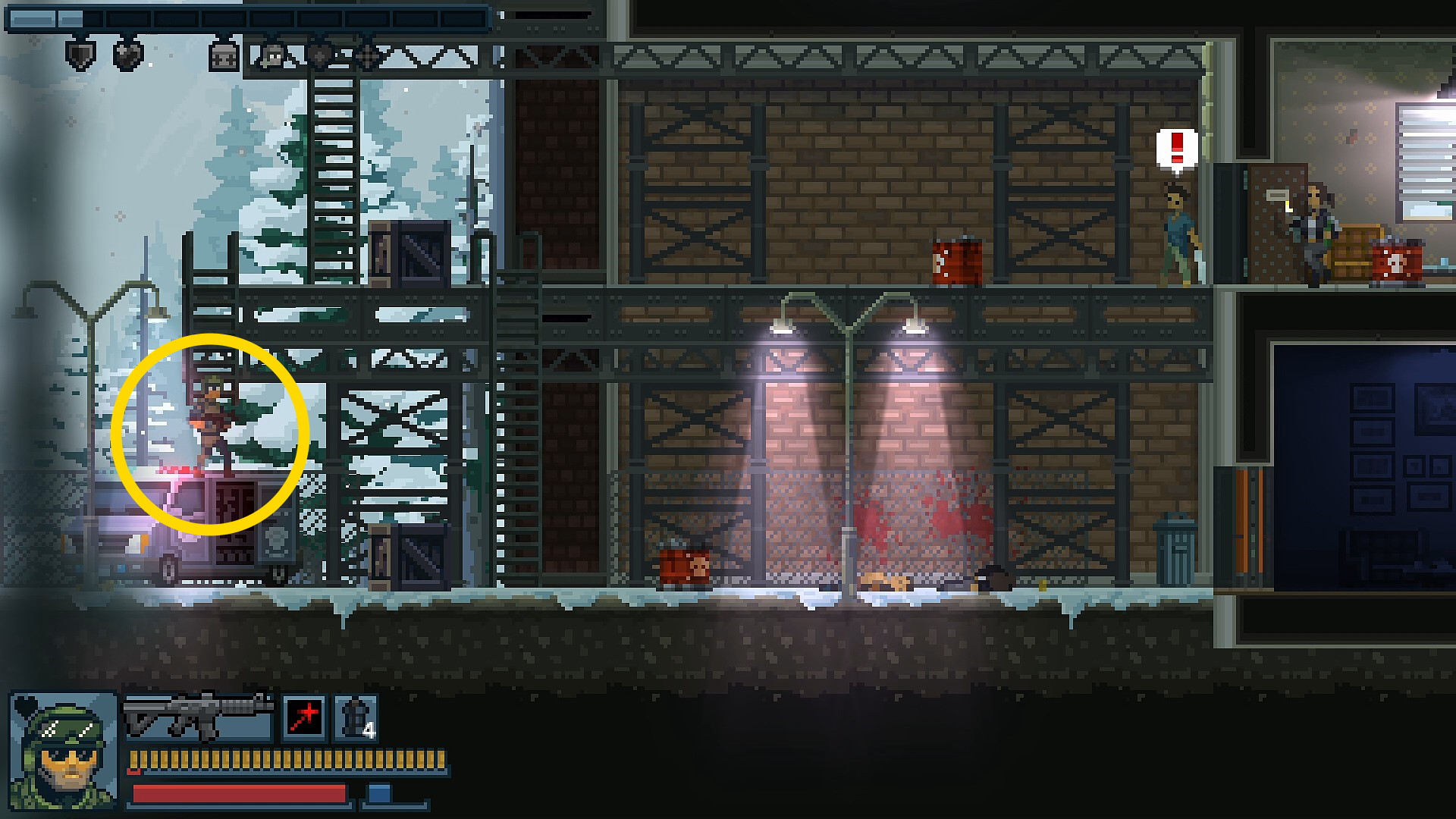 - 「火炎瓶持ち」と「上半身裸の緑色のレーザーサイト搭載武器持ち(以降、ランボー)」がこのステージから登場する