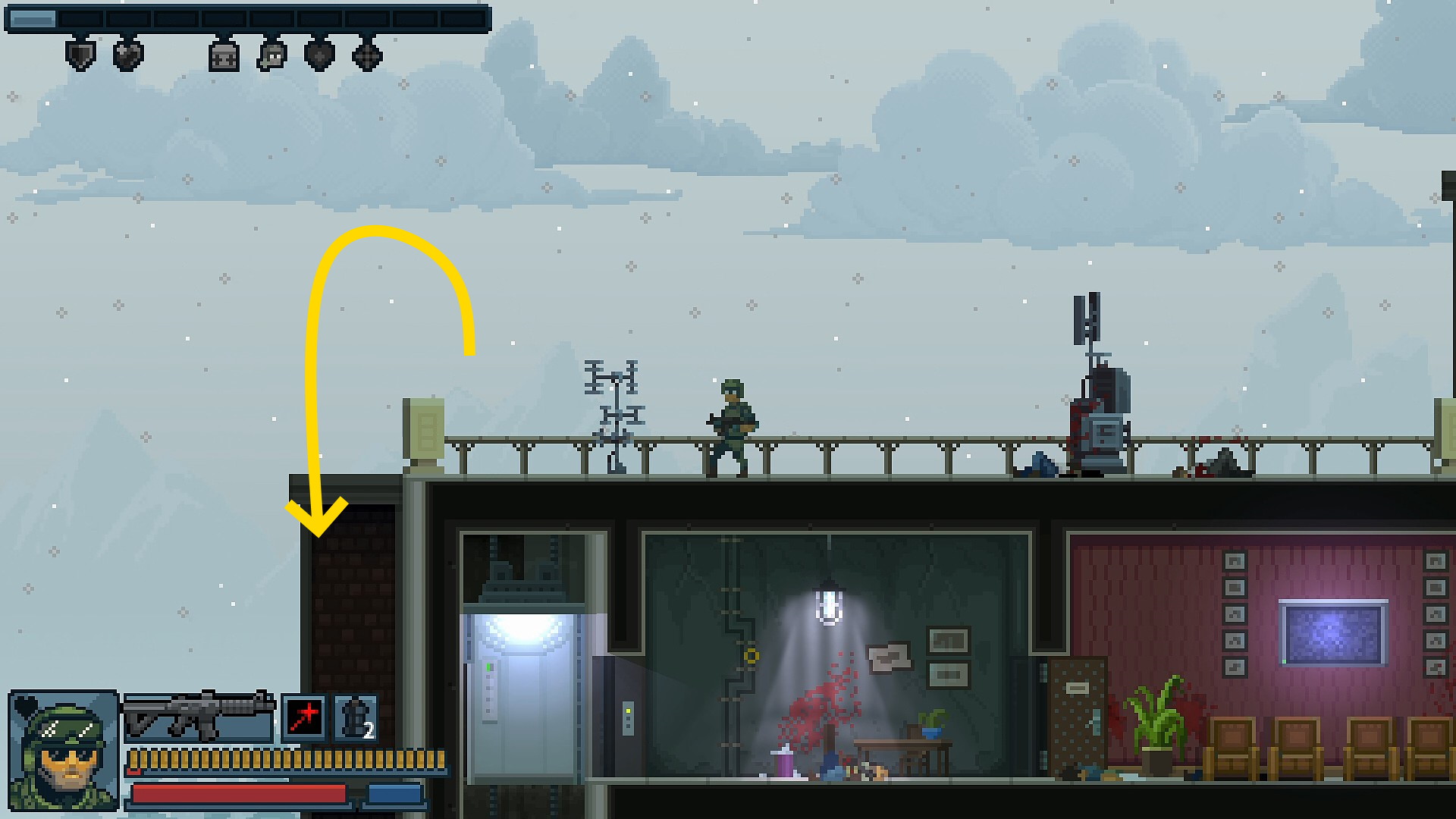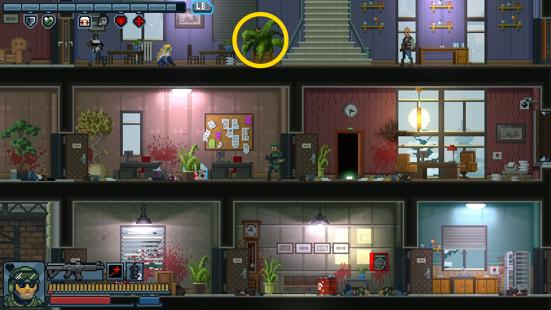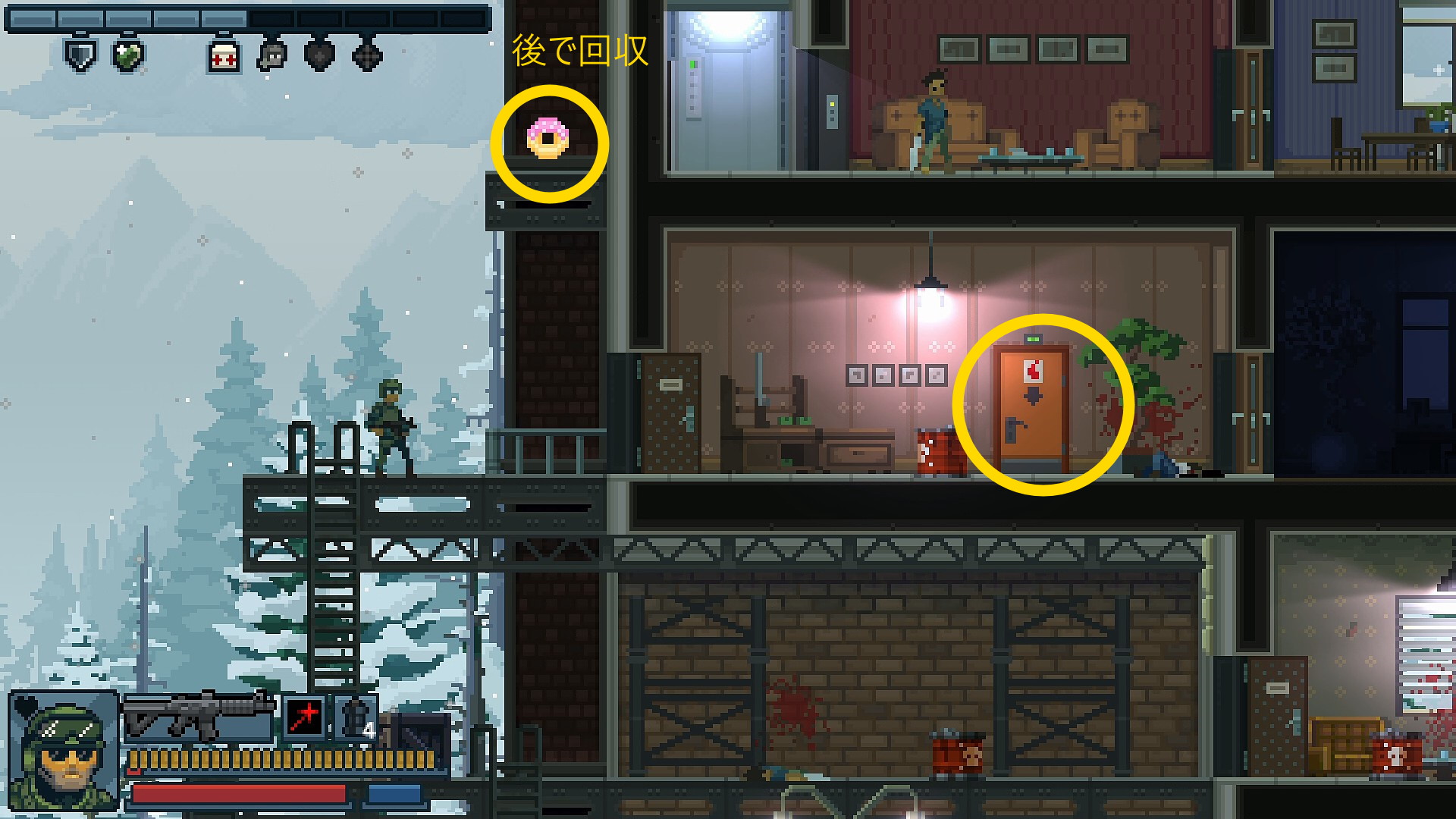 - 6階に戻り、ドアを開けて中にいるランボーらを始末し、人質を解放してクリア