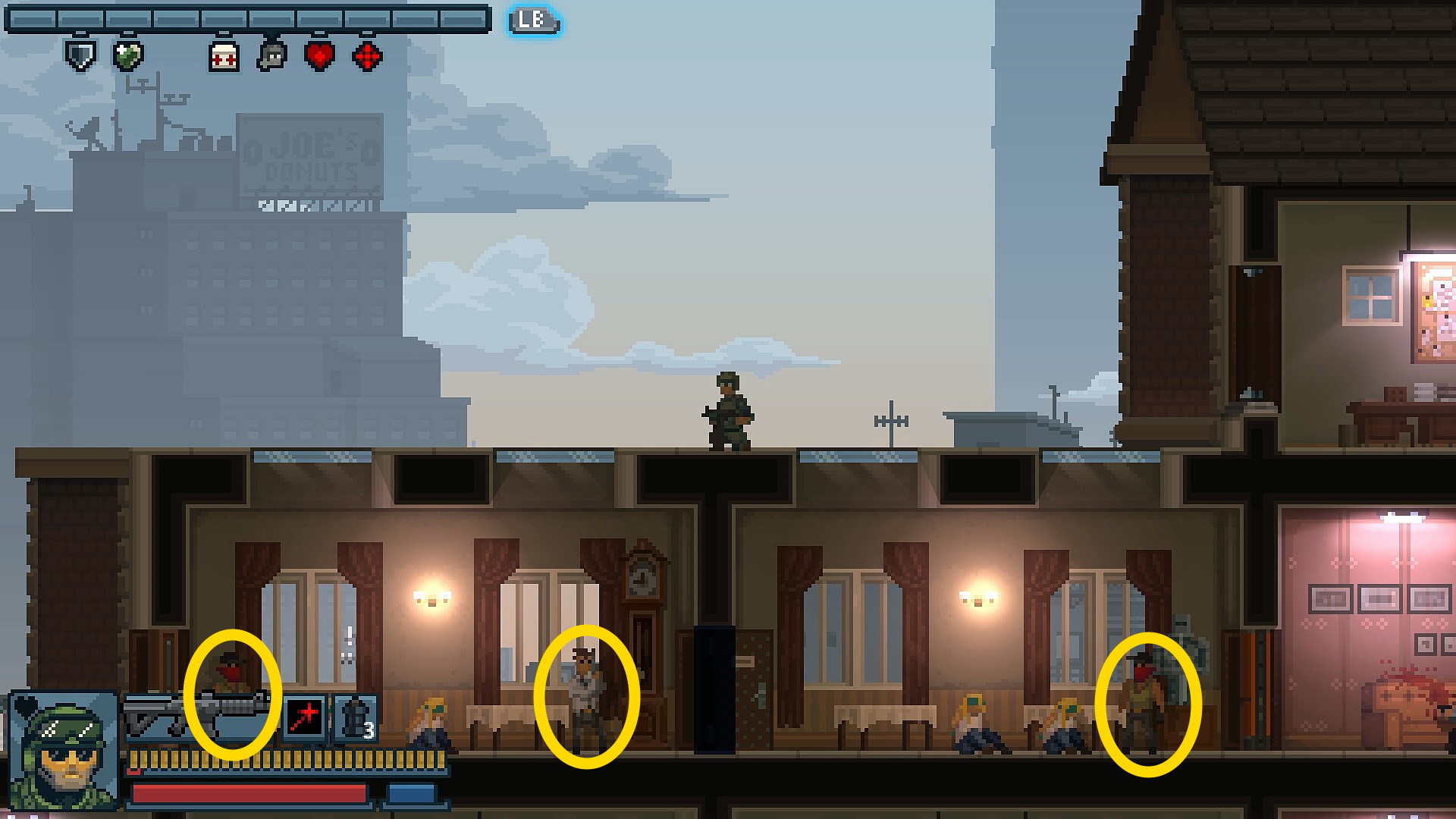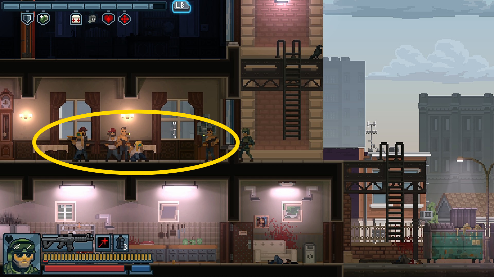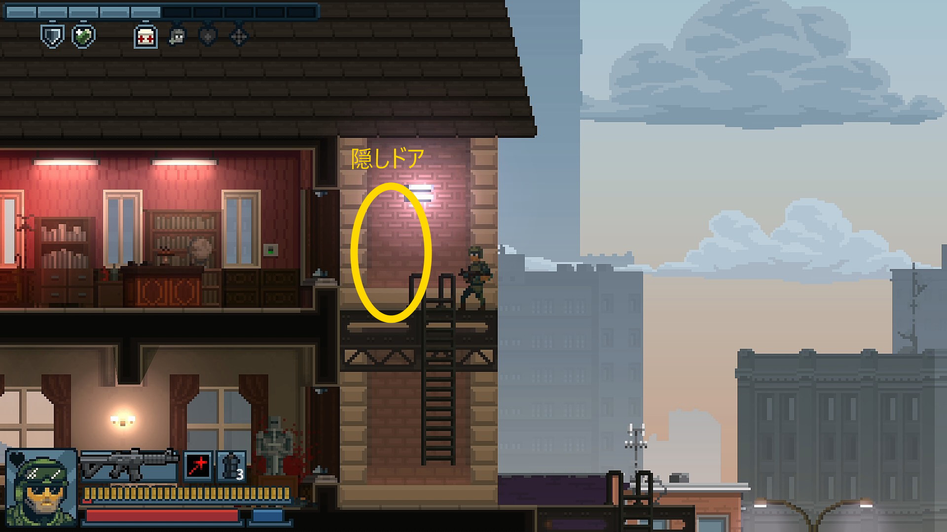 - 3階を制圧しながら2階左側の部屋の上に出る(ガラス天井でジャンプしないこと)