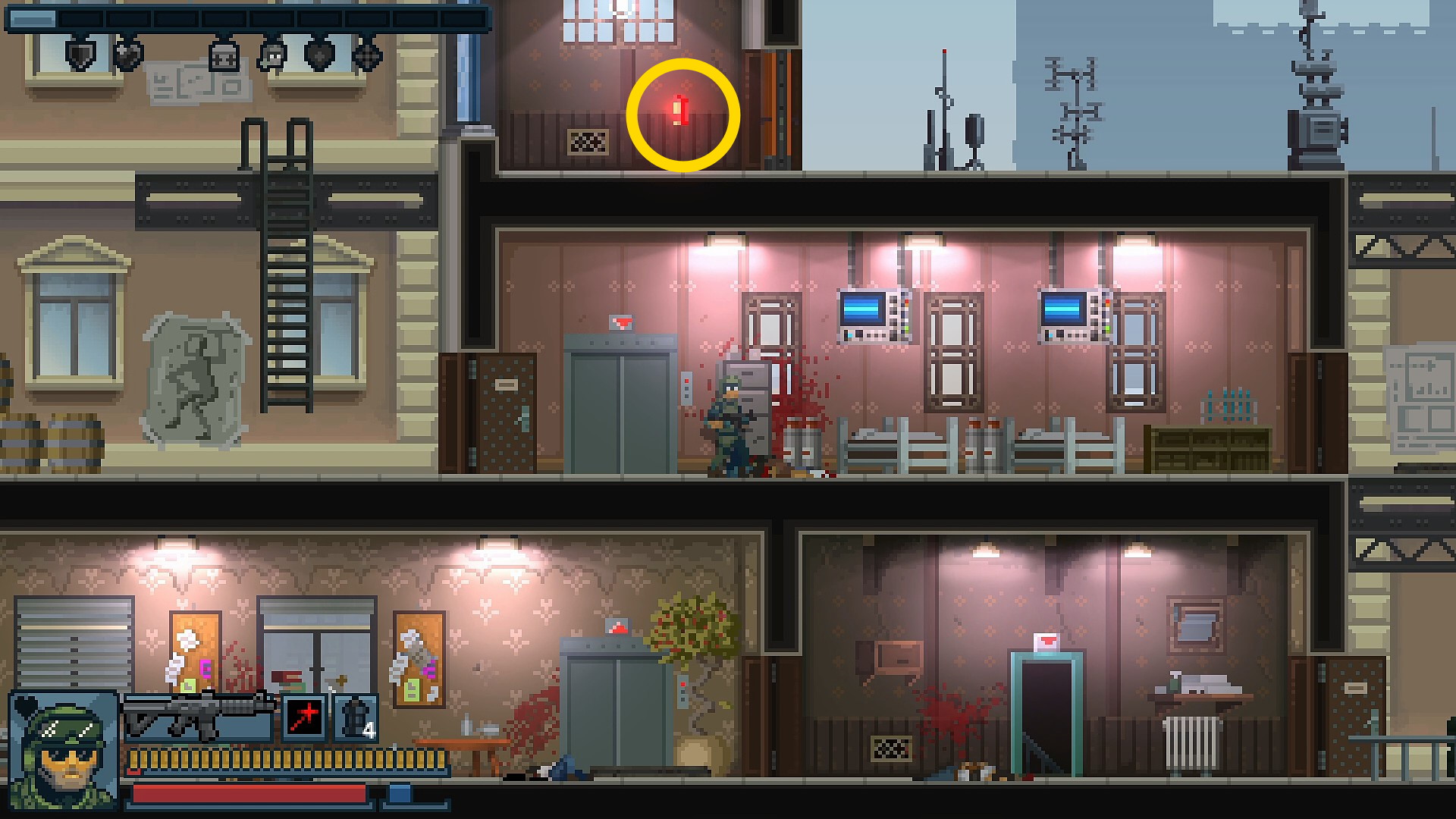 - 1階の緑の階段で上階へ進むが、上がったところにギャングがいる場合あり