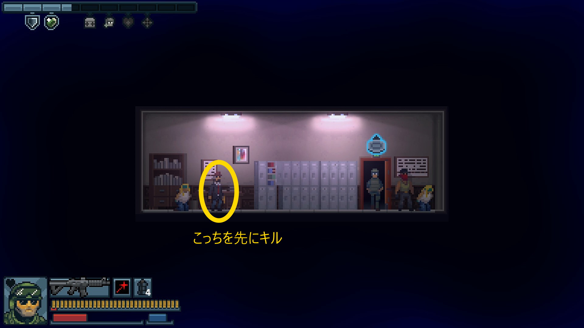 - ドアの向こうにはハットとギャングがいるが、左にいるハットを先にキルしないと盾にされて人質を殺害してしまう恐れがある