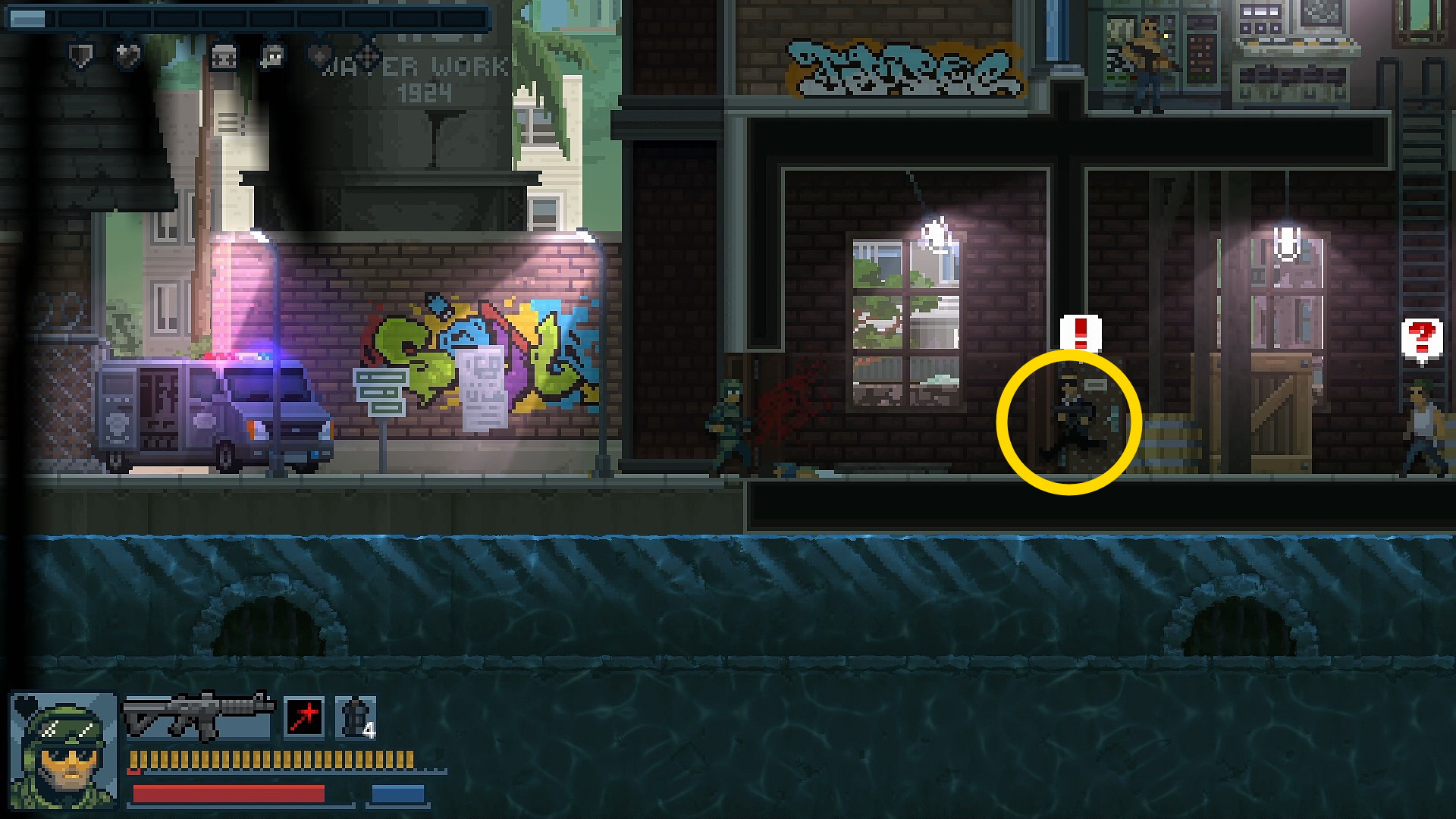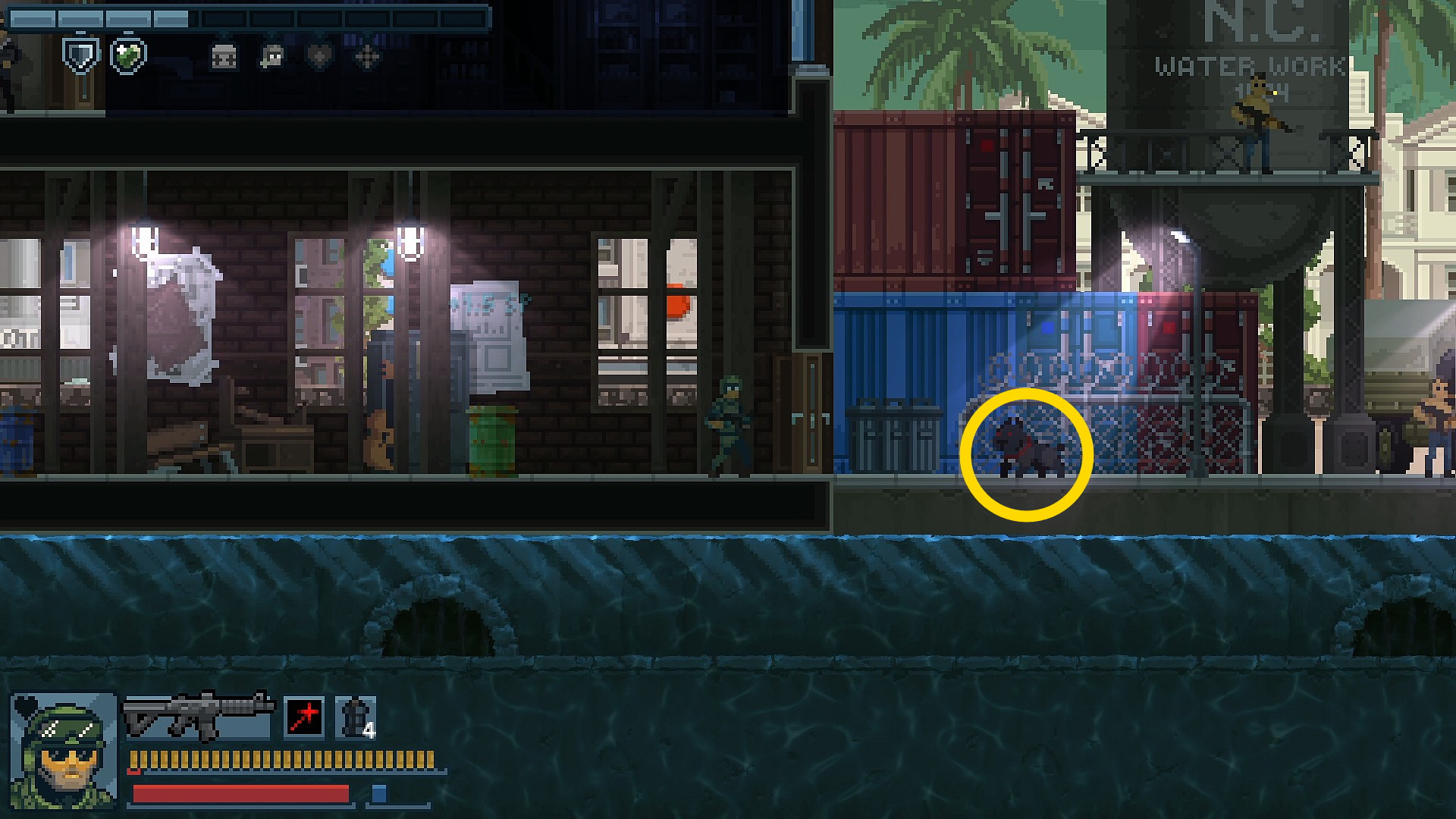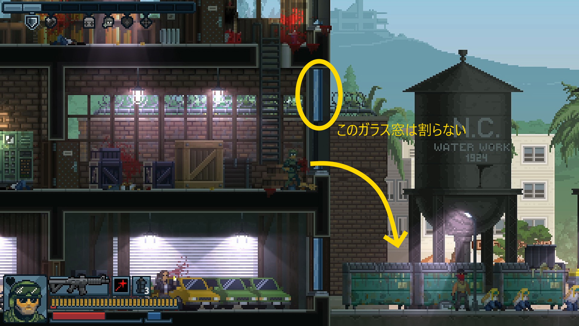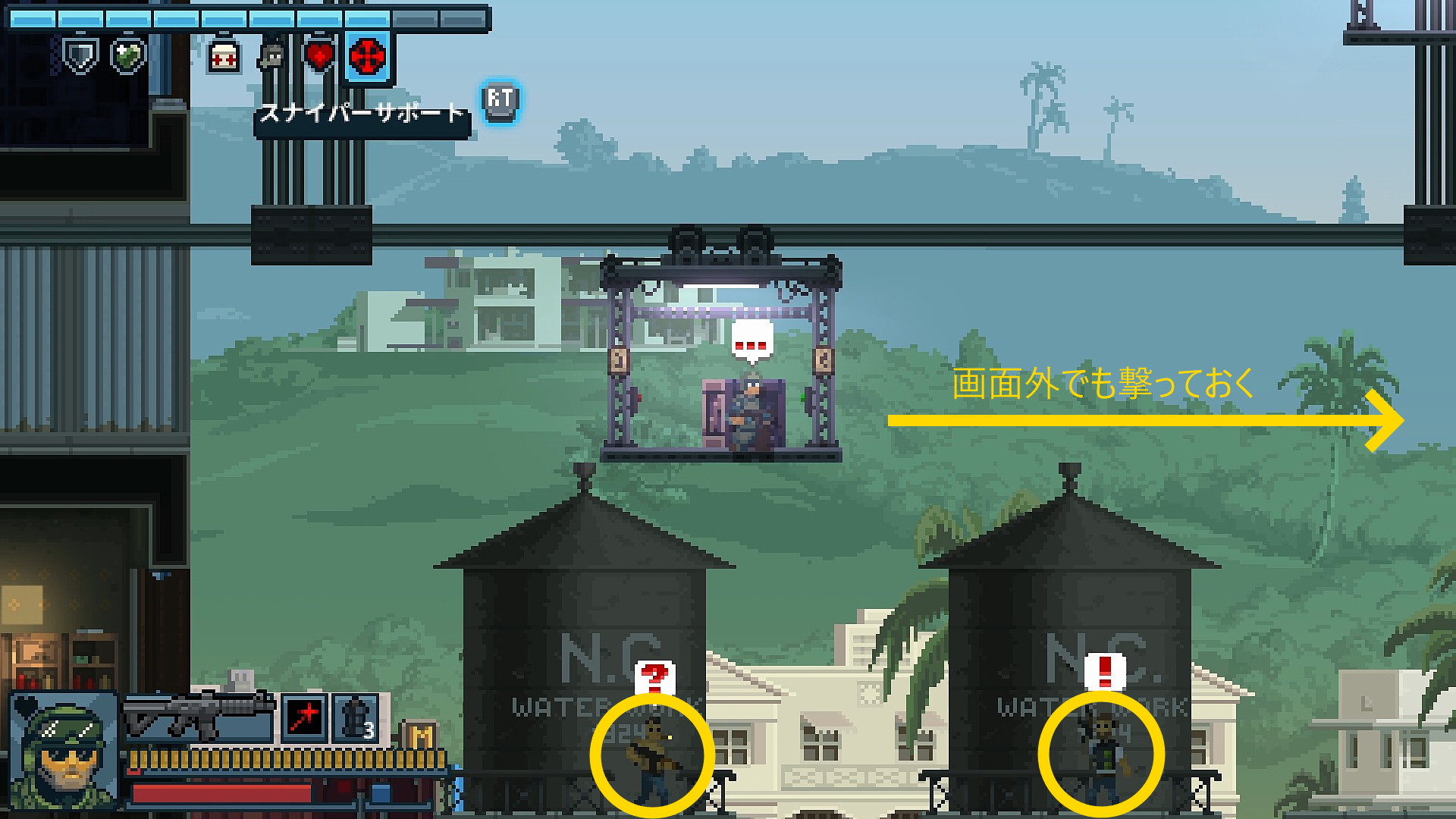 - 眼下の給水塔にいる防弾チョッキ2人および向こう側(右の建物)にいる防弾チョッキ改に攻撃されるので注意