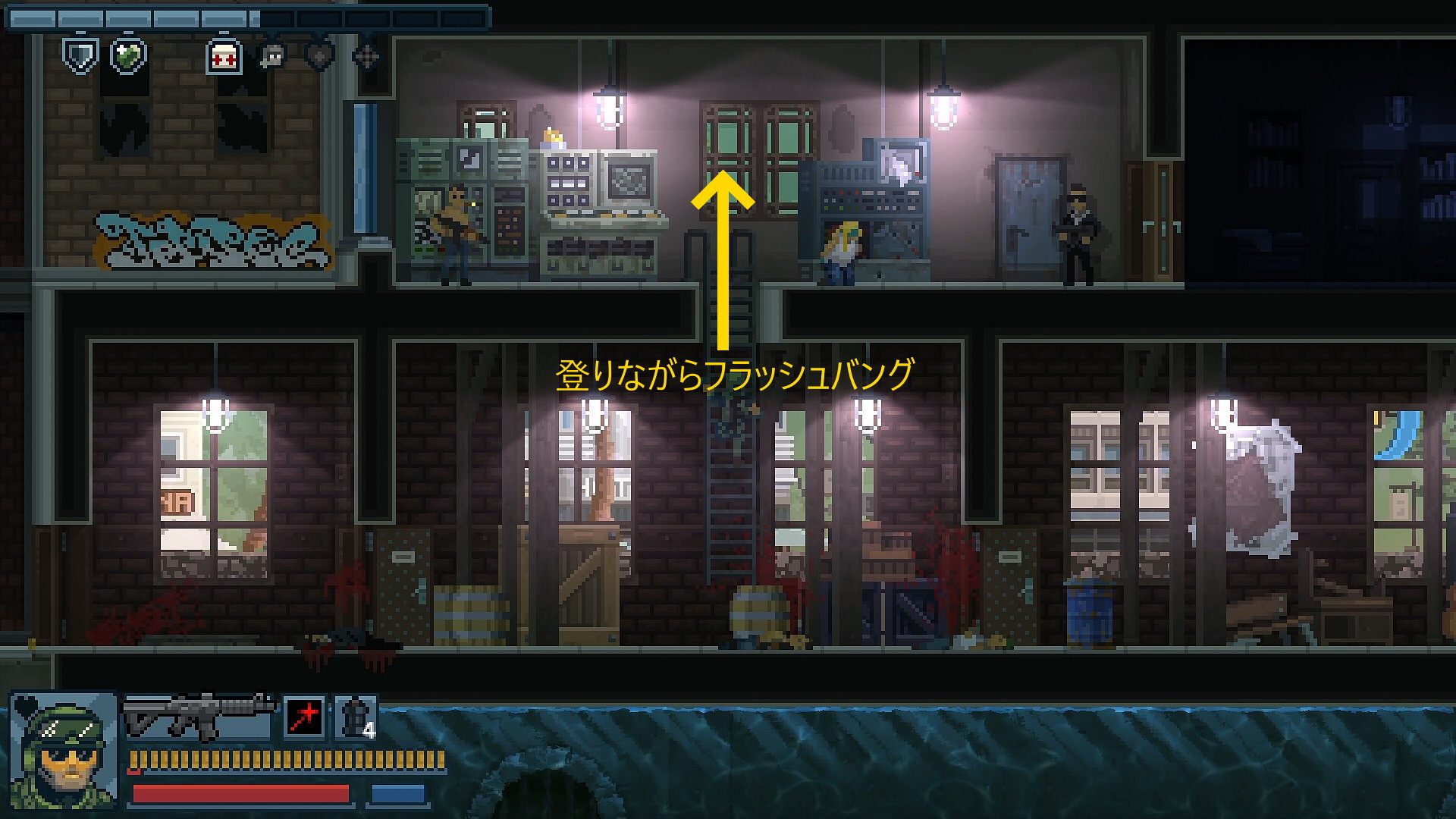 - 最初の建物のはしごを登り、黒服とランボーをキルして右に進むしかない(はしごを登りながらフラッシュバングがおすすめ)