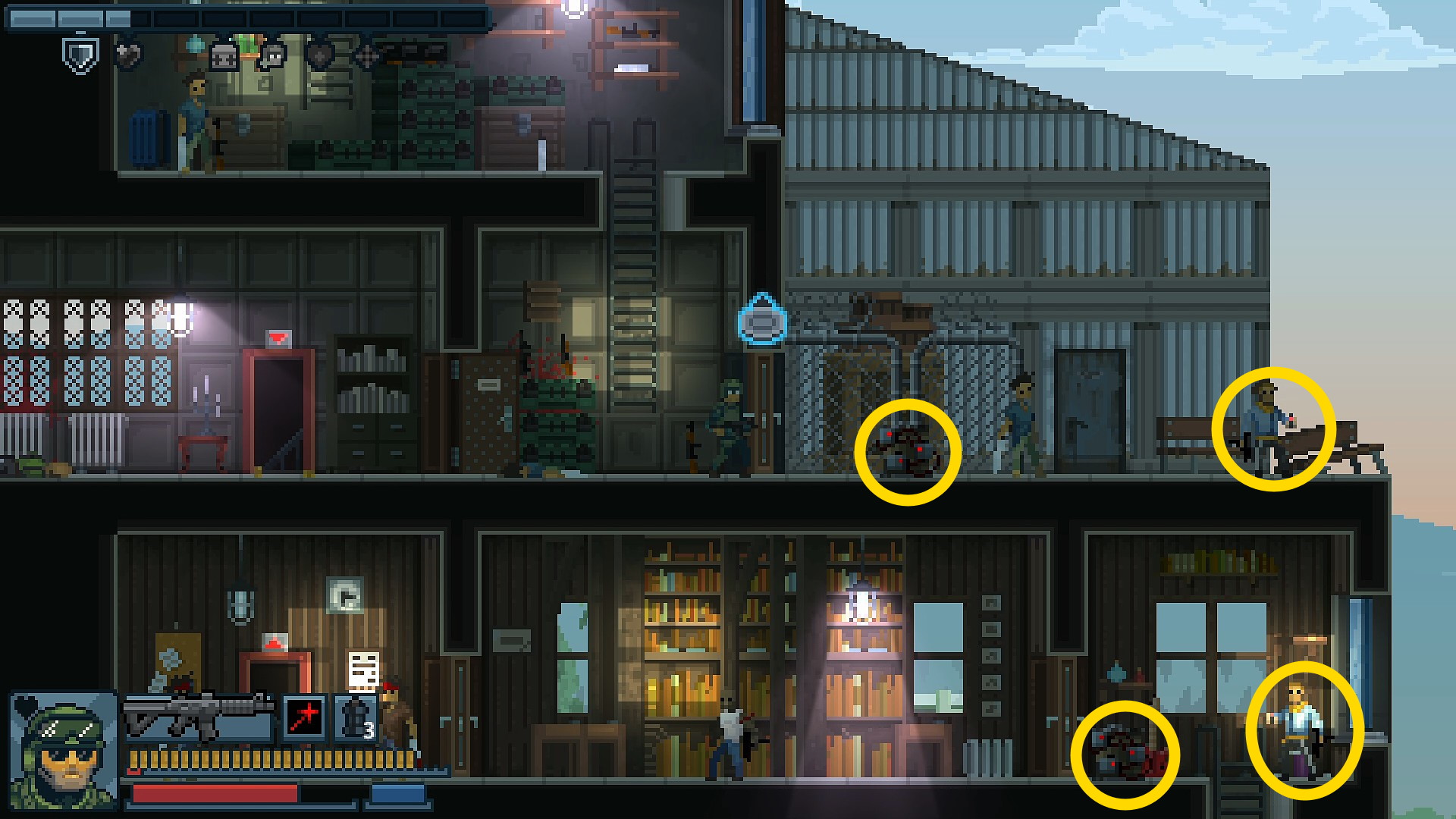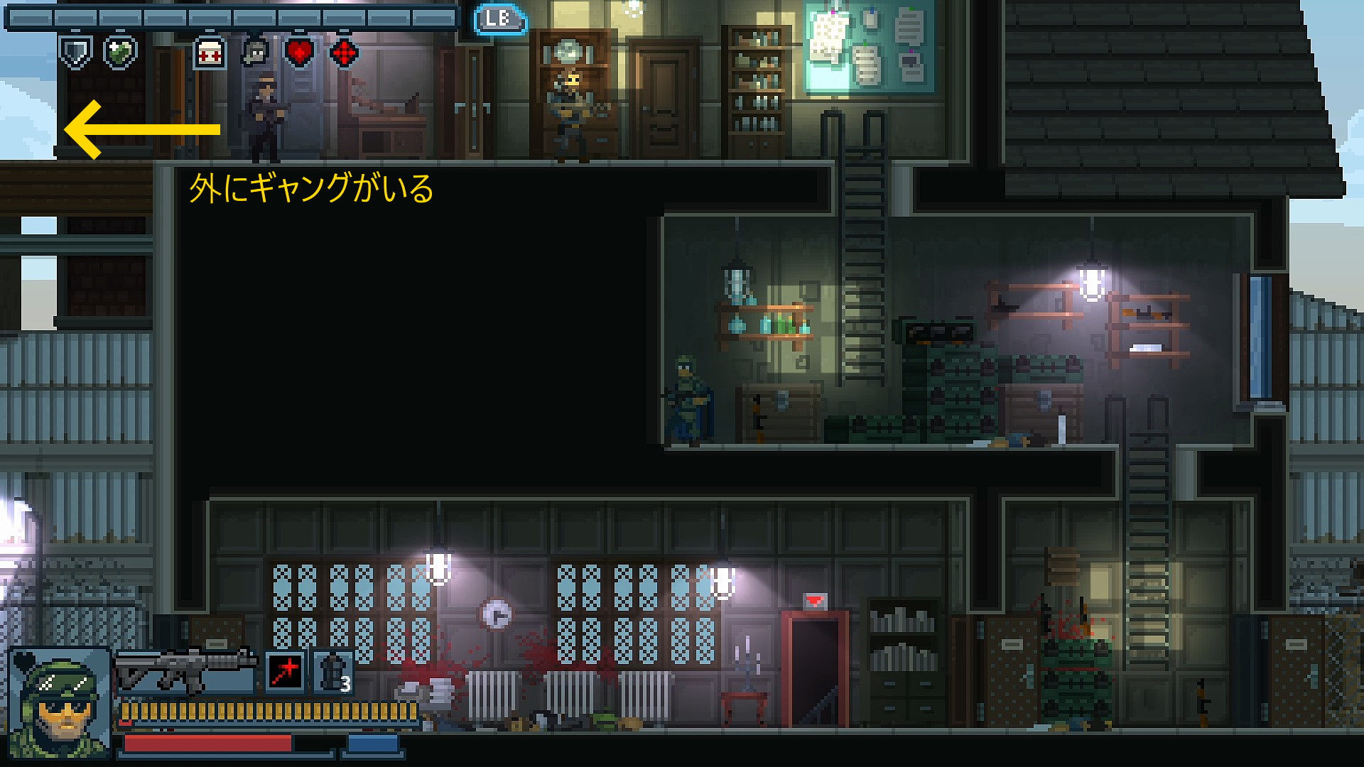 - 1階右端にギャングと人質が見える