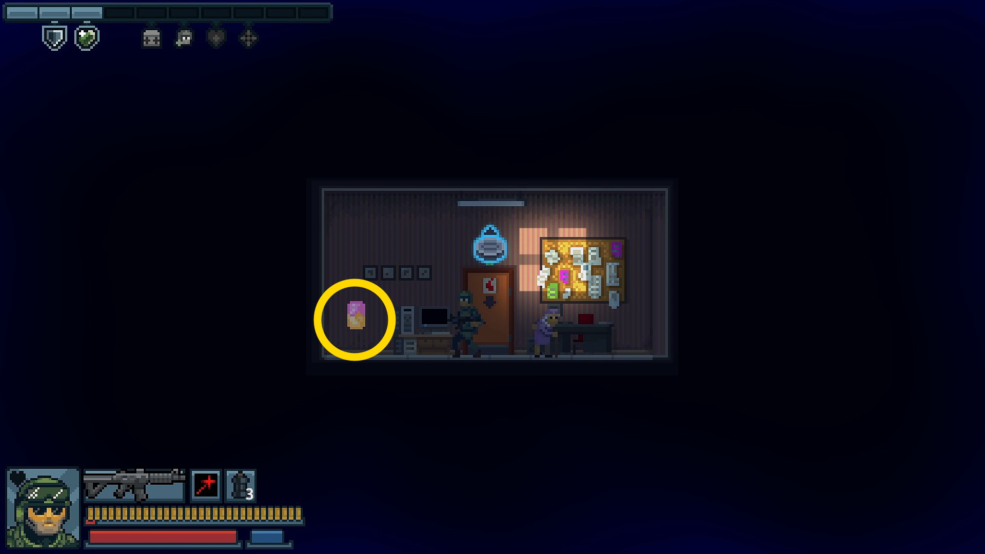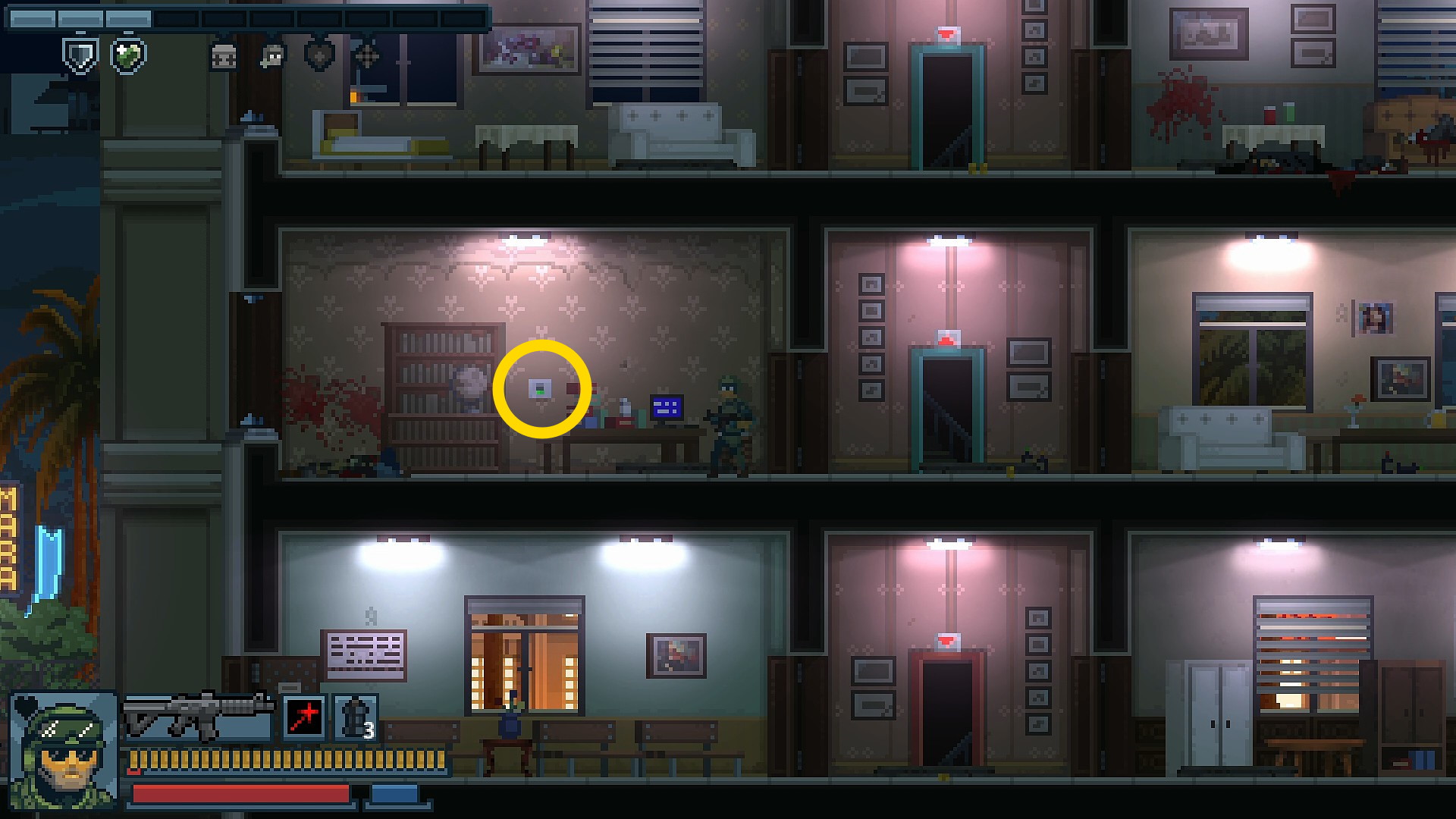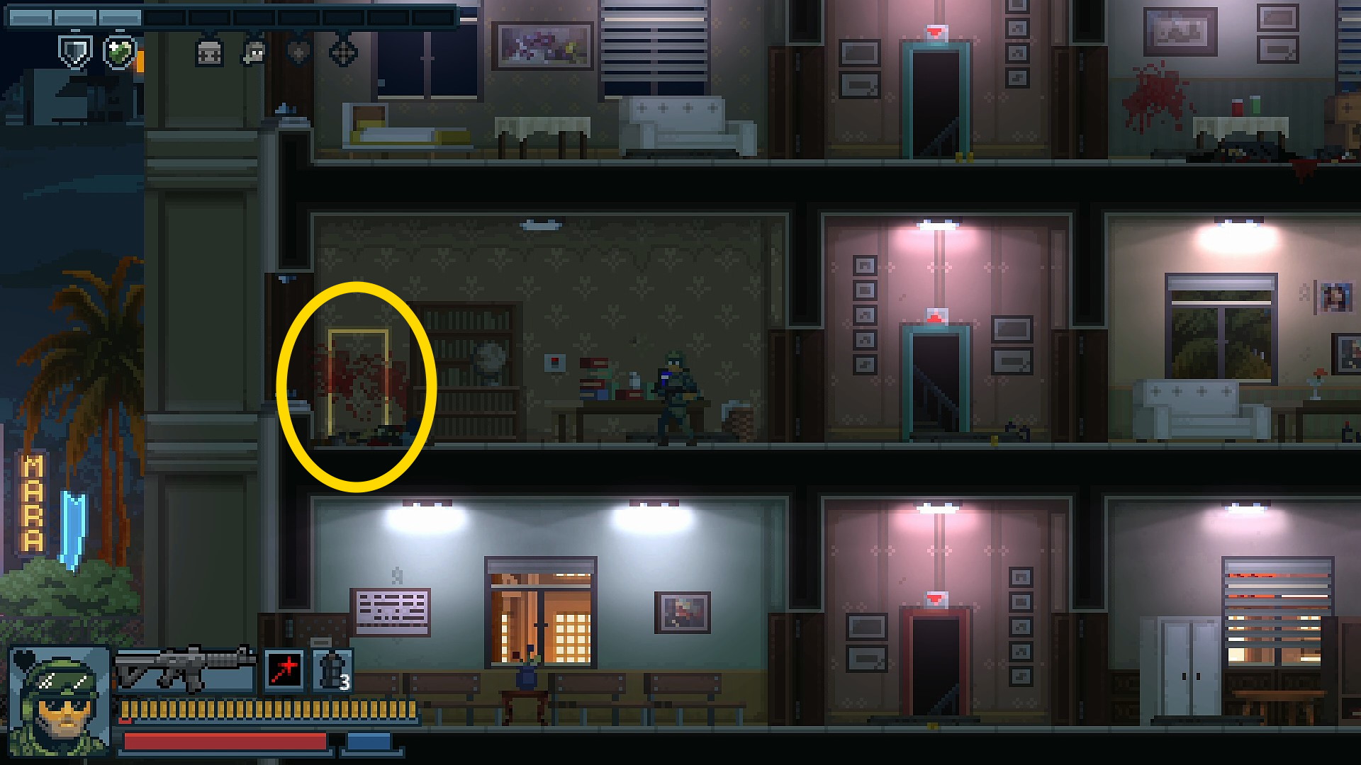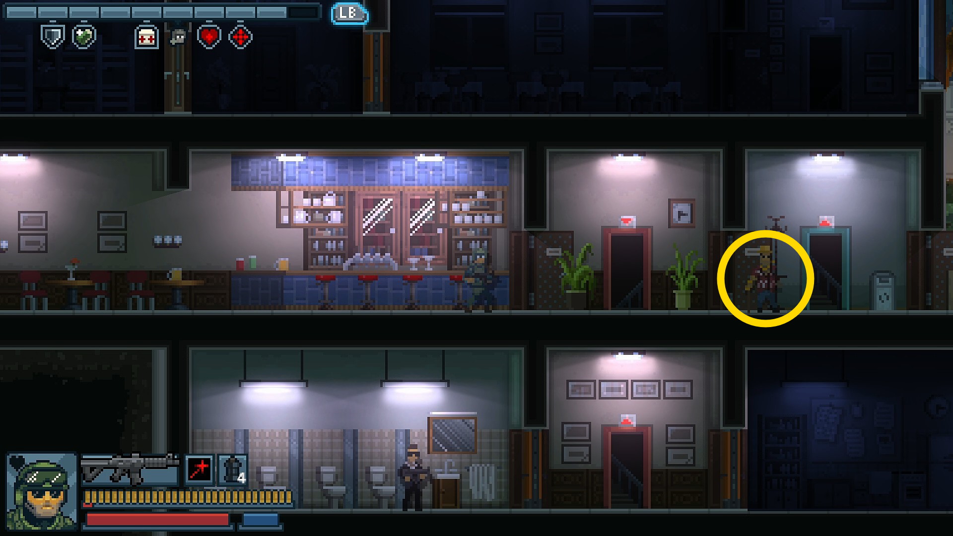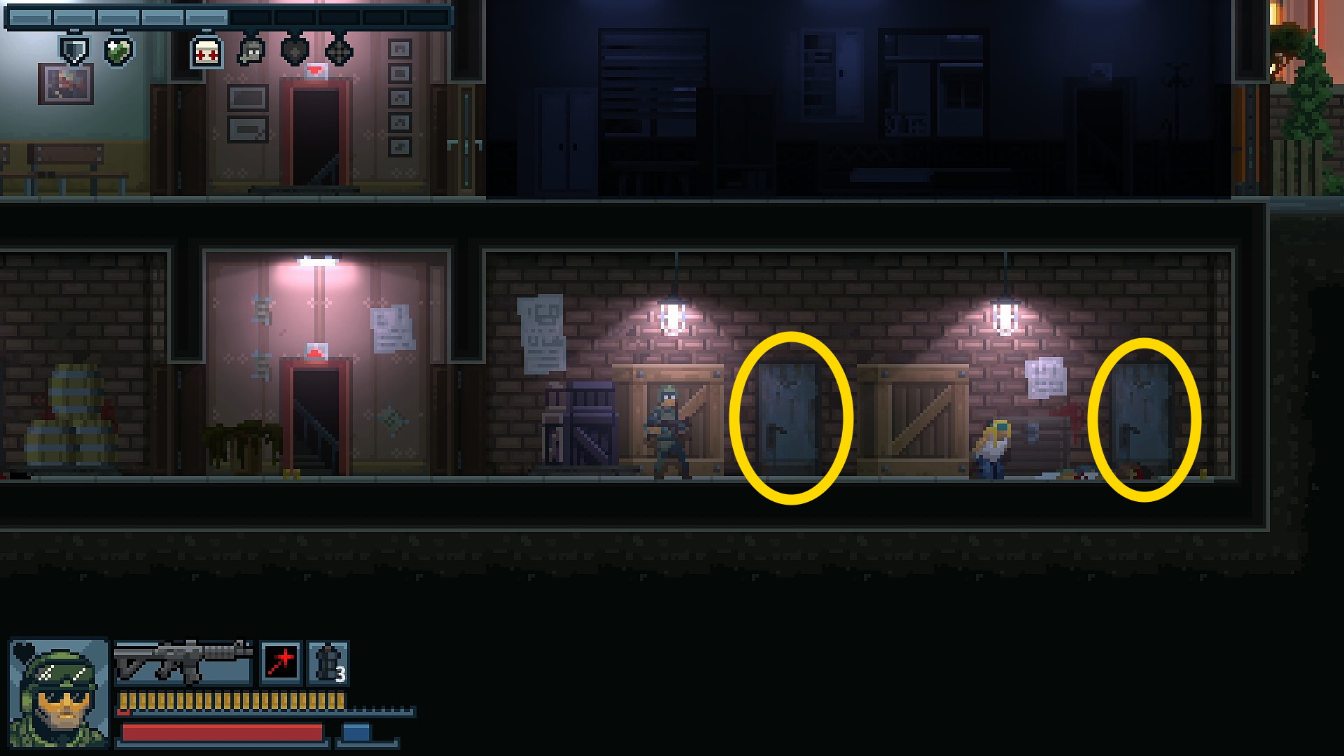 - 地下の右端の部屋には人質がいるが、スチール製のドア(両方)から敵が1人ずつ出てくる