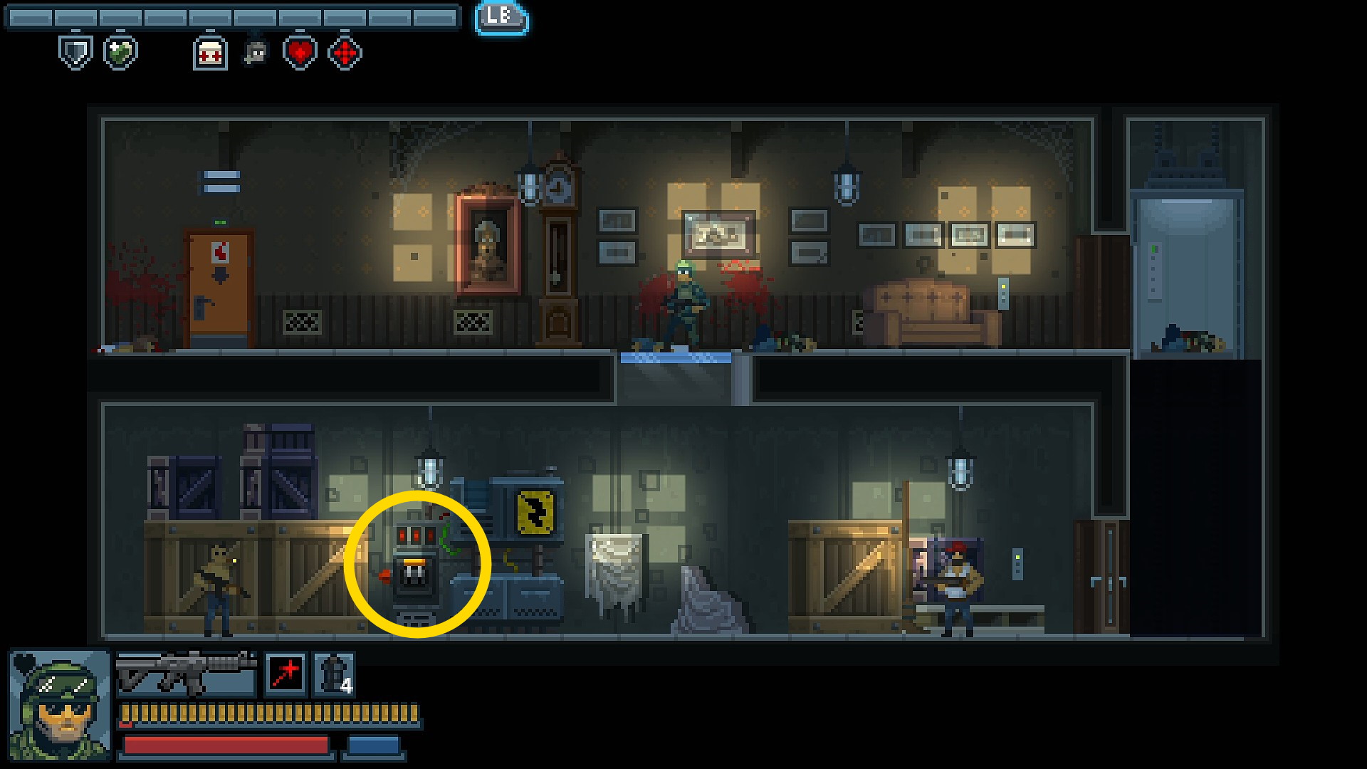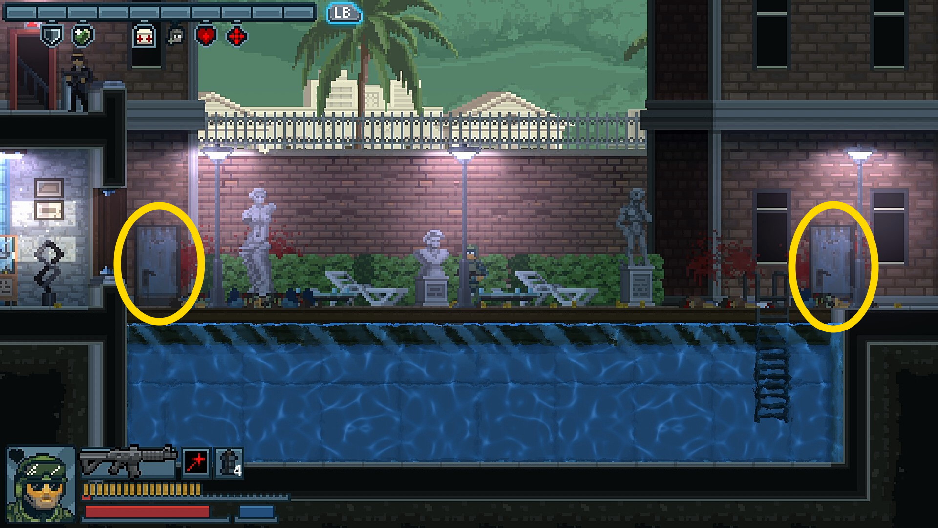 - 電源を入れた帰り、プールのところにスチール製のドアが左右にあり、そこからナイフ持ち、ナタ持ち、ボマーが多数出てくるので弾切れに注意