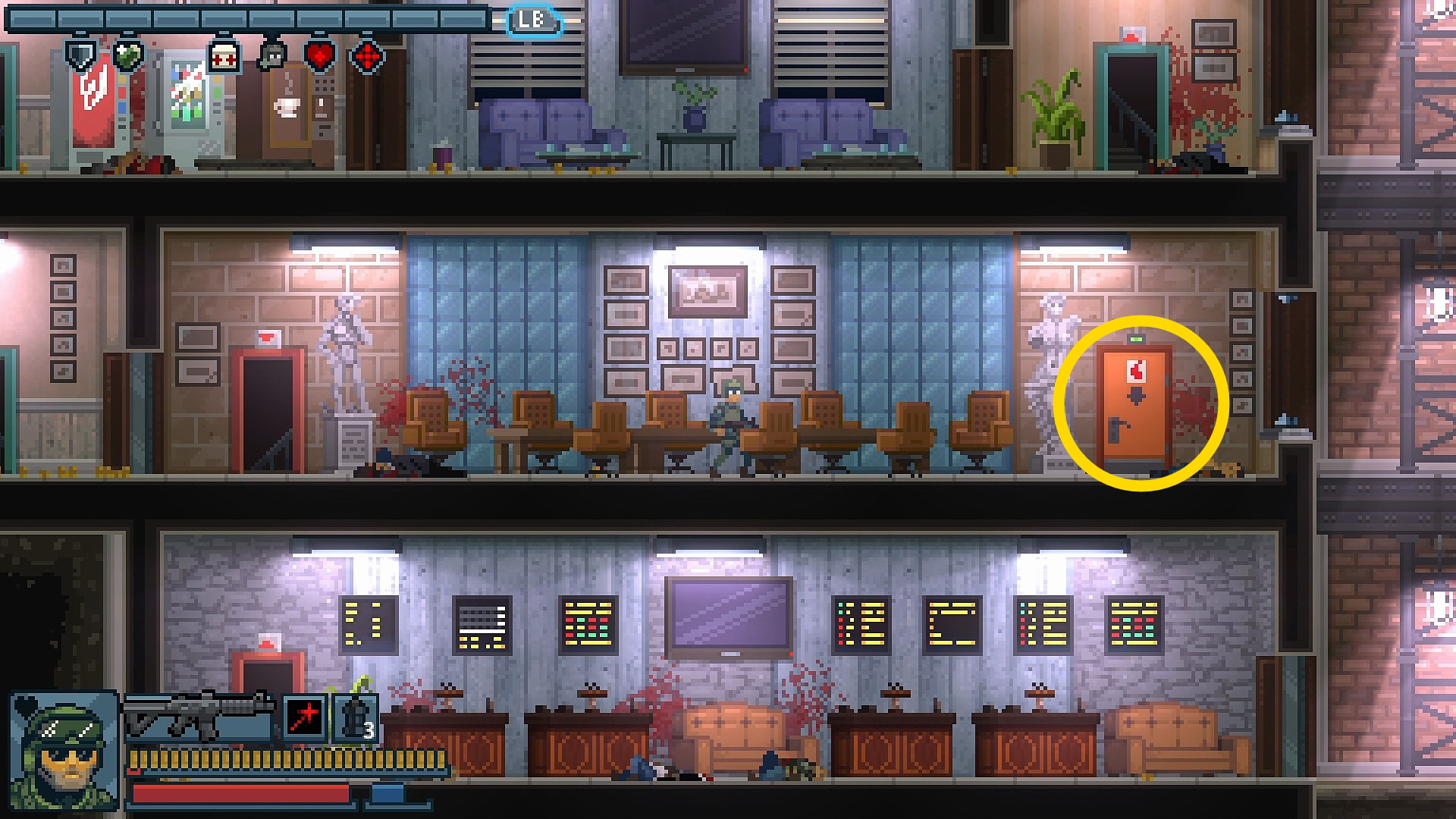 - 開始地点、右側のガラスドアはカードキーで開くが、このステージにはカードキーは配置されていない
