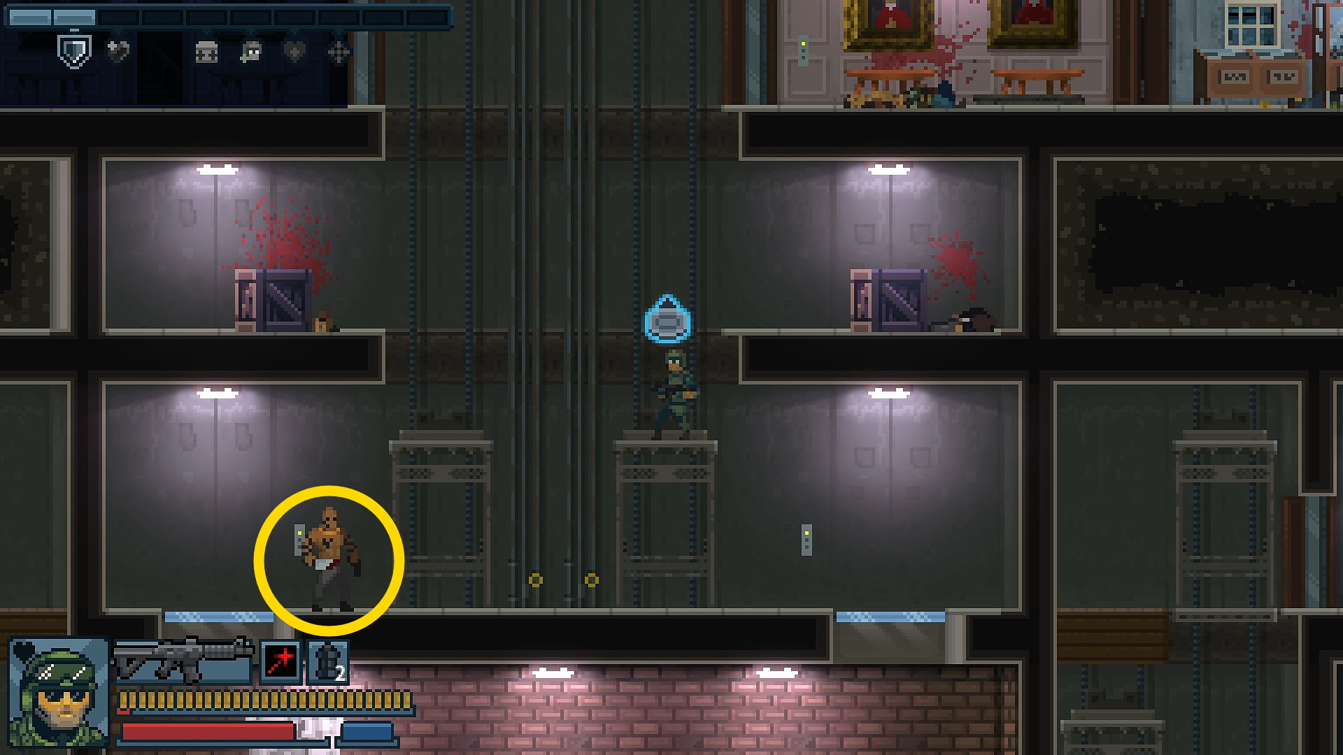 • 建物に入り、エレベーターで降下するとナイフと銃を持った新敵がいる(以降、スキンヘッド)