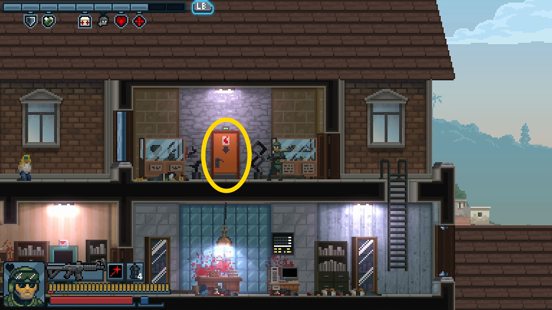 - 1階右端でカードキーを使って侵入し、地下の各部屋を制圧してまわる