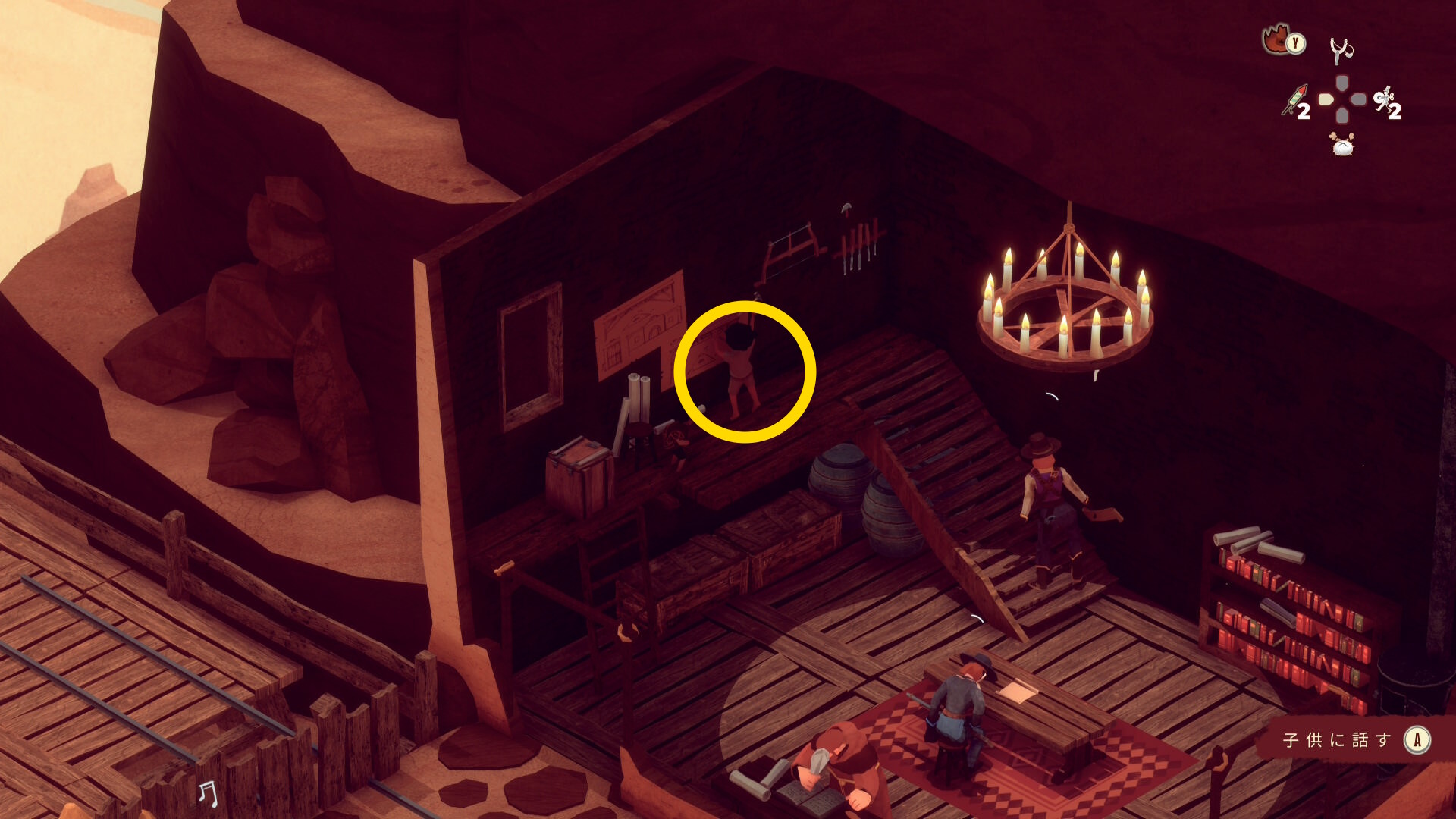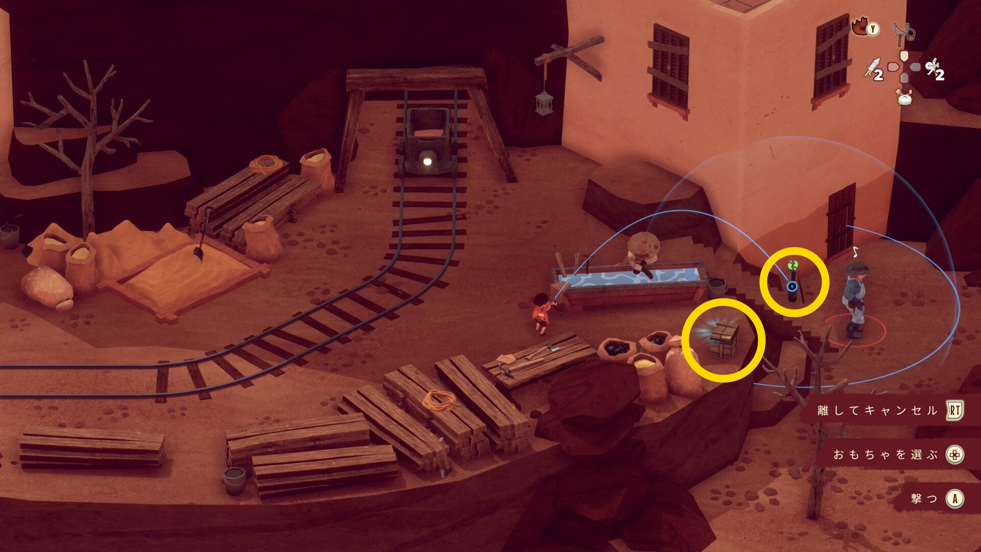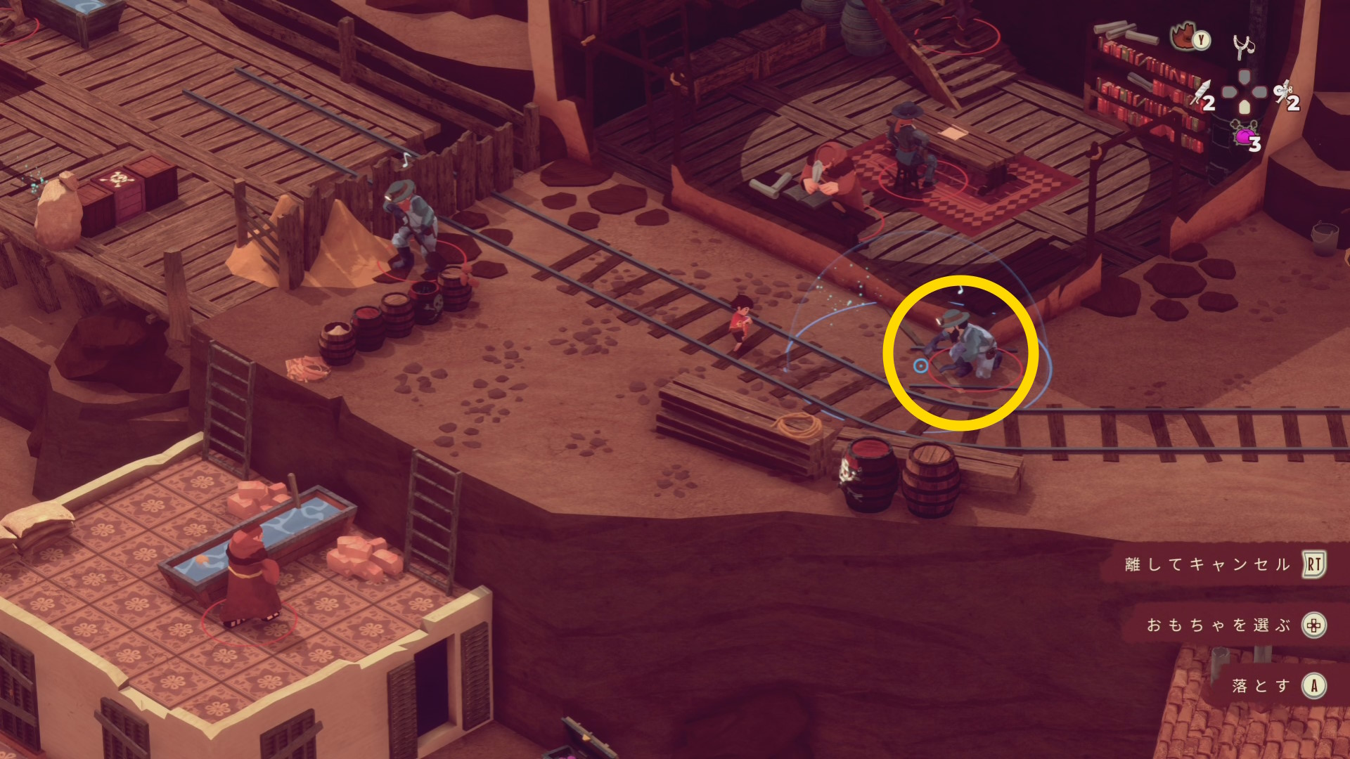- 上に戻り、しゃがんで作業している鉱夫に サボテンを投げる(カウント稼ぎ)