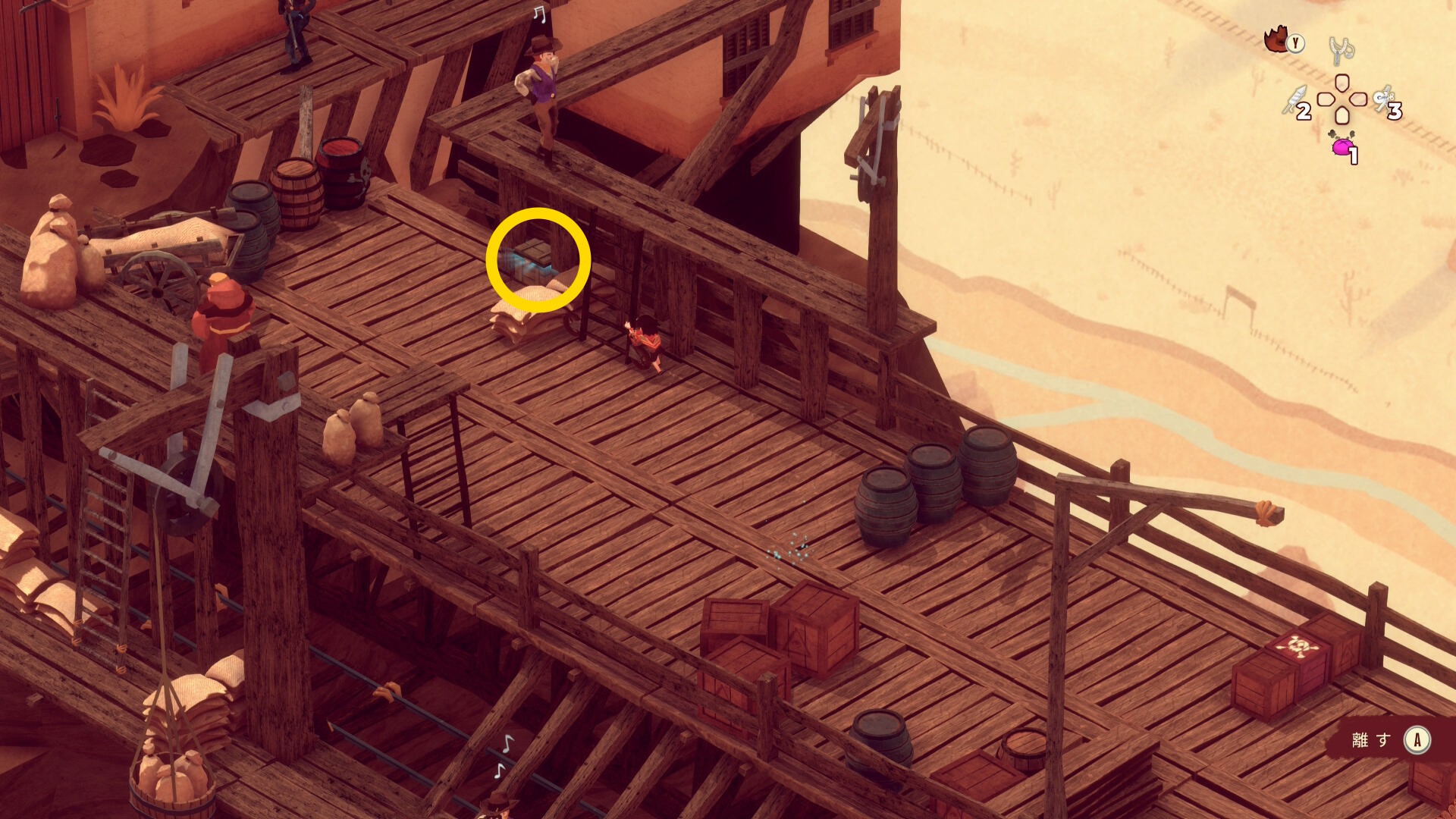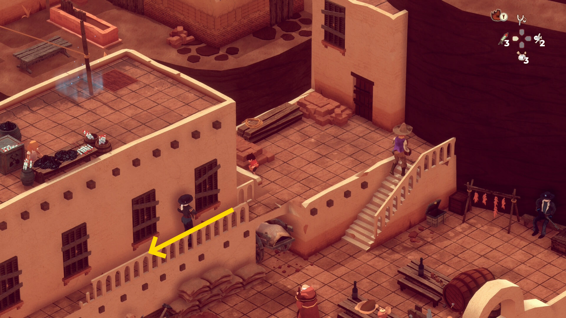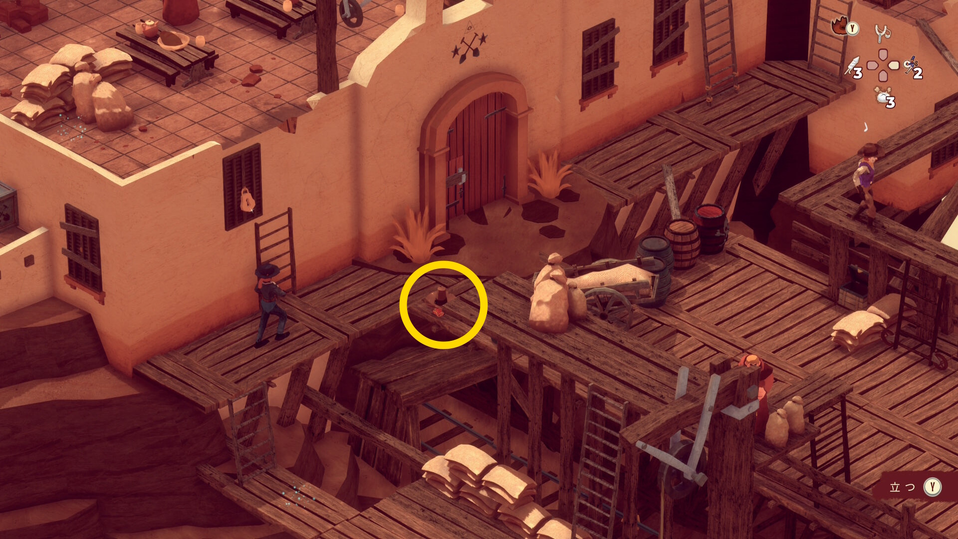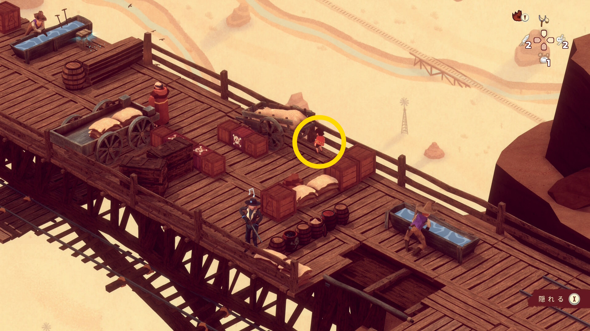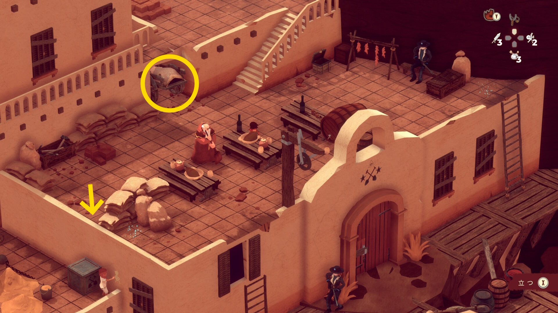 - レンガ運びの盗賊が戻ってくるのでソンブレロに隠れる or 荷車まで戻って隠れる(当サイト的にはソンブレロを推奨)