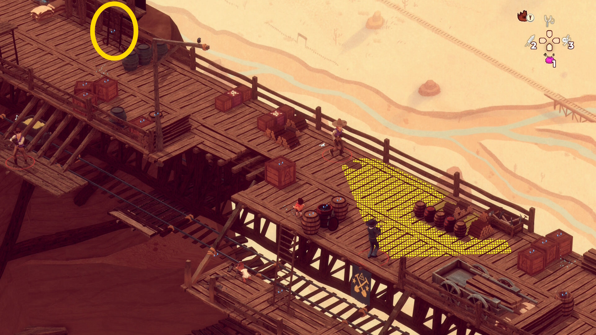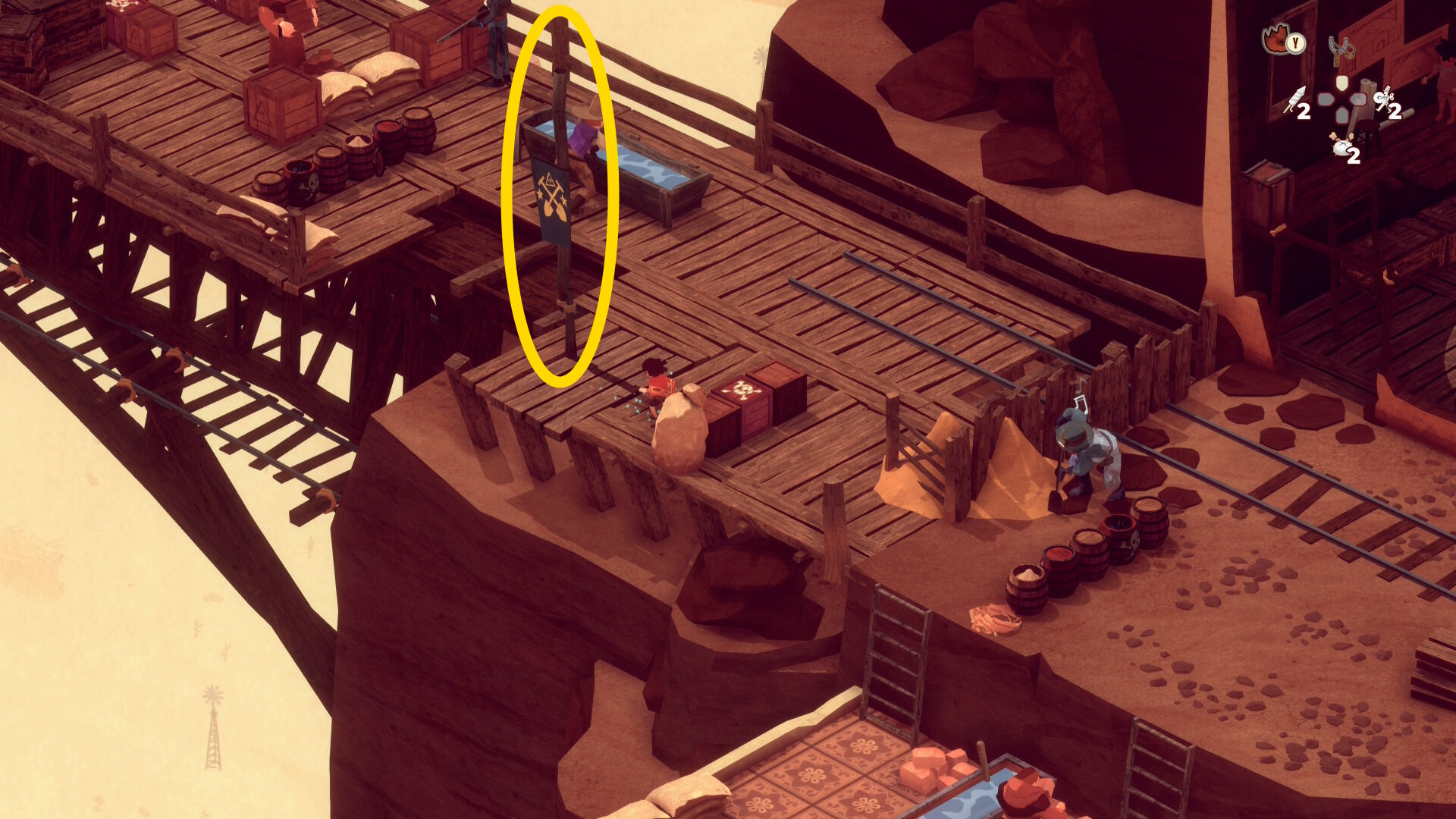 - 左の銃兵が上に戻ったときに盗賊の後ろにある木箱に花火を発射