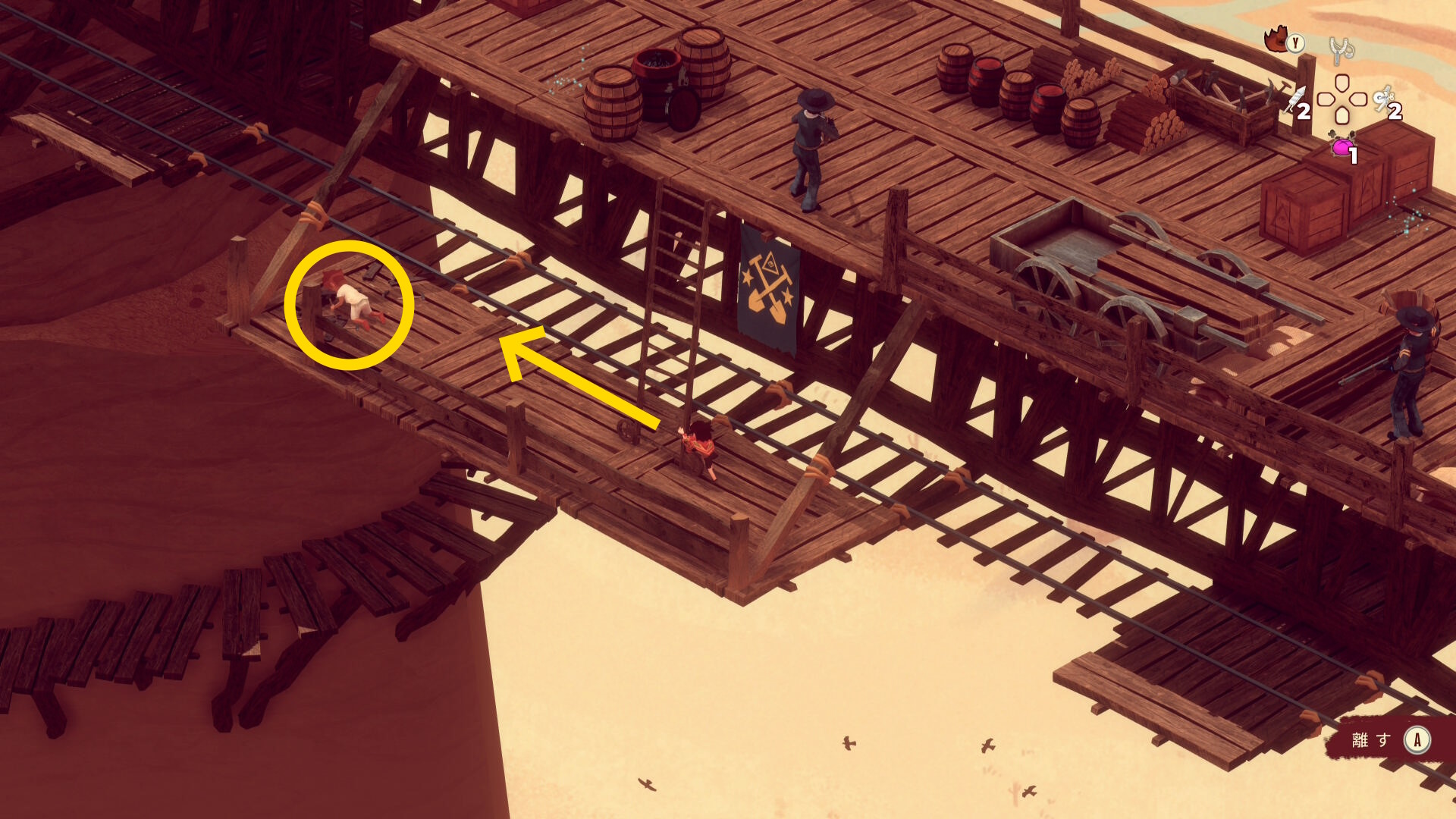- 盗賊が気絶している間に壊れた木箱のところから一本橋を渡るが、左の銃兵が下に移動し始めるまで渡りきらないこと