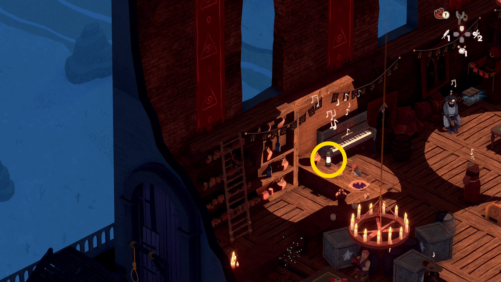 - ハシゴを下りてランタンをぱちんこで壊す