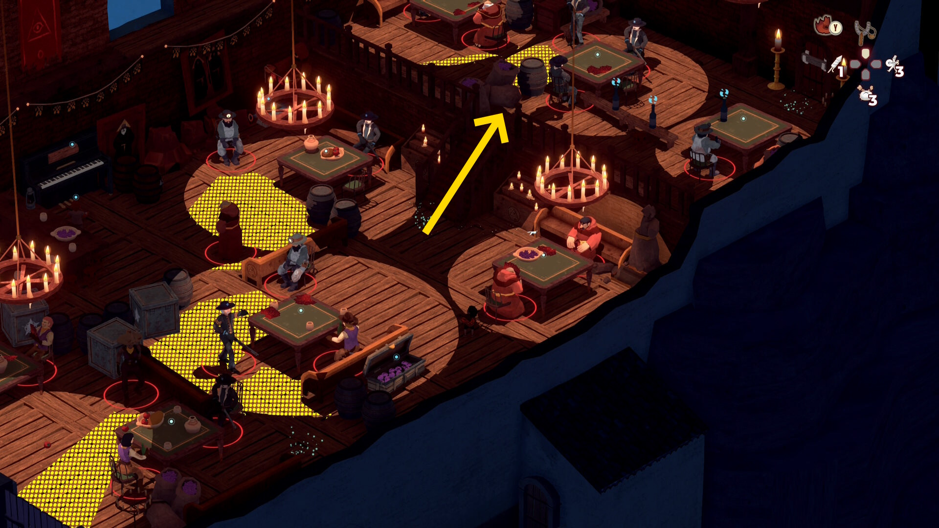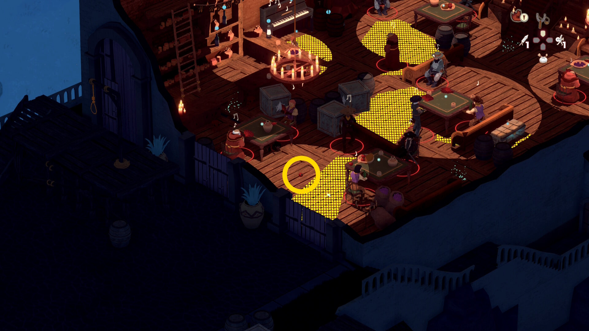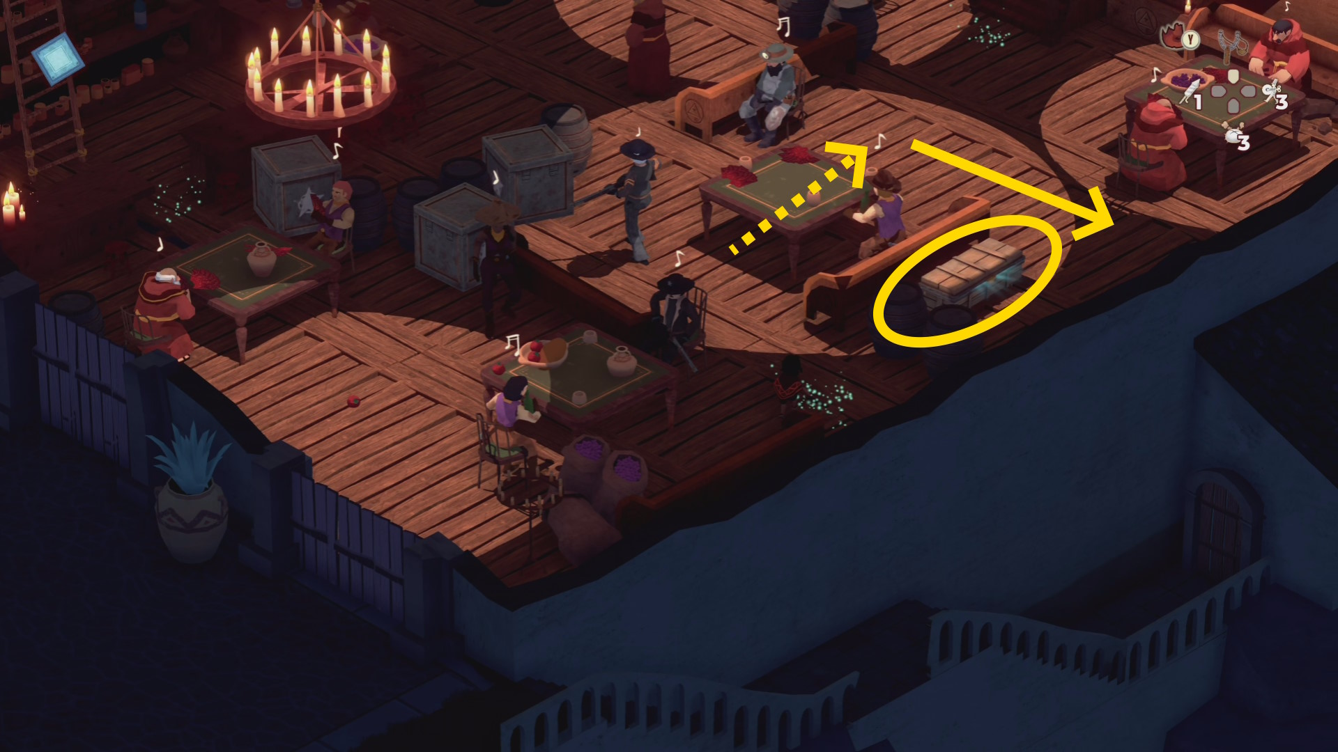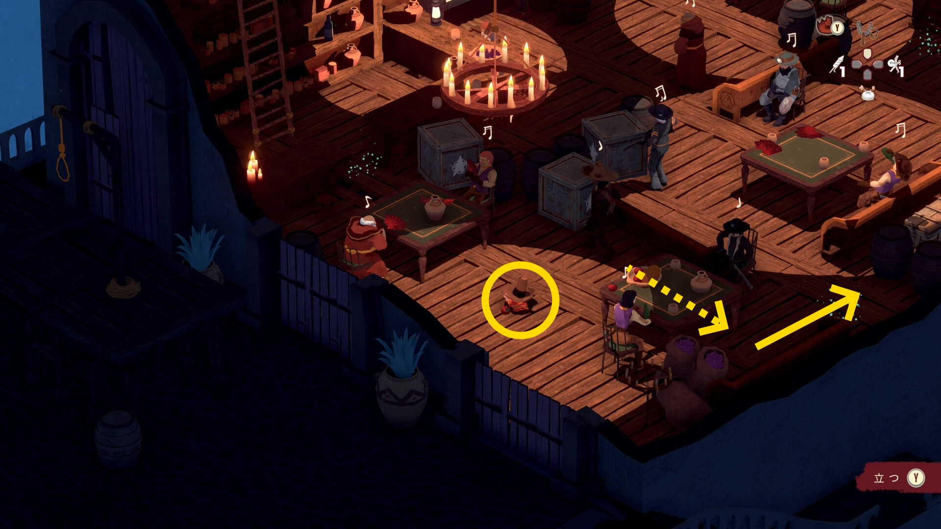 - 銃兵と修道士を同時に気絶させつつ木箱を破壊することも可能だが、うまくいく確率が低いので木箱だけ破壊する
