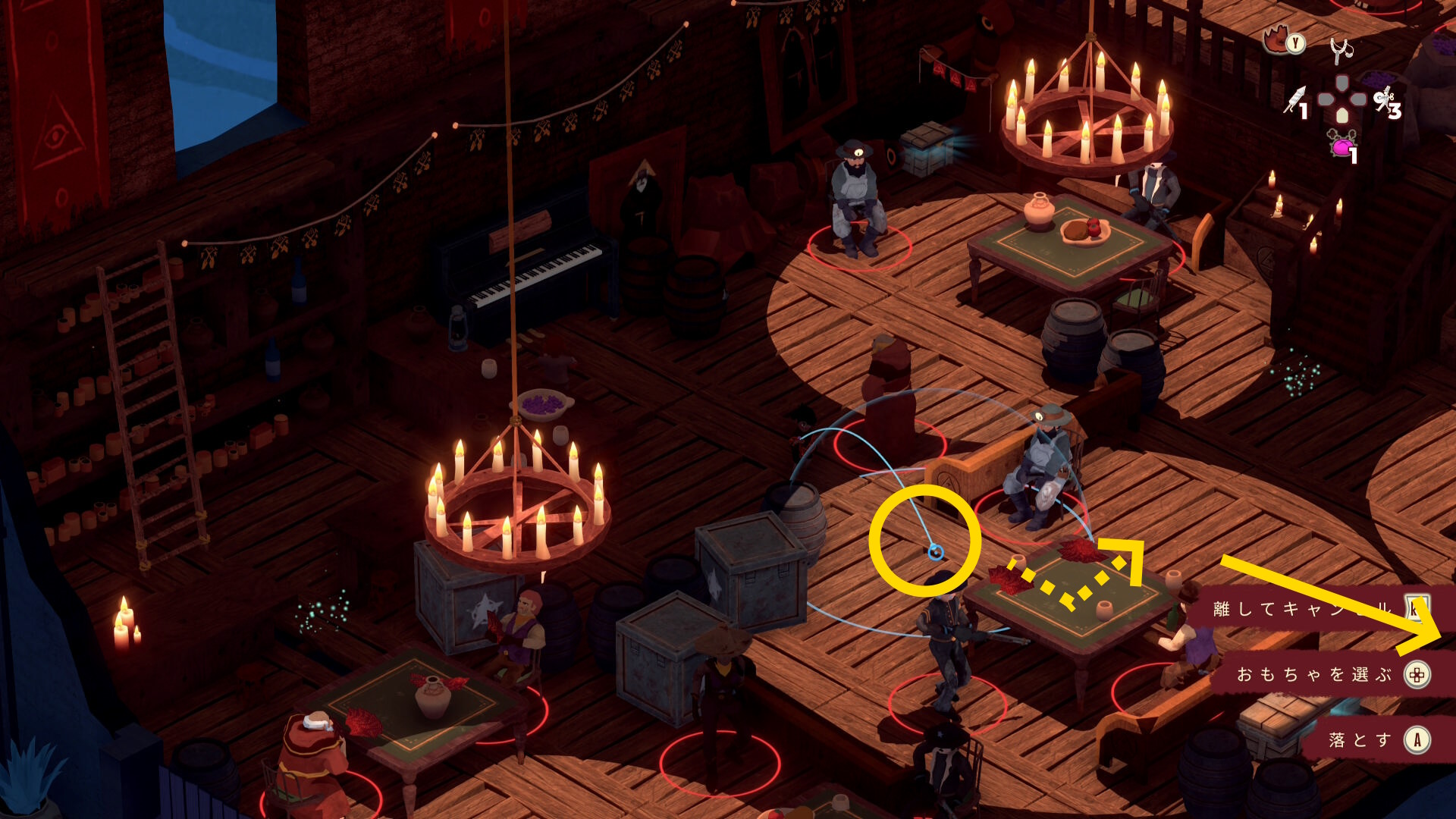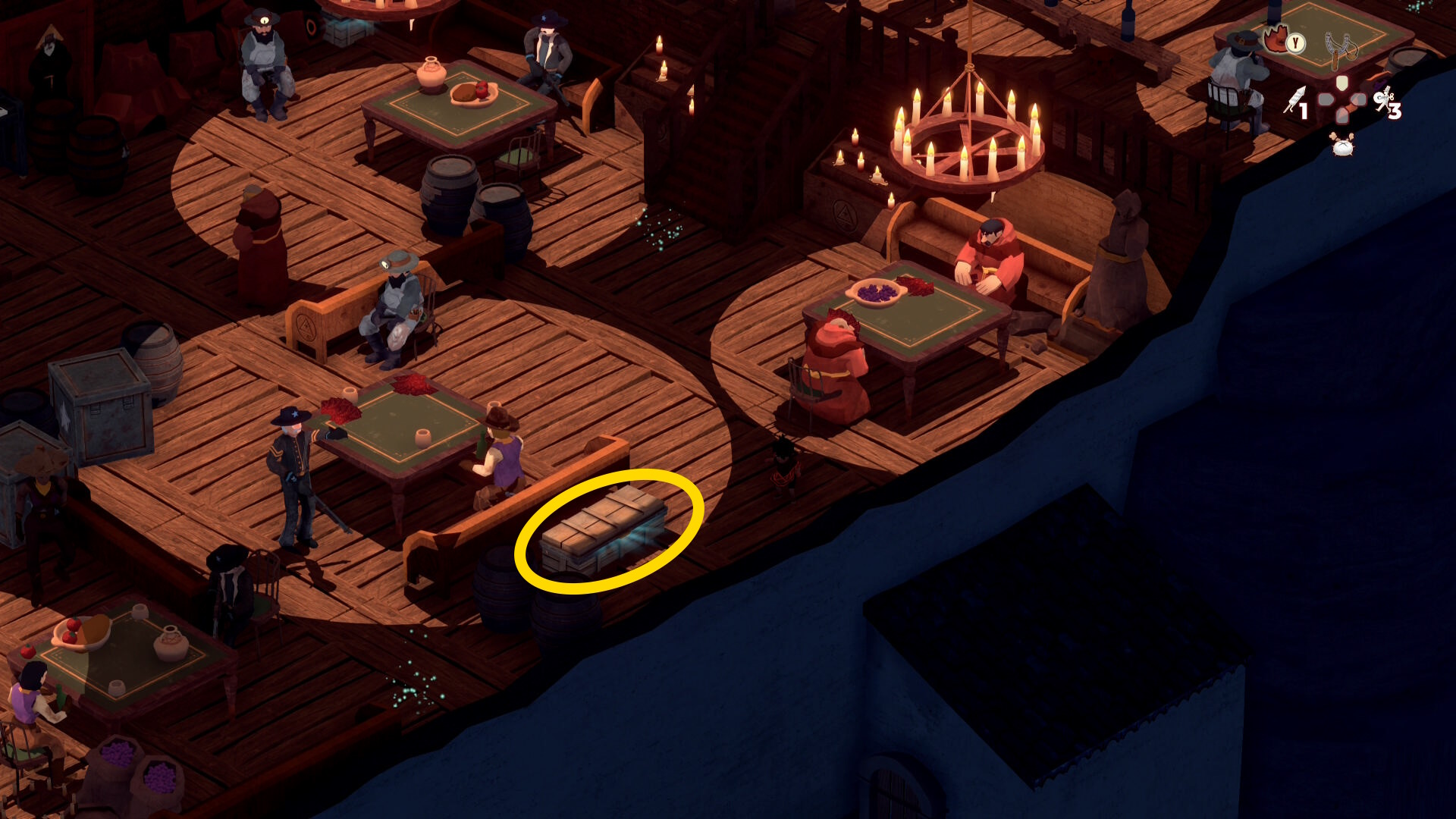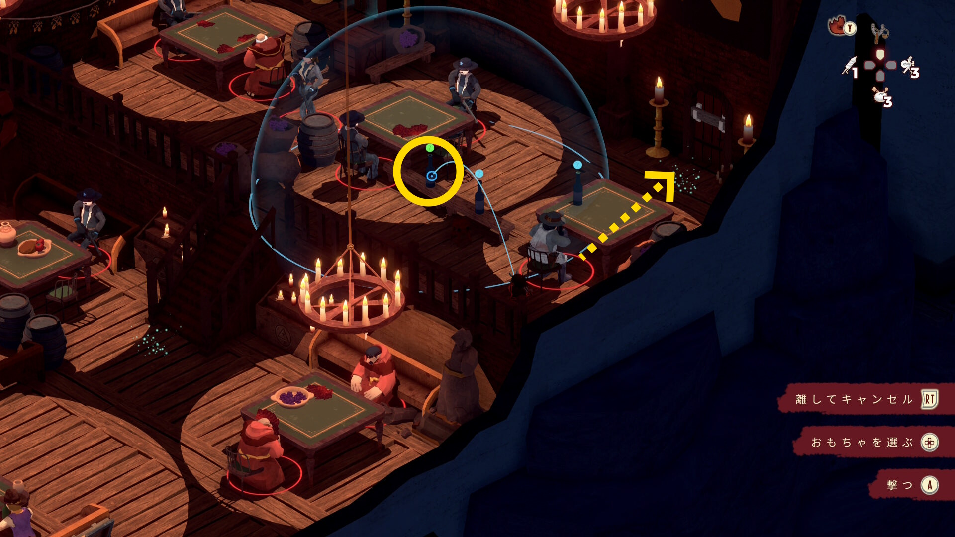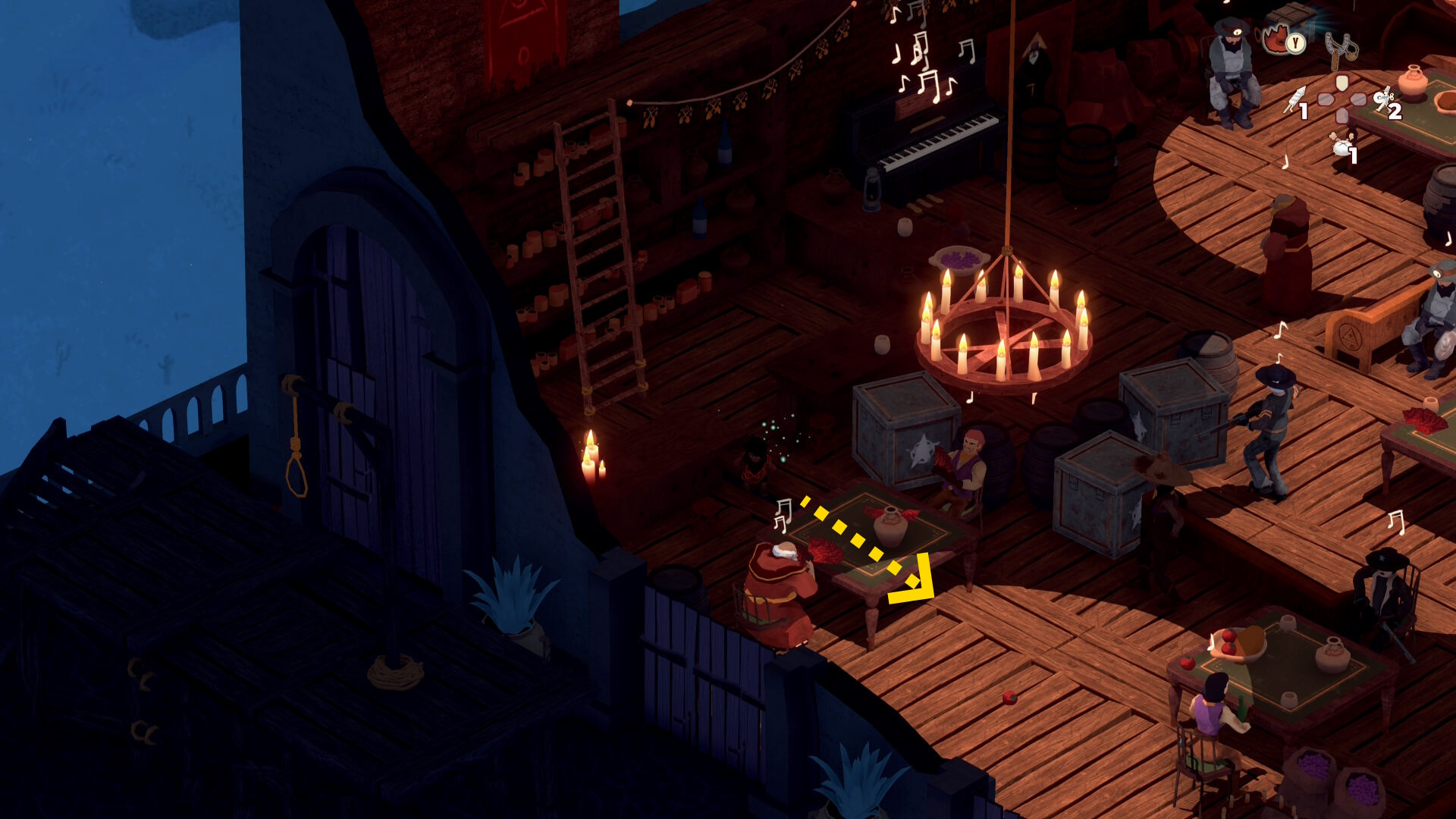 - 銃兵と修道士を同時に気絶させつつ木箱を破壊することも可能だが、うまくいく確率が低いので木箱だけ破壊する