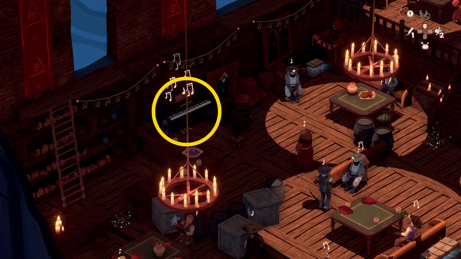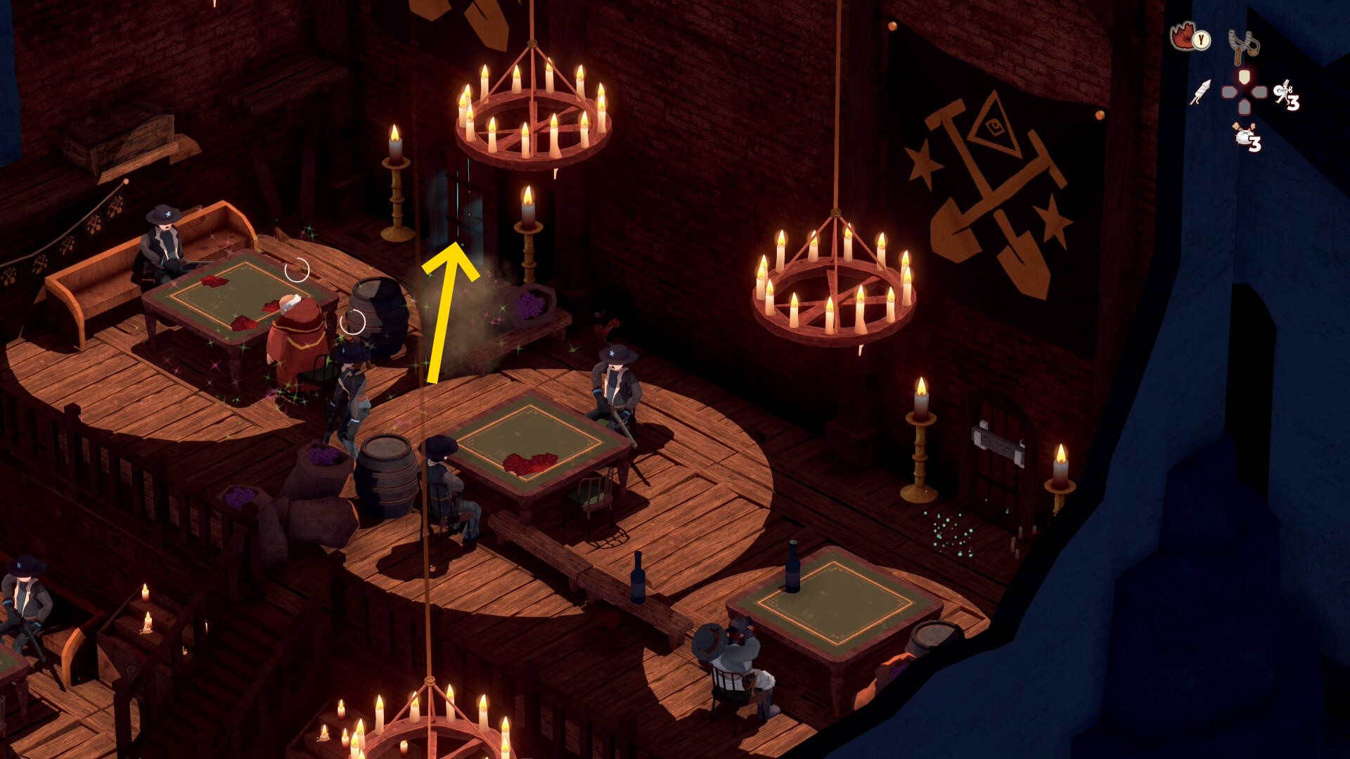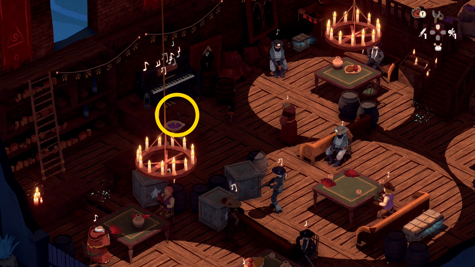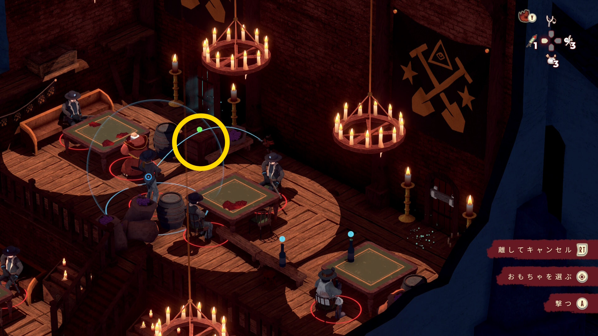 - 銃兵と修道士を同時に気絶させつつ木箱を破壊することも可能だが、うまくいく確率が低いので木箱だけ破壊する