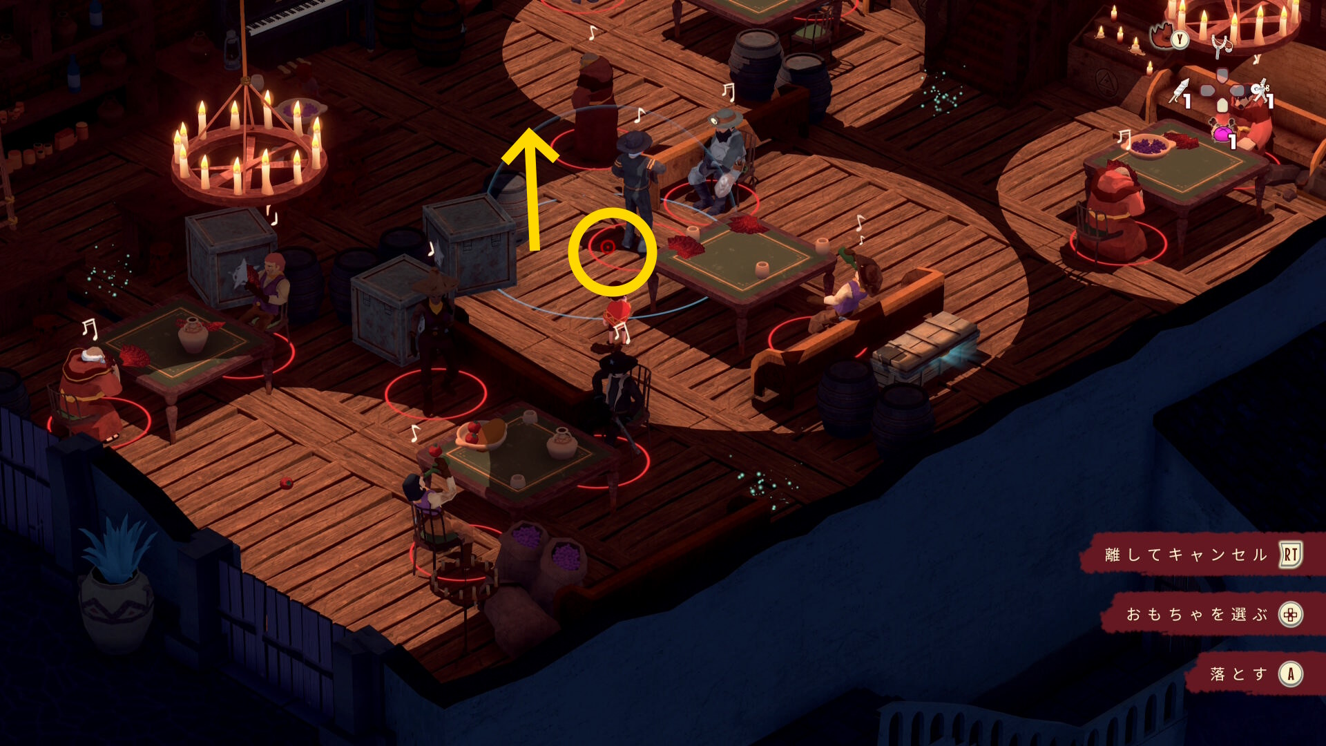 - 彼が右を向いたらテーブルから出て、床に落ちているトマトのところでソンブレロに隠れる