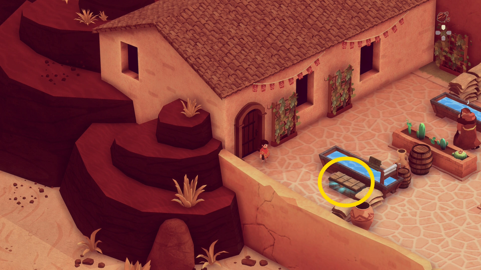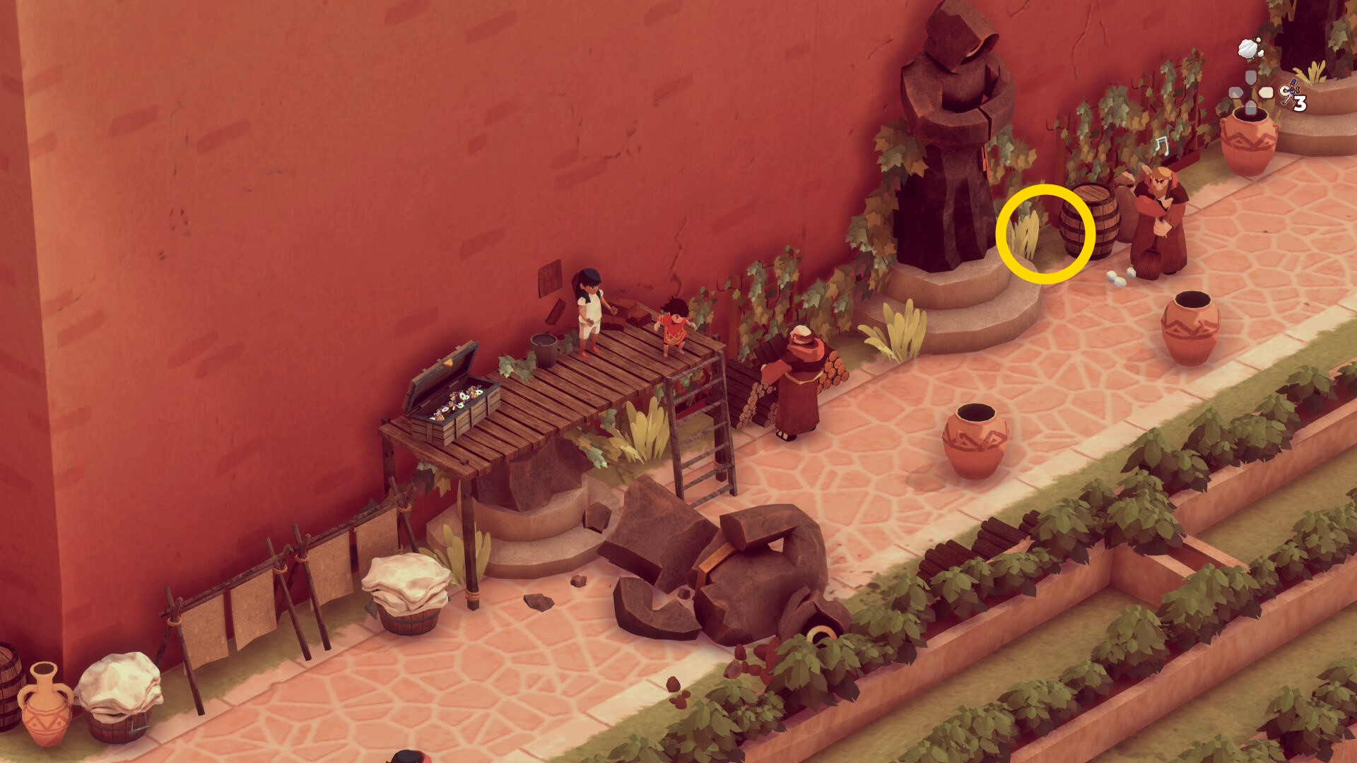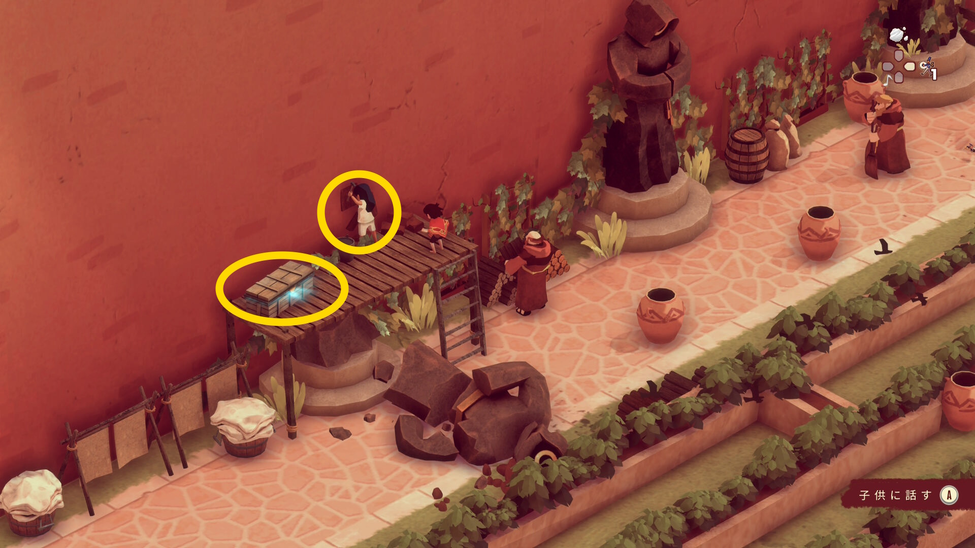- 農具を持った修道士が上に移動したら、右上に見える鉢植えを引っ張る(下画像2枚目の位置で止める)←この位置で止めておかないとあとで安全に戻るルートを使えなくなるので注意