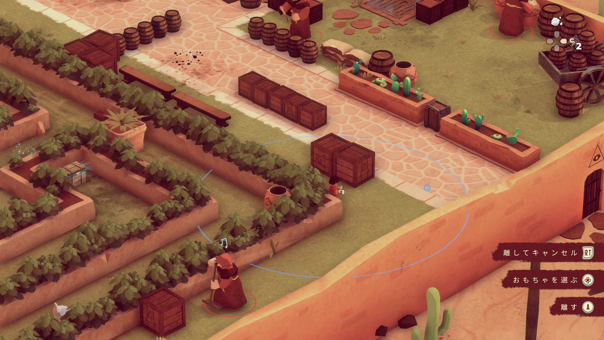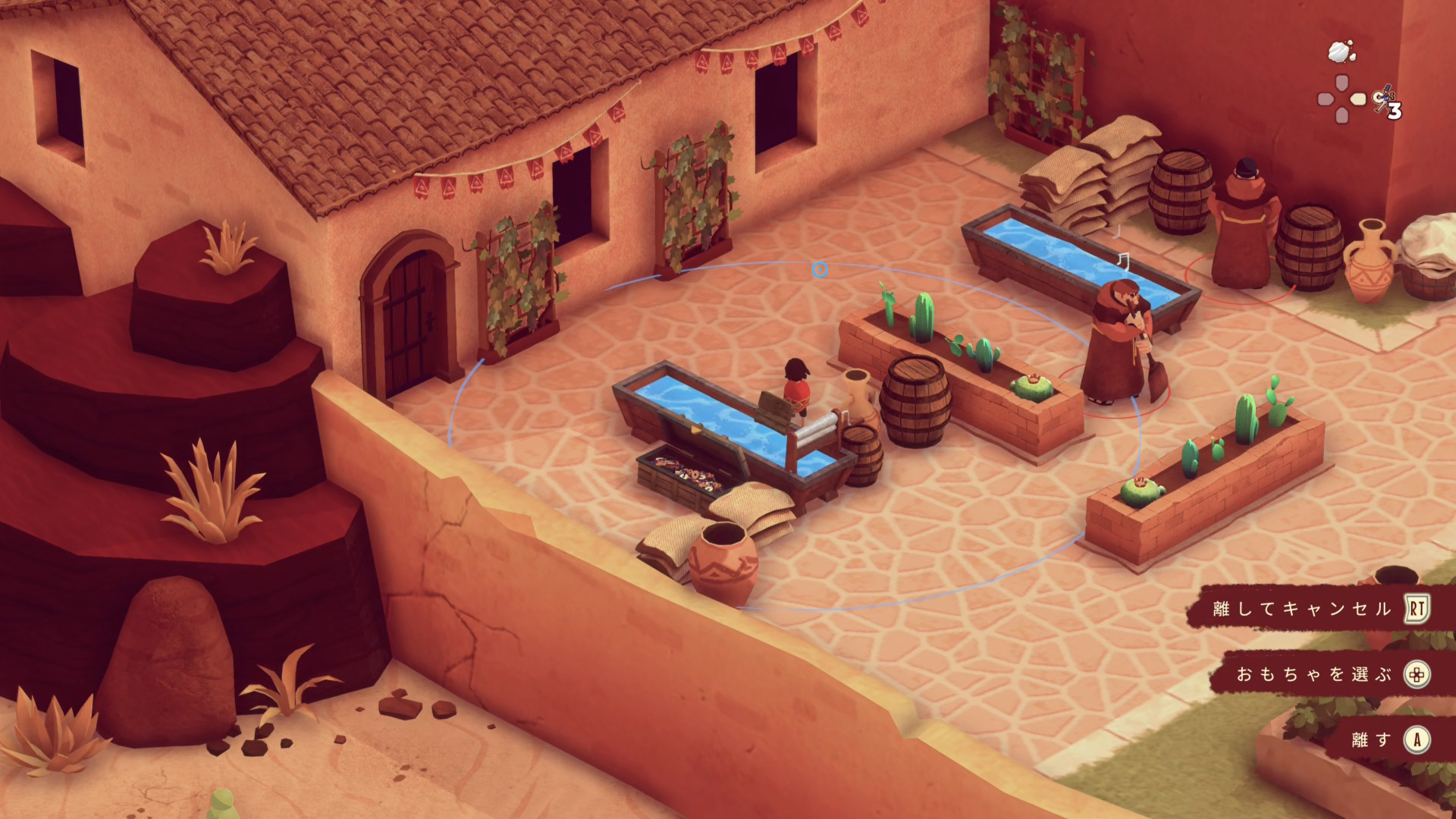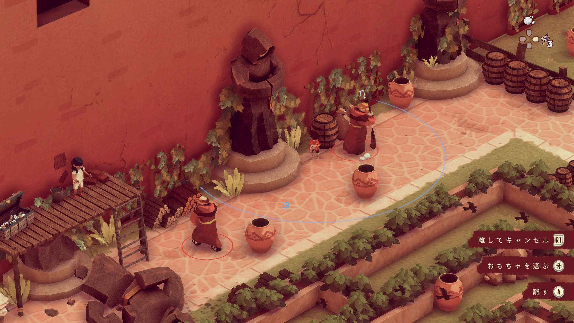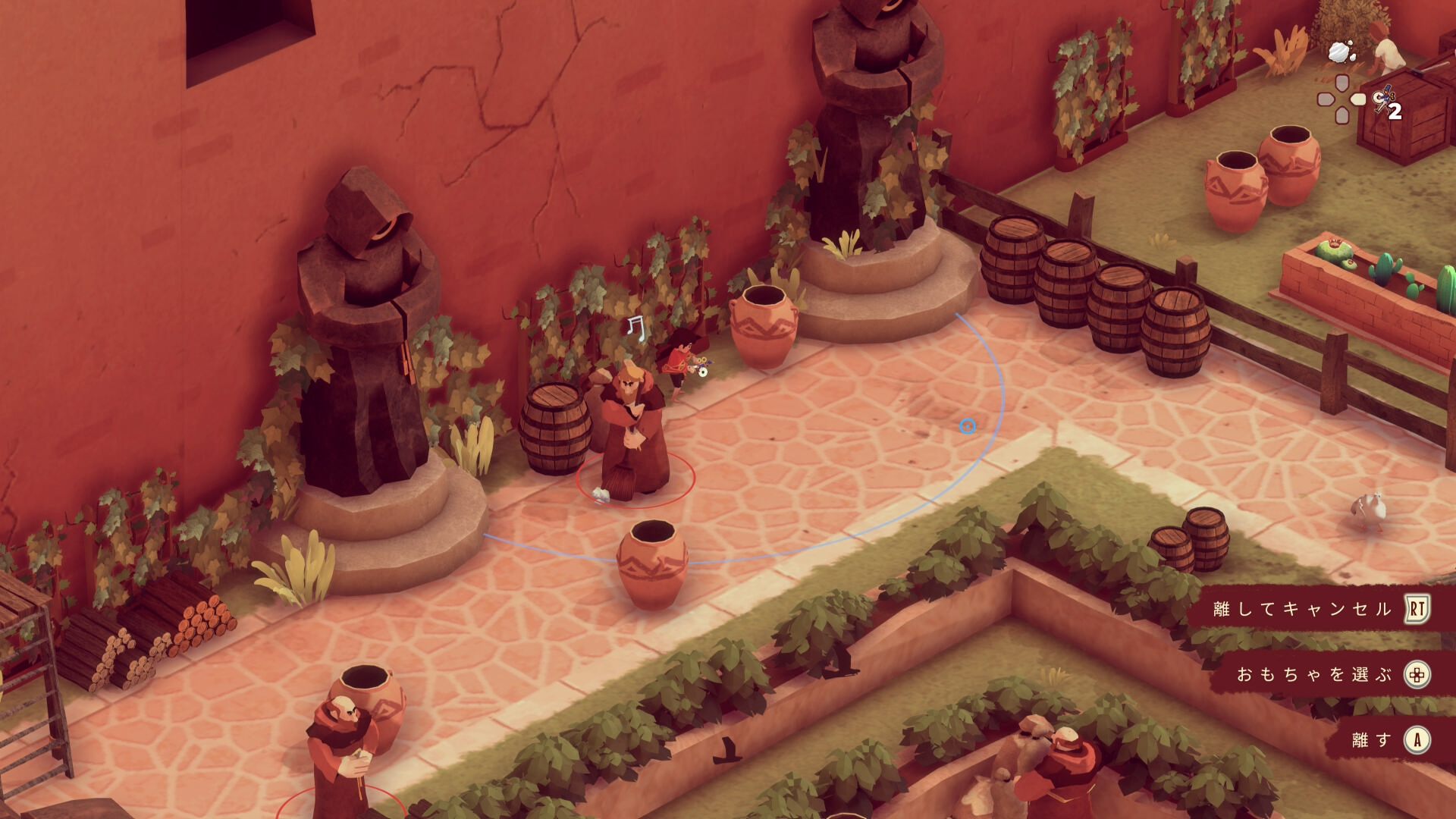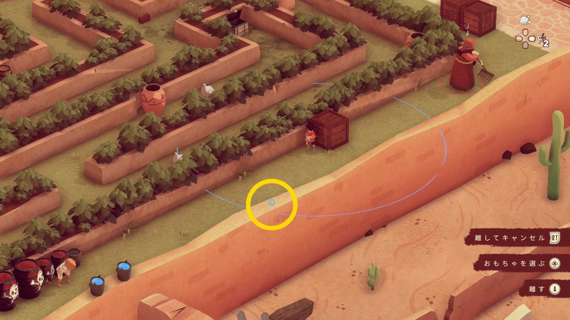 - 1つ目:白ひげの修道士の認知コーンが長いため、おもちゃを設置するときは下画像のエル イホの位置がギリギリ( RB 長押しで認知コーンを確認するのもいいでしょう)