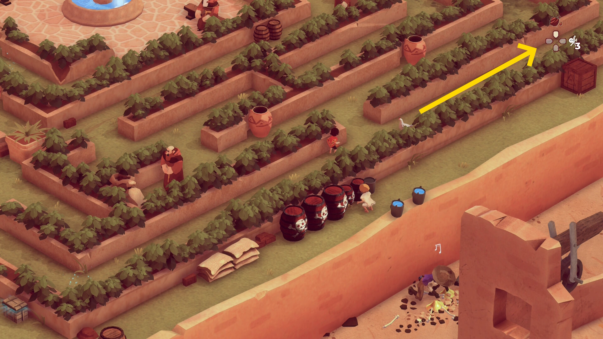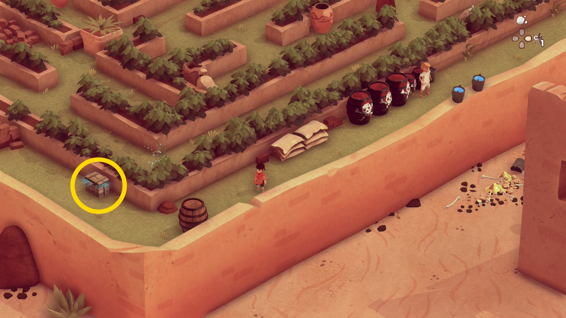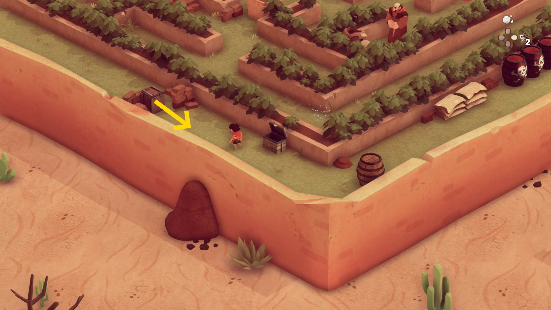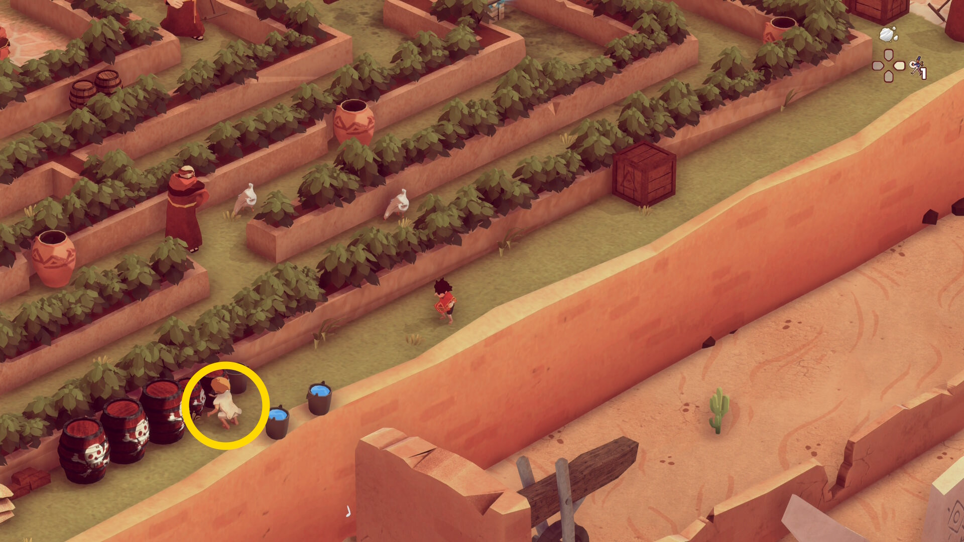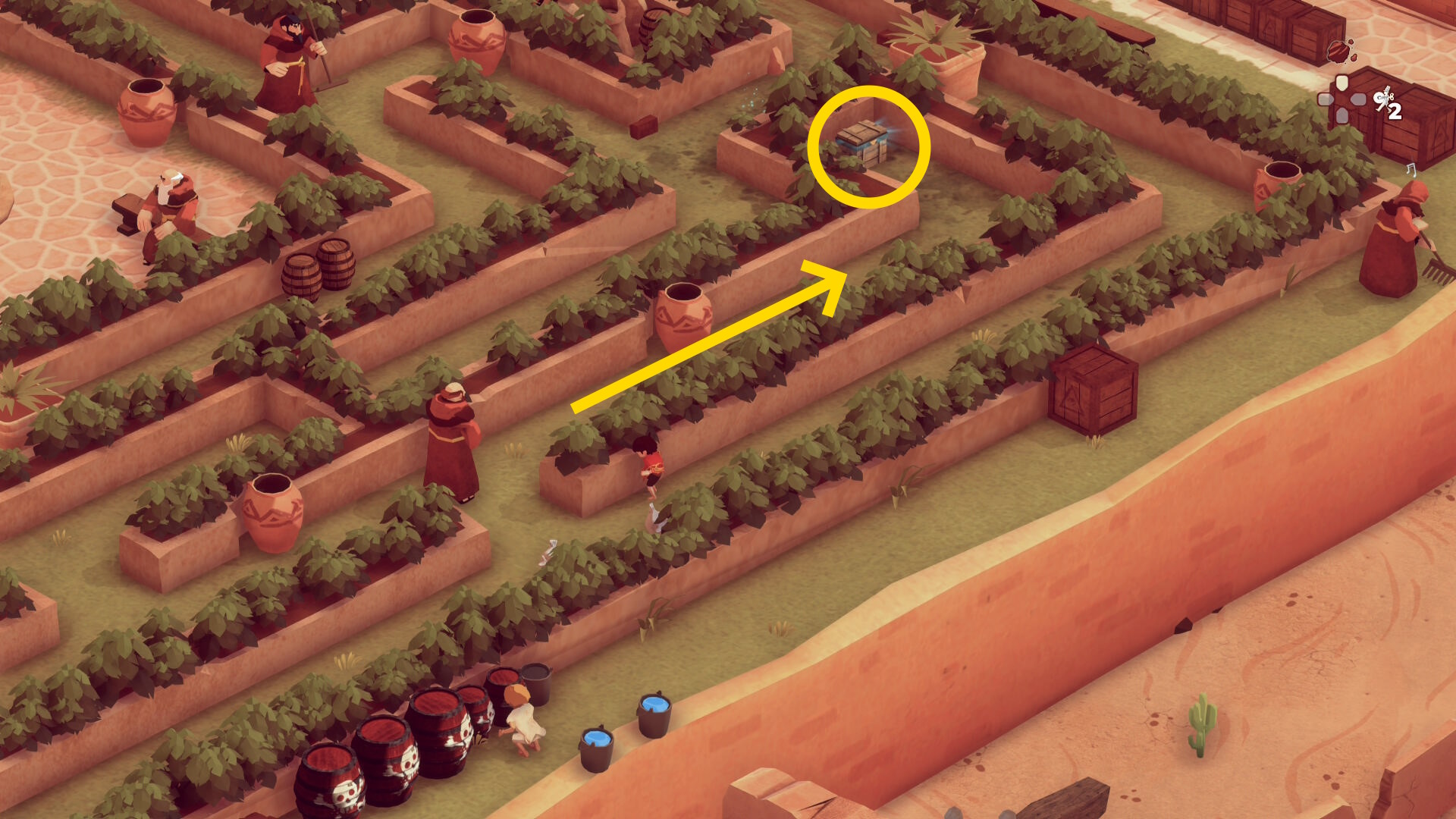 - 左下に移動して木箱にカバーし、修道士が元の場所に戻ったら、右側の大きな木箱と庭園の壁の間へ移動