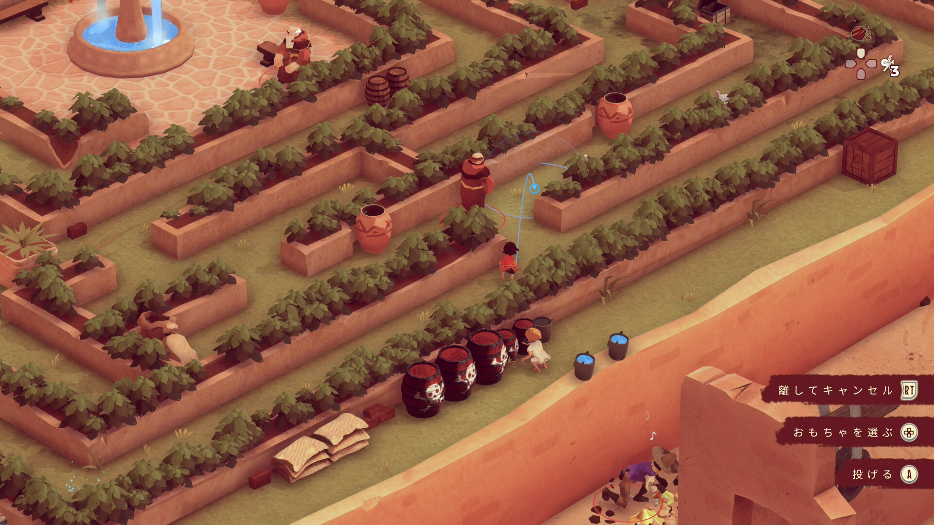 - 修道士がおもちゃを壊している隙にカバー状態のまま花壇を移動し、左下に移動していく