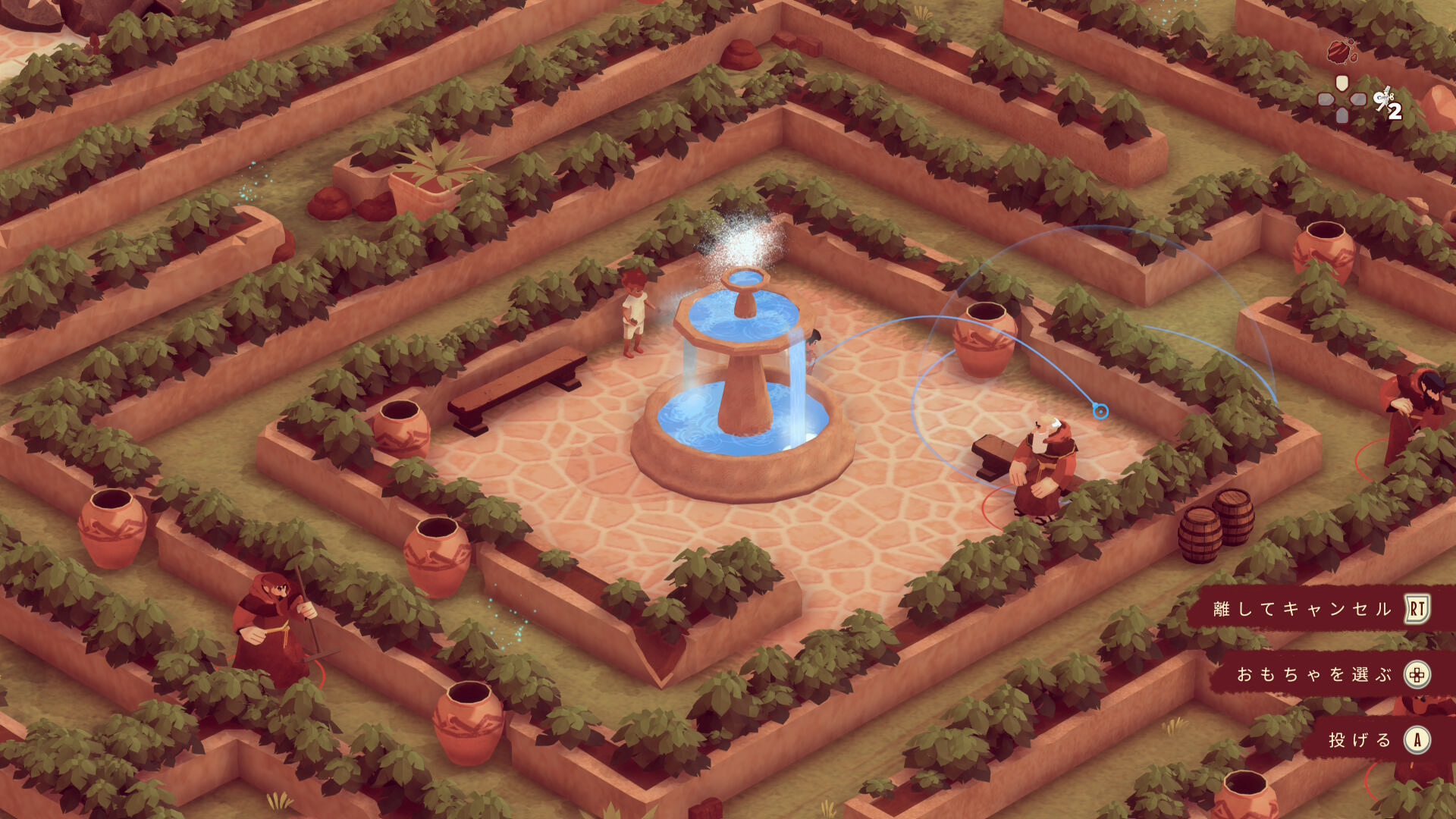 - 修道士がおもちゃを壊しベンチに戻る際に背中を向けるので、その隙に噴水へ