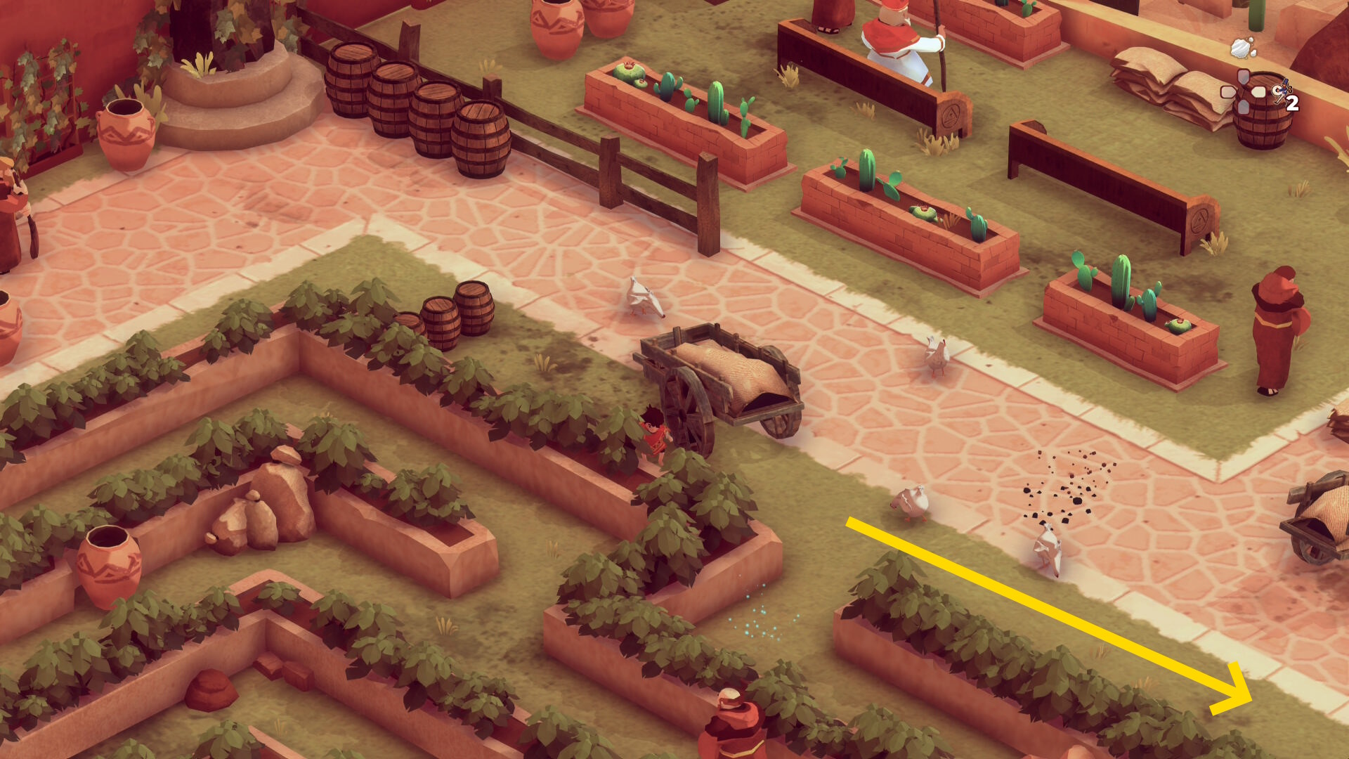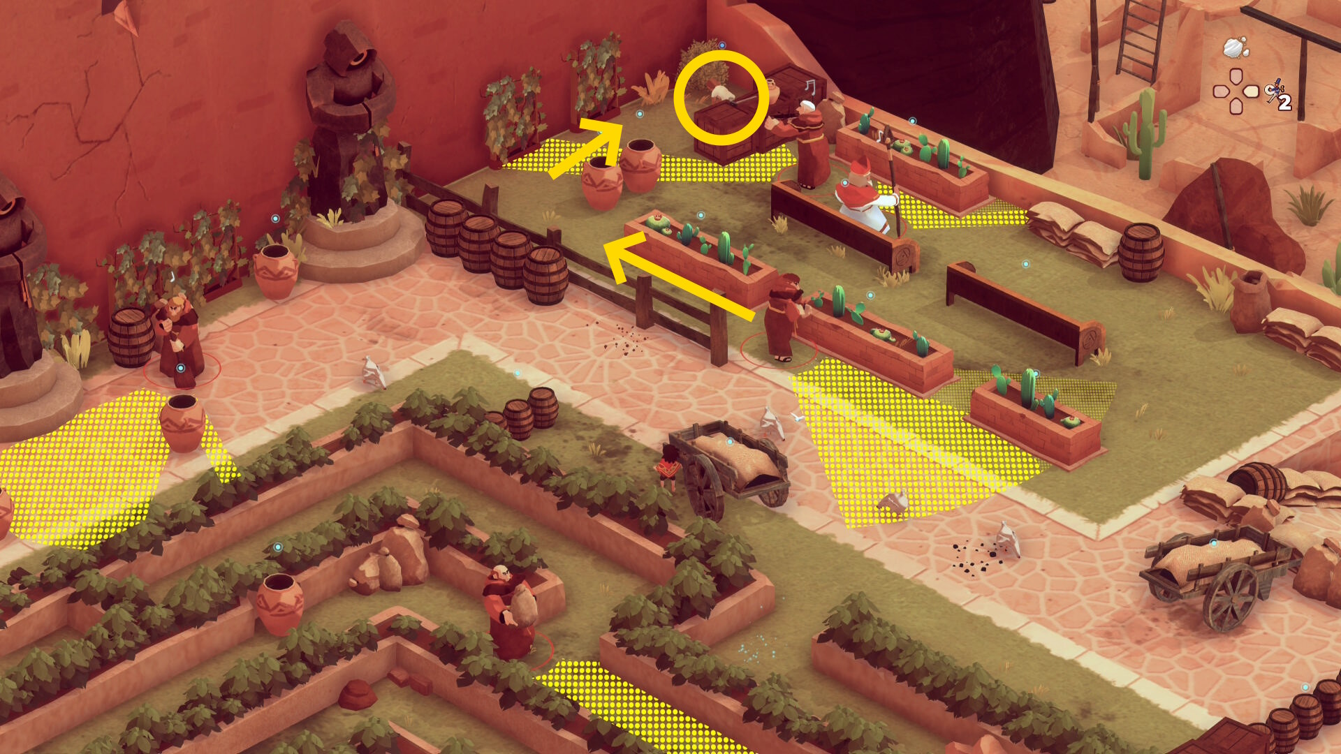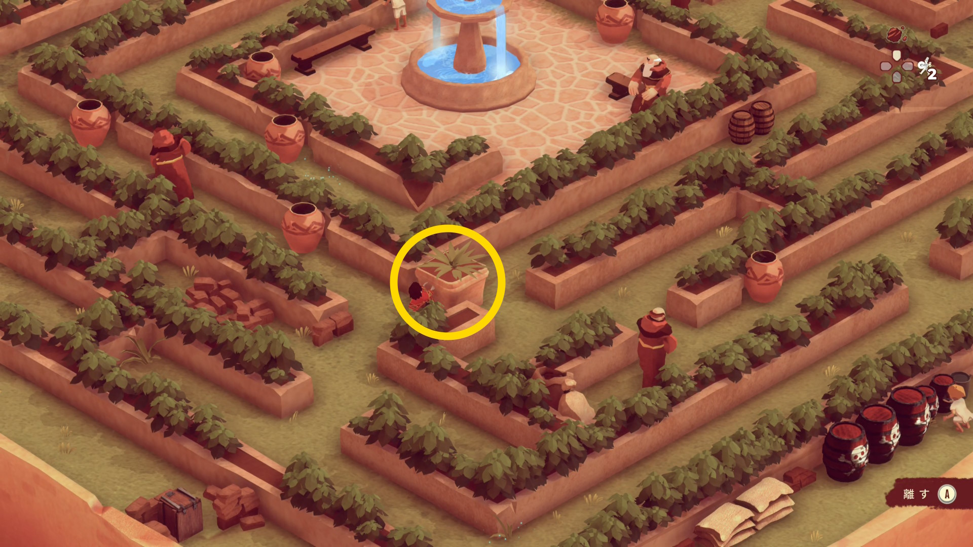 - 鶏に餌をあげながら移動する修道士が右に行ったらエリアに入るが、楽器を演奏している修道士に見つかることが多い。レンガの花壇にカバーしておき、楽器を演奏する修道士が下画像の位置に来たら、ポットの裏で待機(絶対に中に隠れないこと)