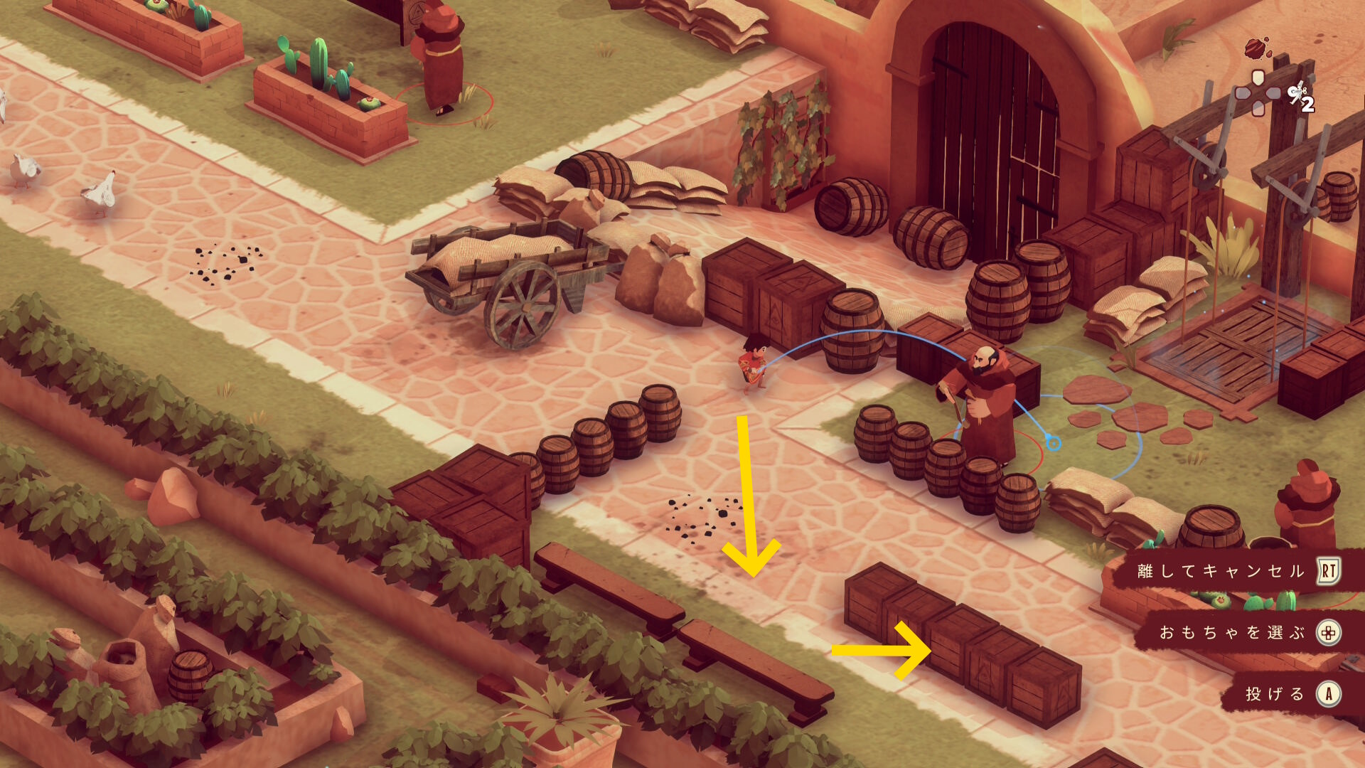 - 修道士がおもちゃに気を取られている隙に上の2つ並んだ木箱のほうへ進む
