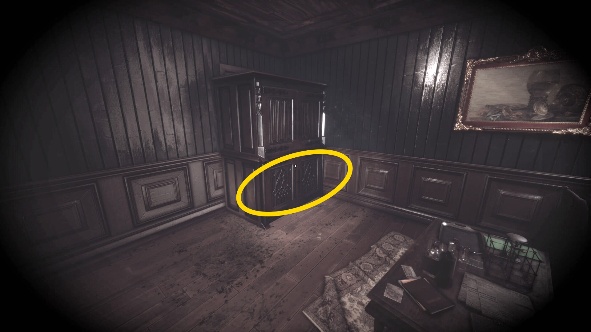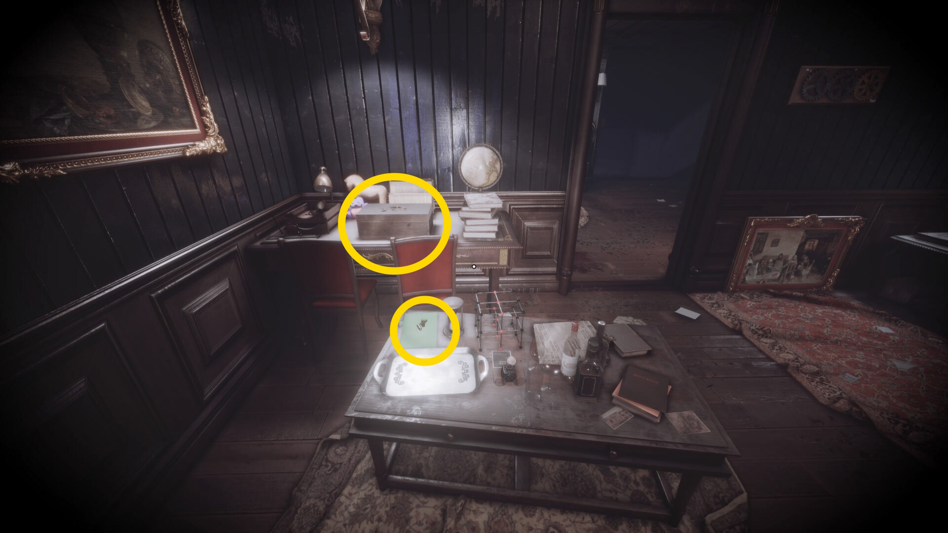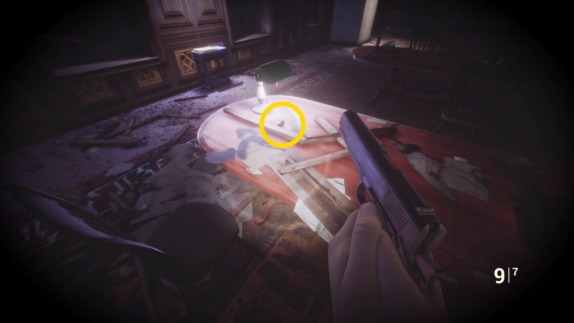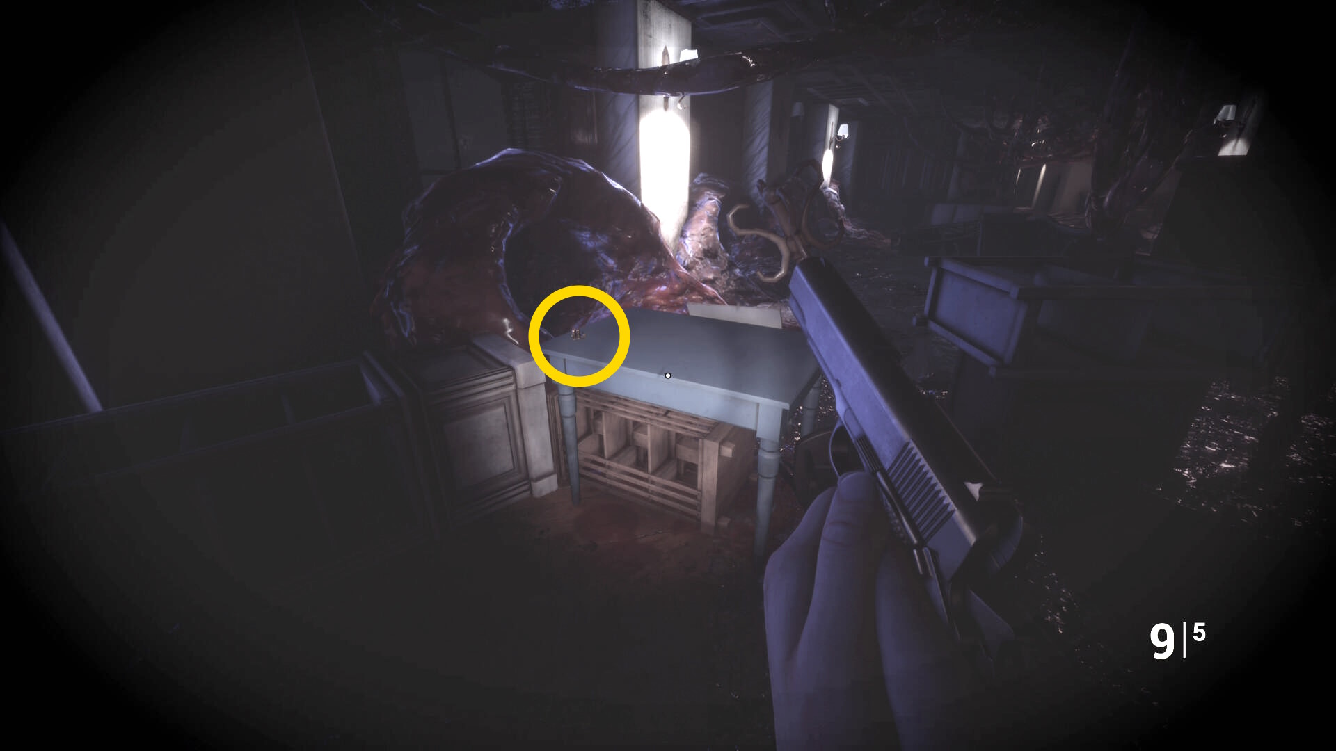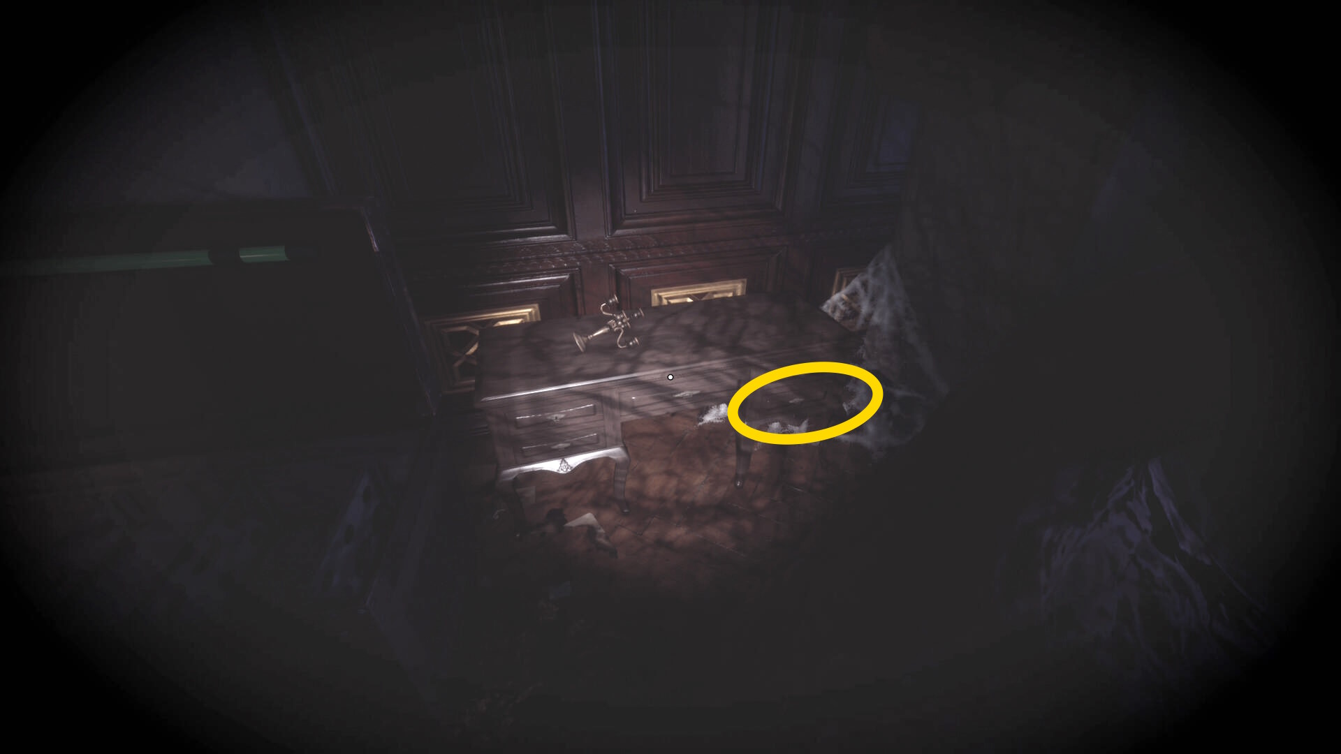 • なお、この机の奥の暗がりに敵が1体おり、かなり気づきにくいので注意(下画像:緑◯)(敵を倒す:9/10)