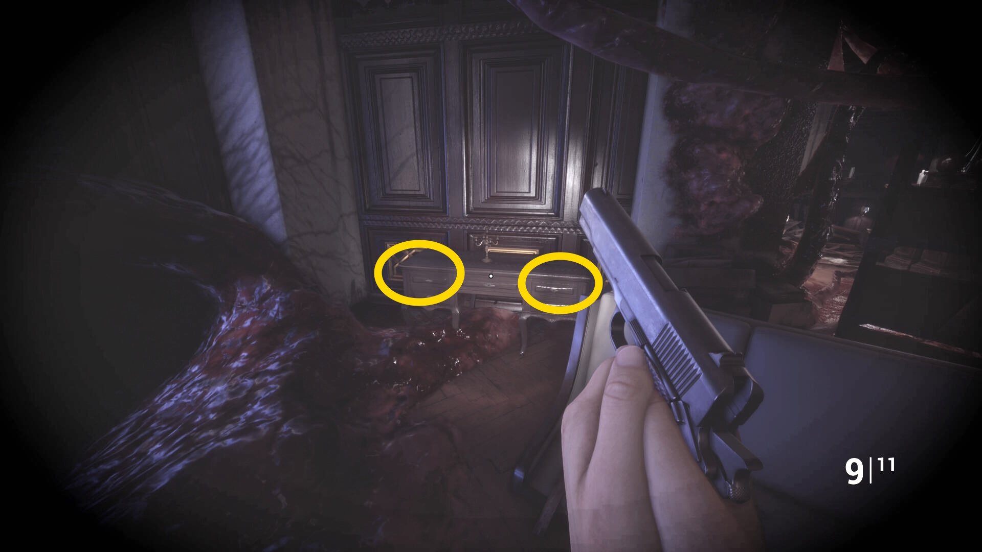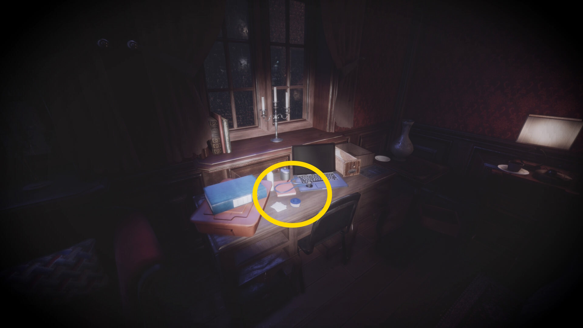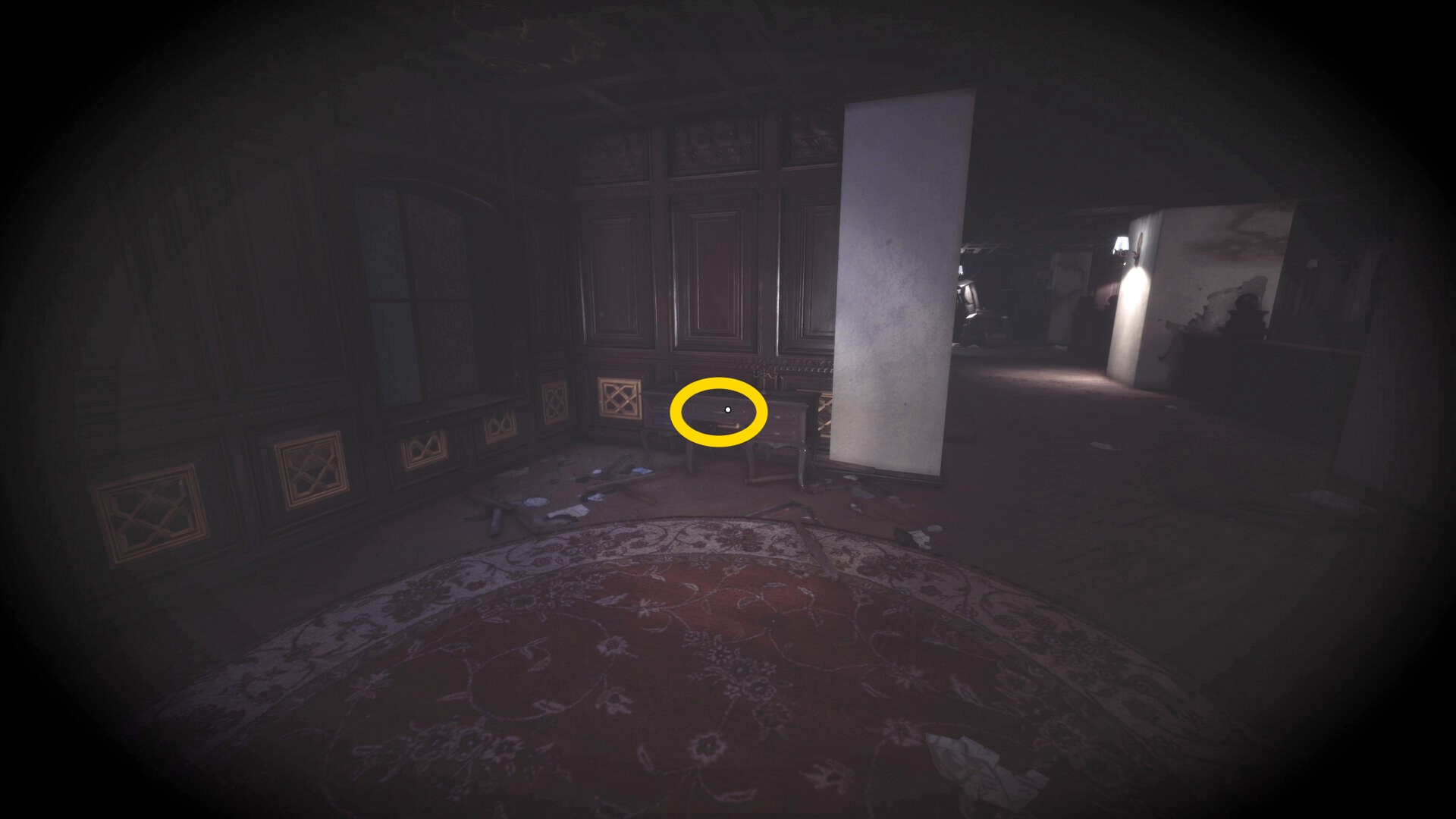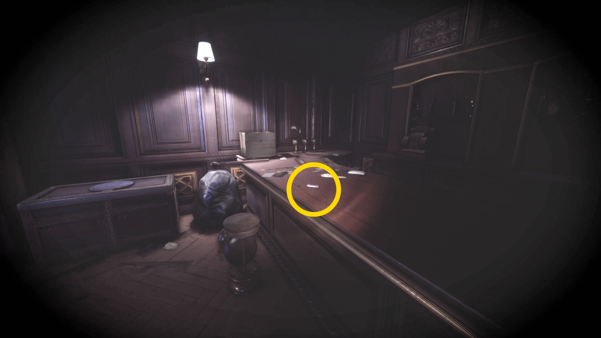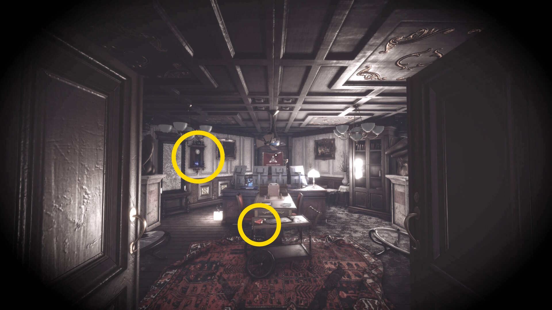 • なお、この机の奥の暗がりに敵が1体おり、かなり気づきにくいので注意(下画像:緑◯)(敵を倒す:9/10)