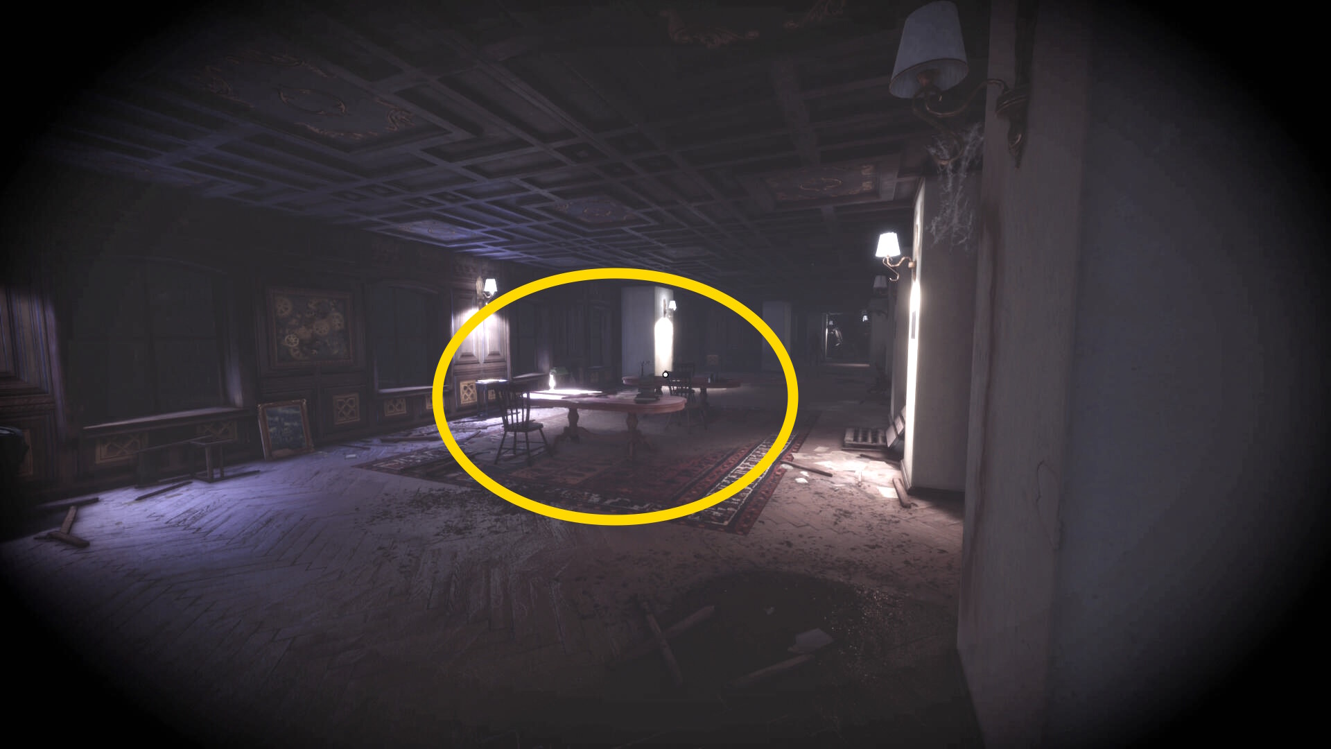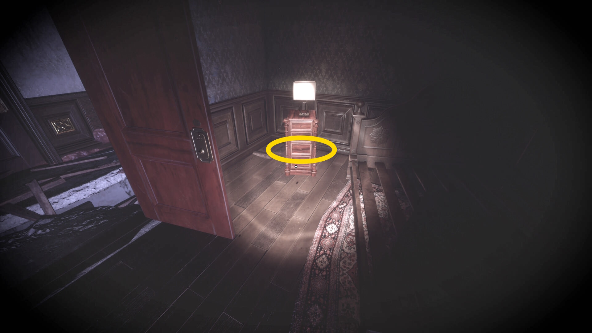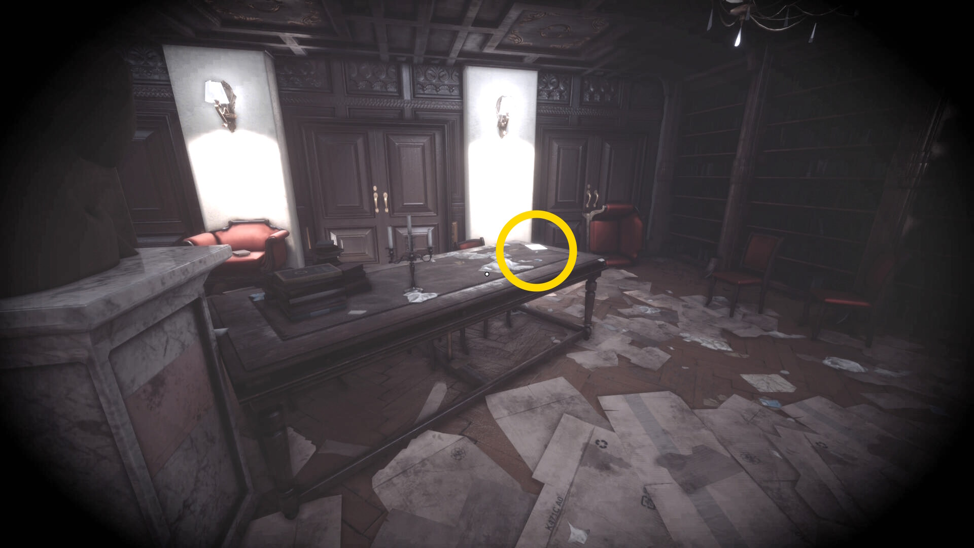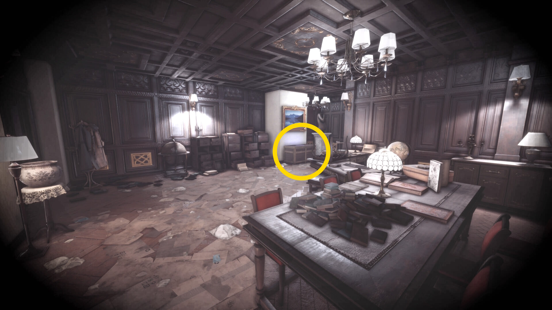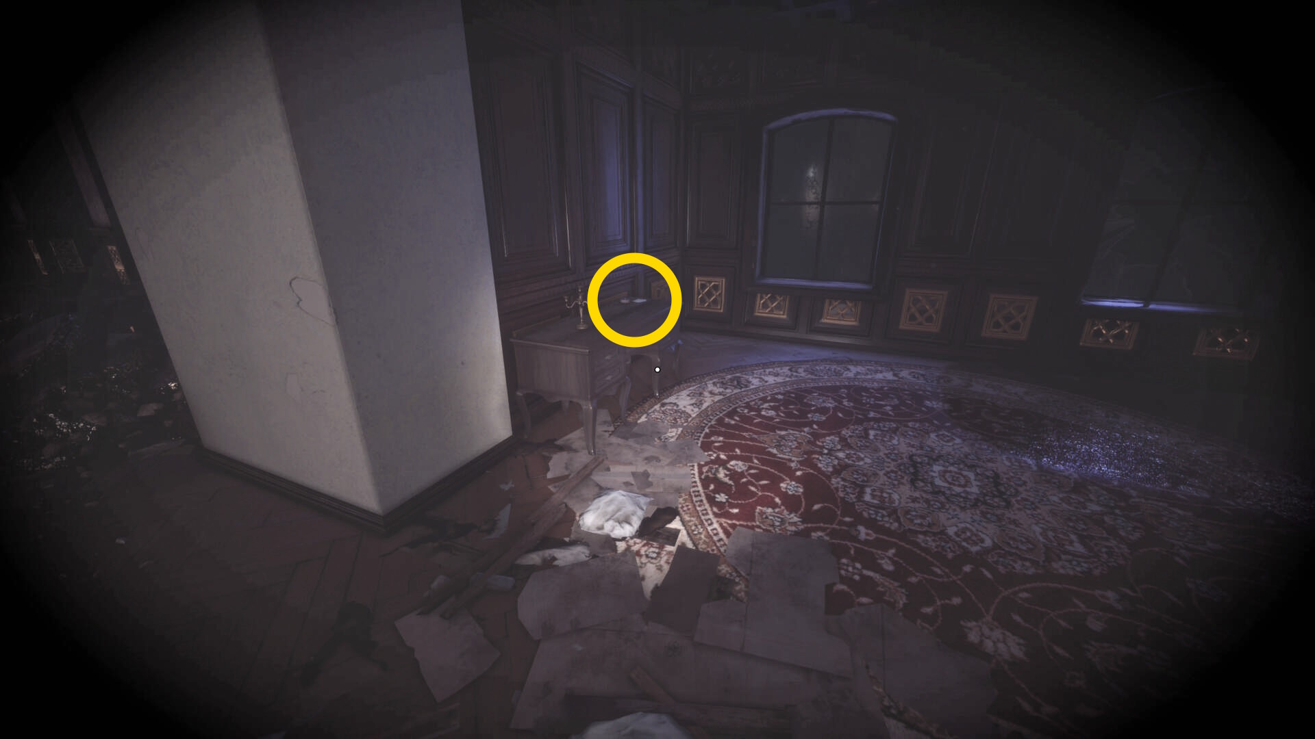 • なお、この机の奥の暗がりに敵が1体おり、かなり気づきにくいので注意(下画像:緑◯)(敵を倒す:9/10)