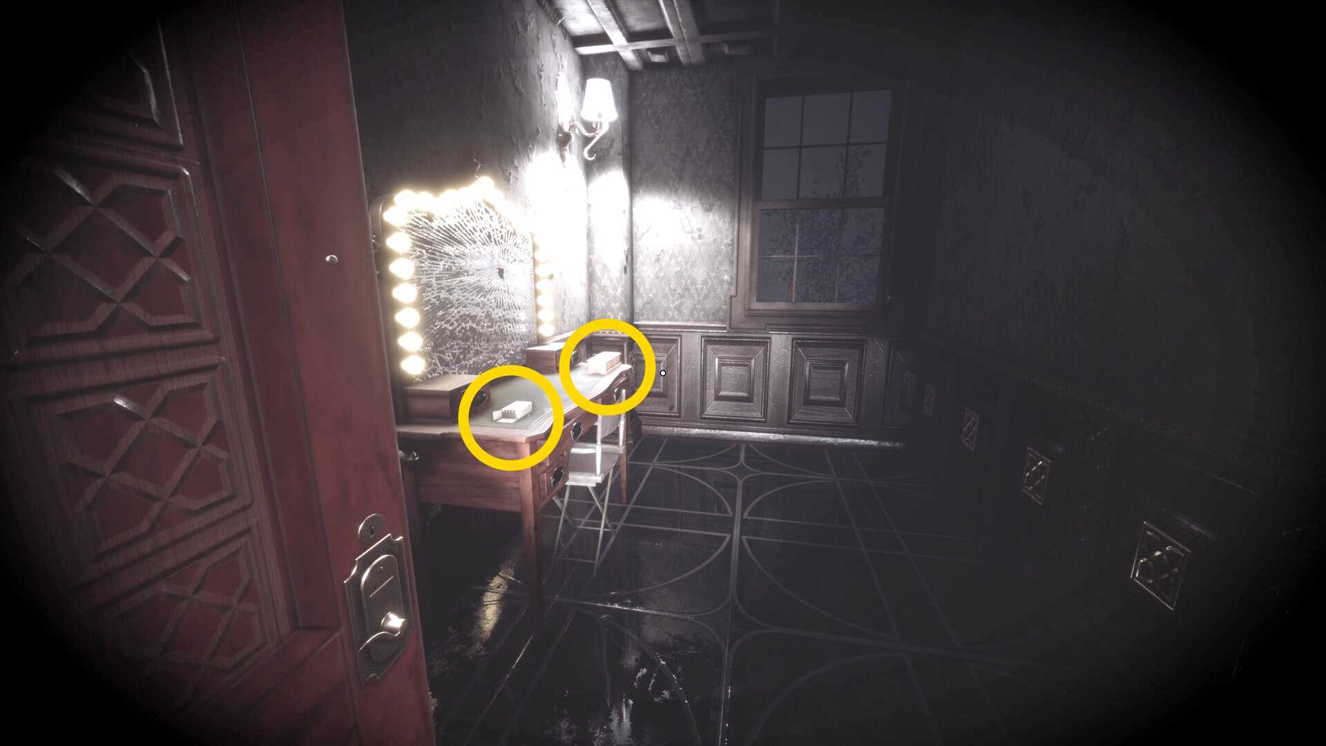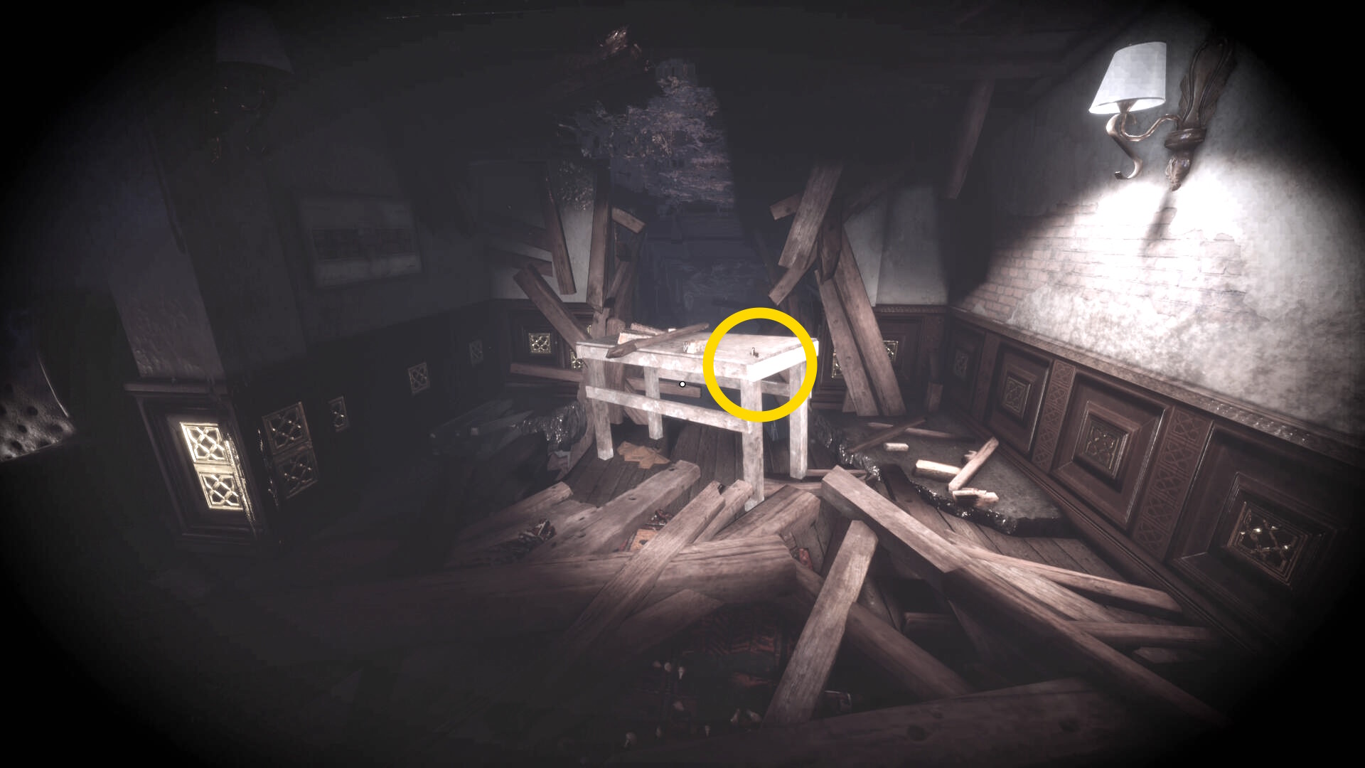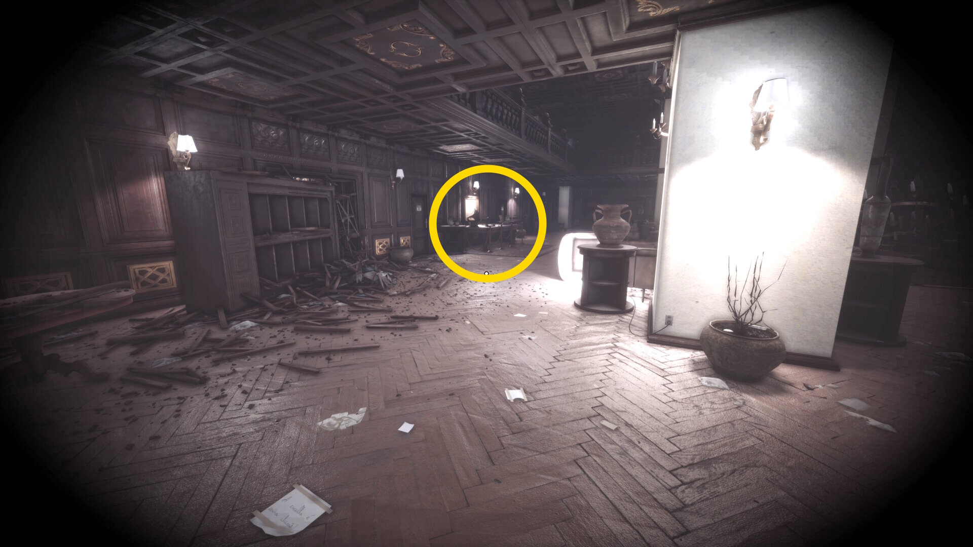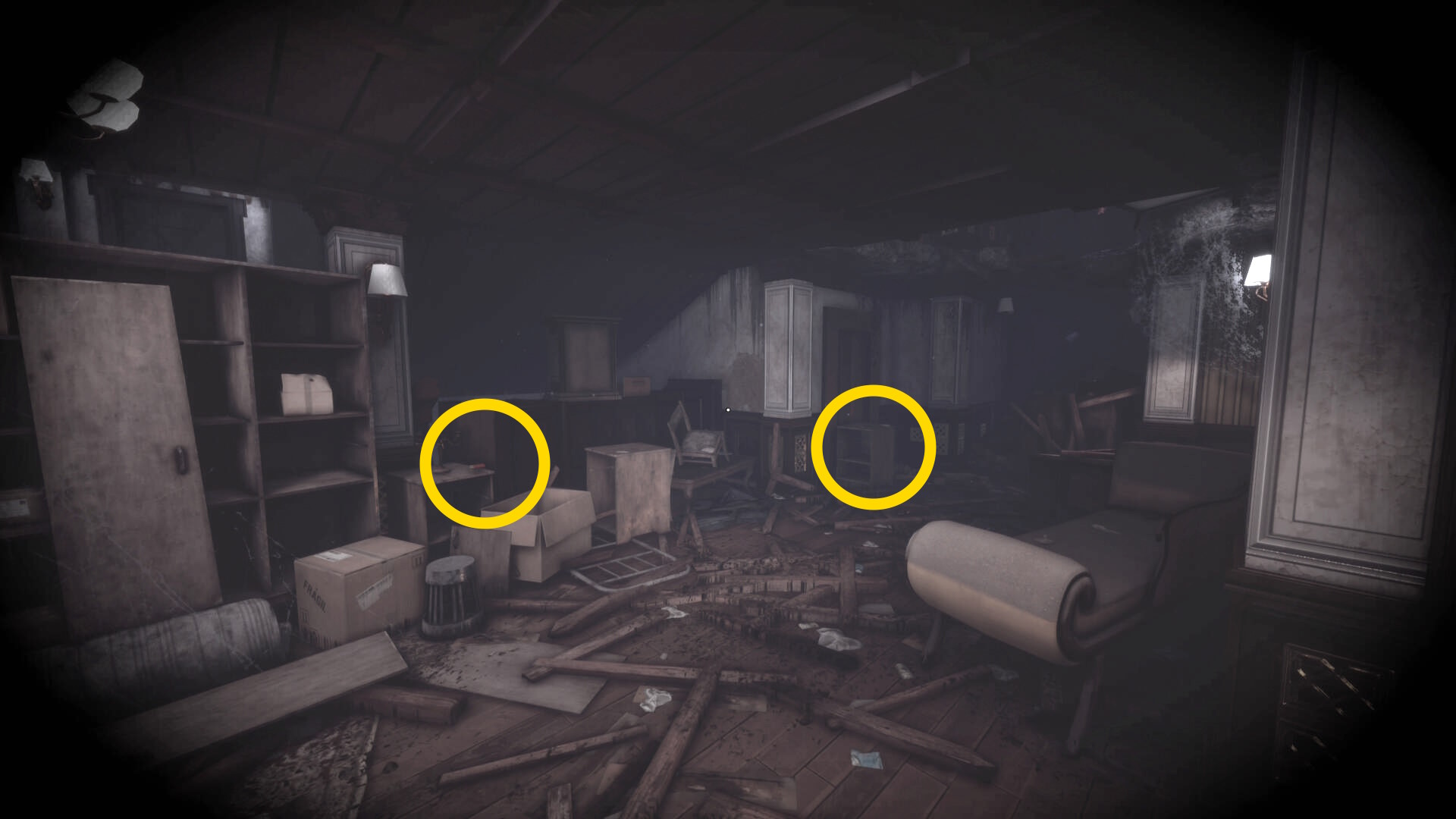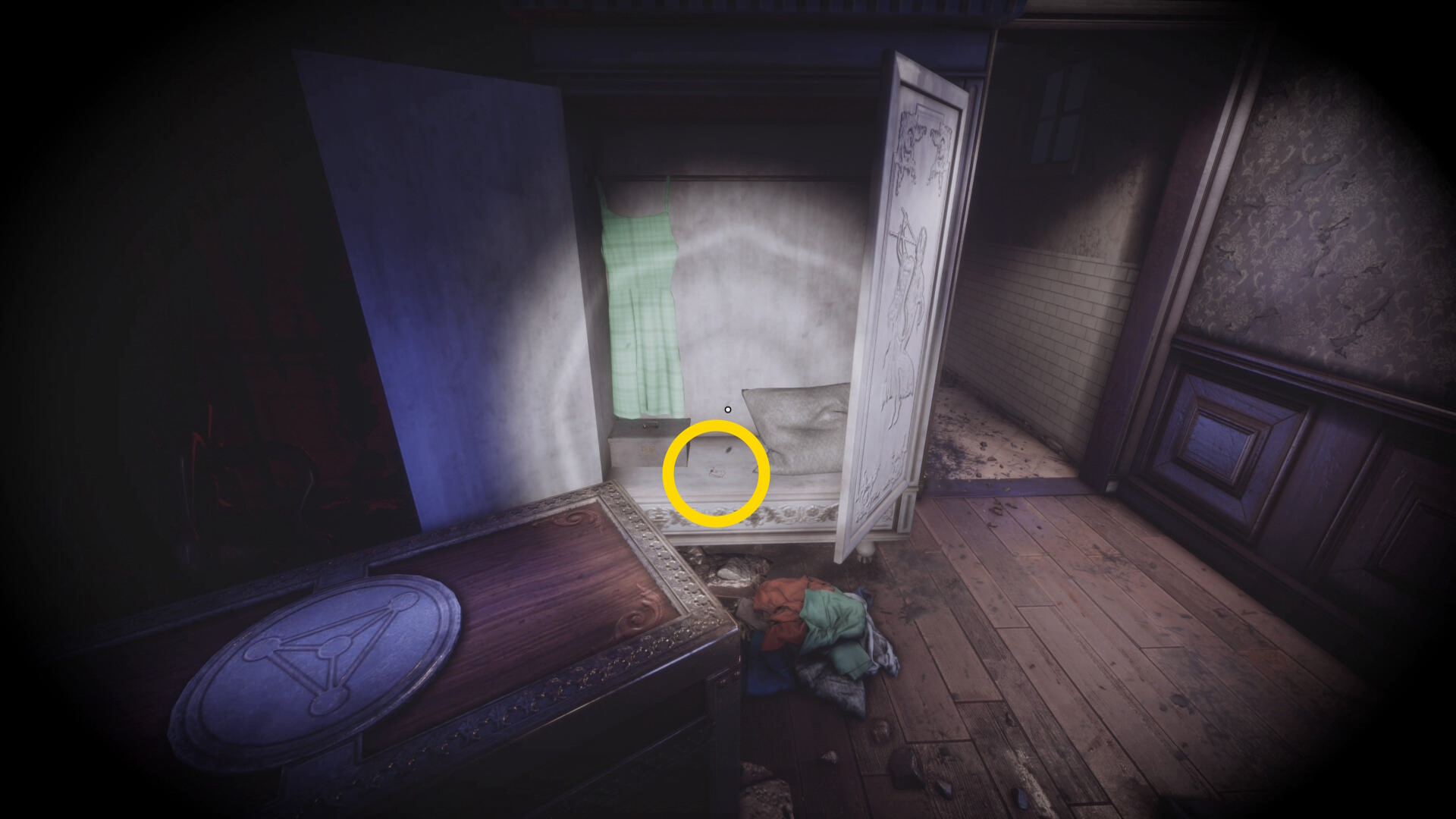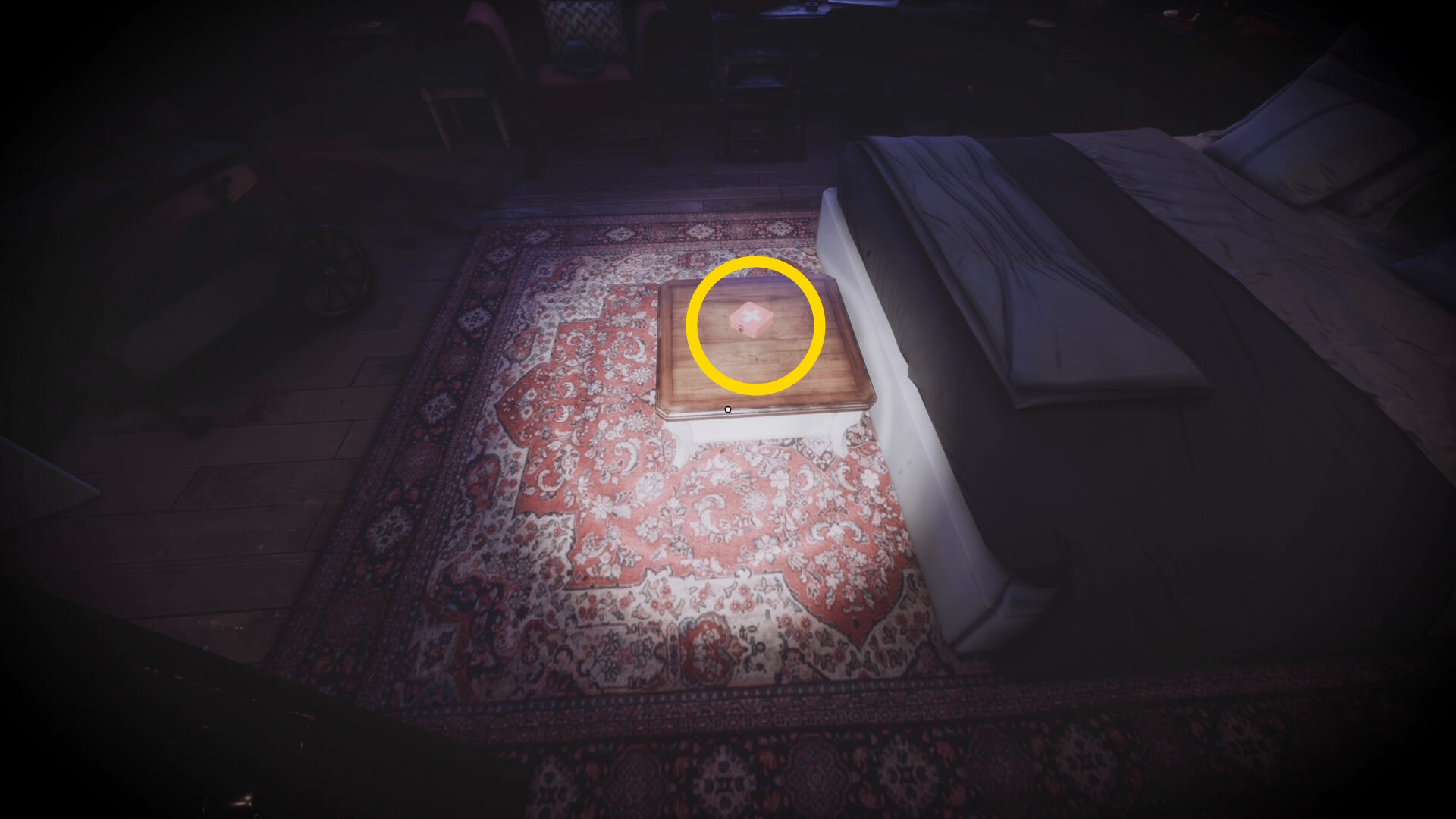 • なお、この机の奥の暗がりに敵が1体おり、かなり気づきにくいので注意(下画像:緑◯)(敵を倒す:9/10)