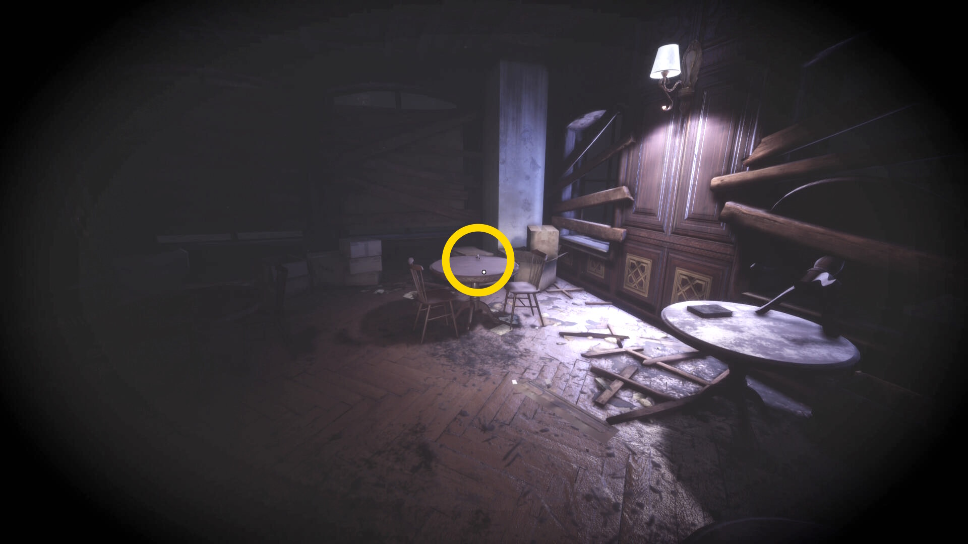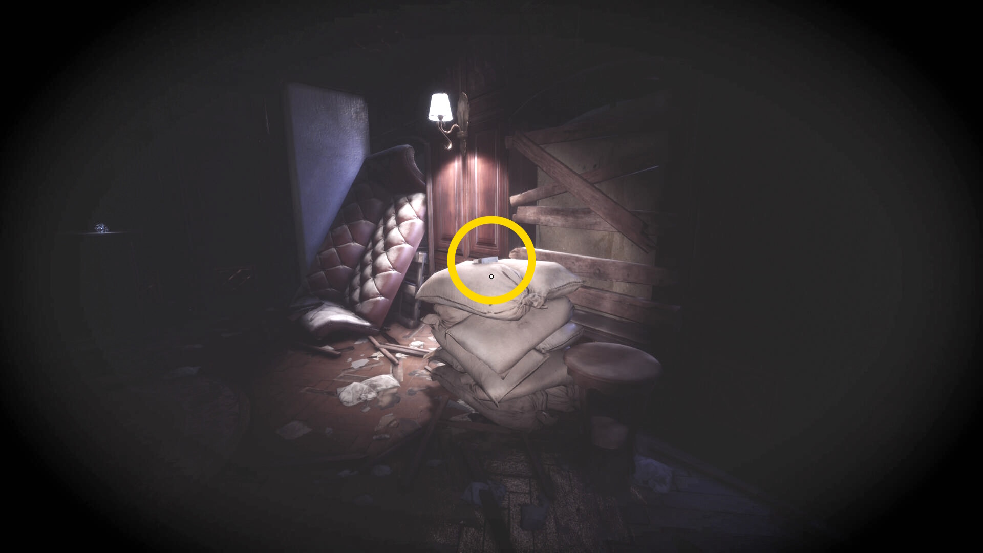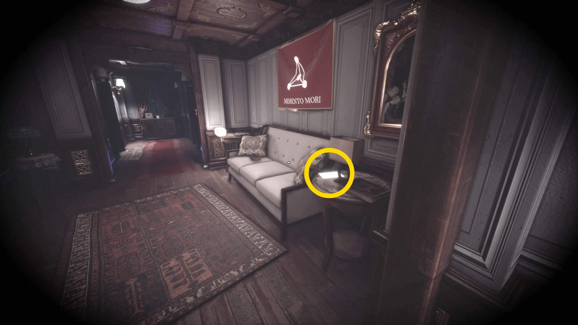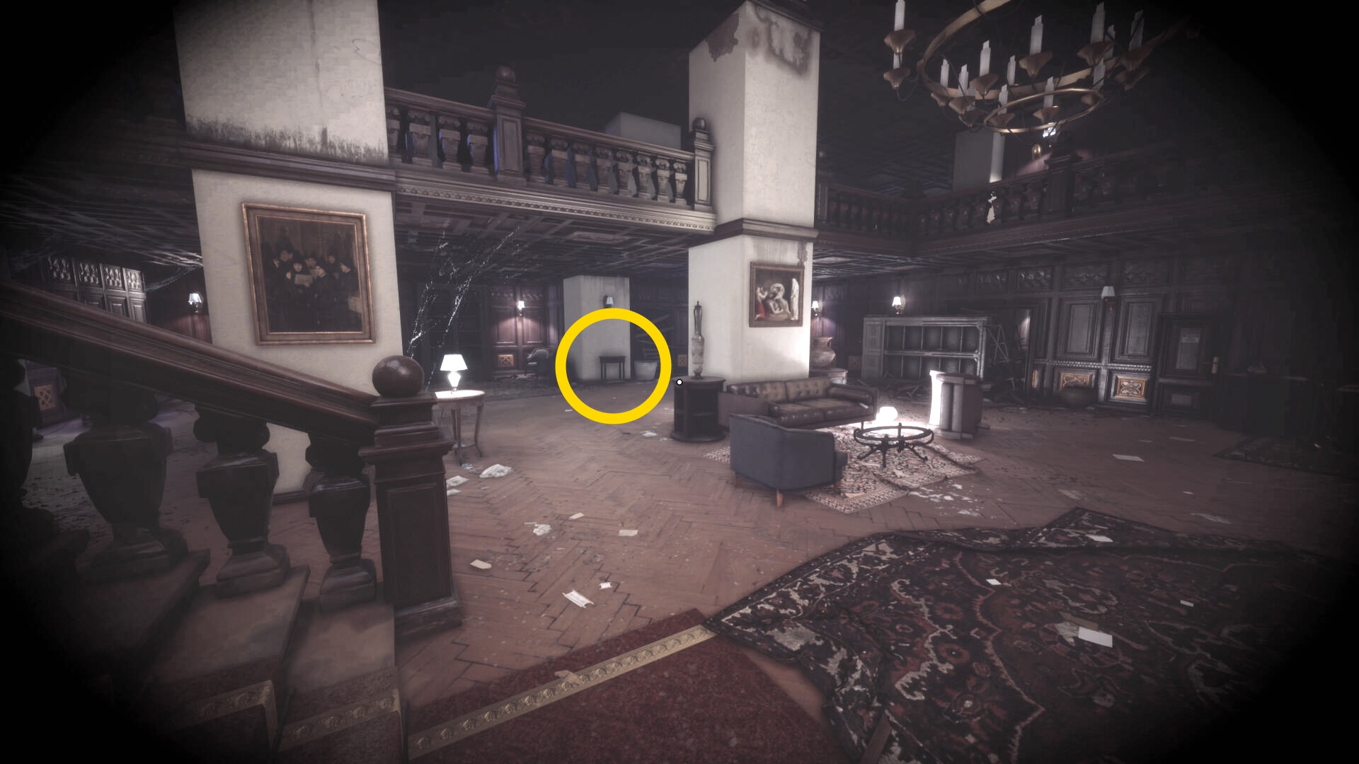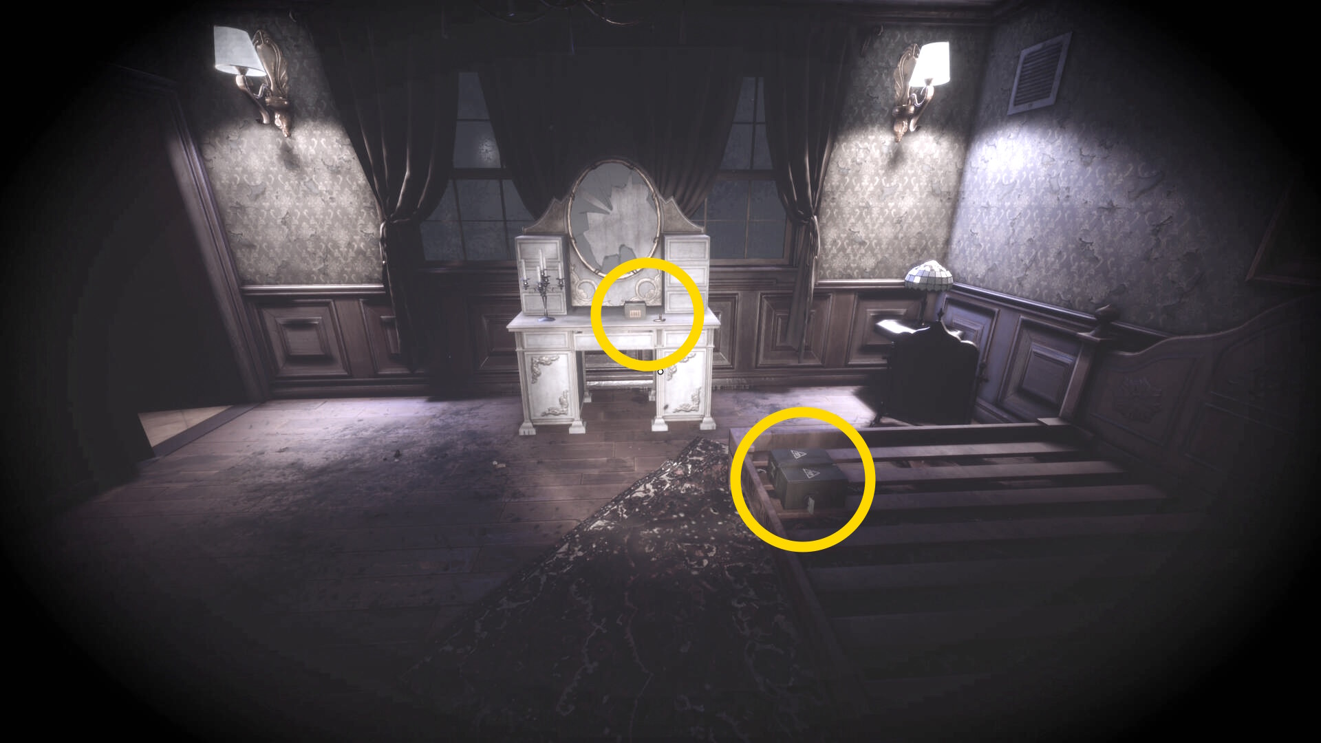 • なお、この机の奥の暗がりに敵が1体おり、かなり気づきにくいので注意(下画像:緑◯)(敵を倒す:9/10)