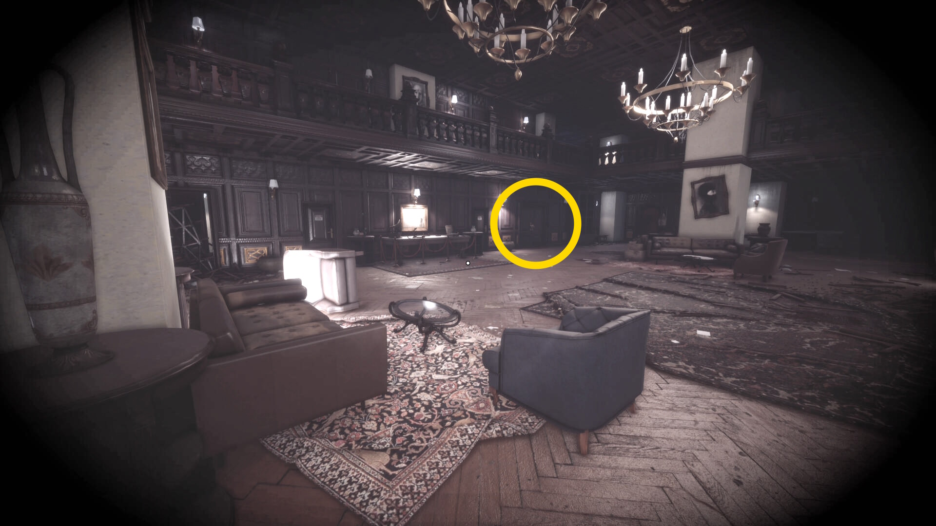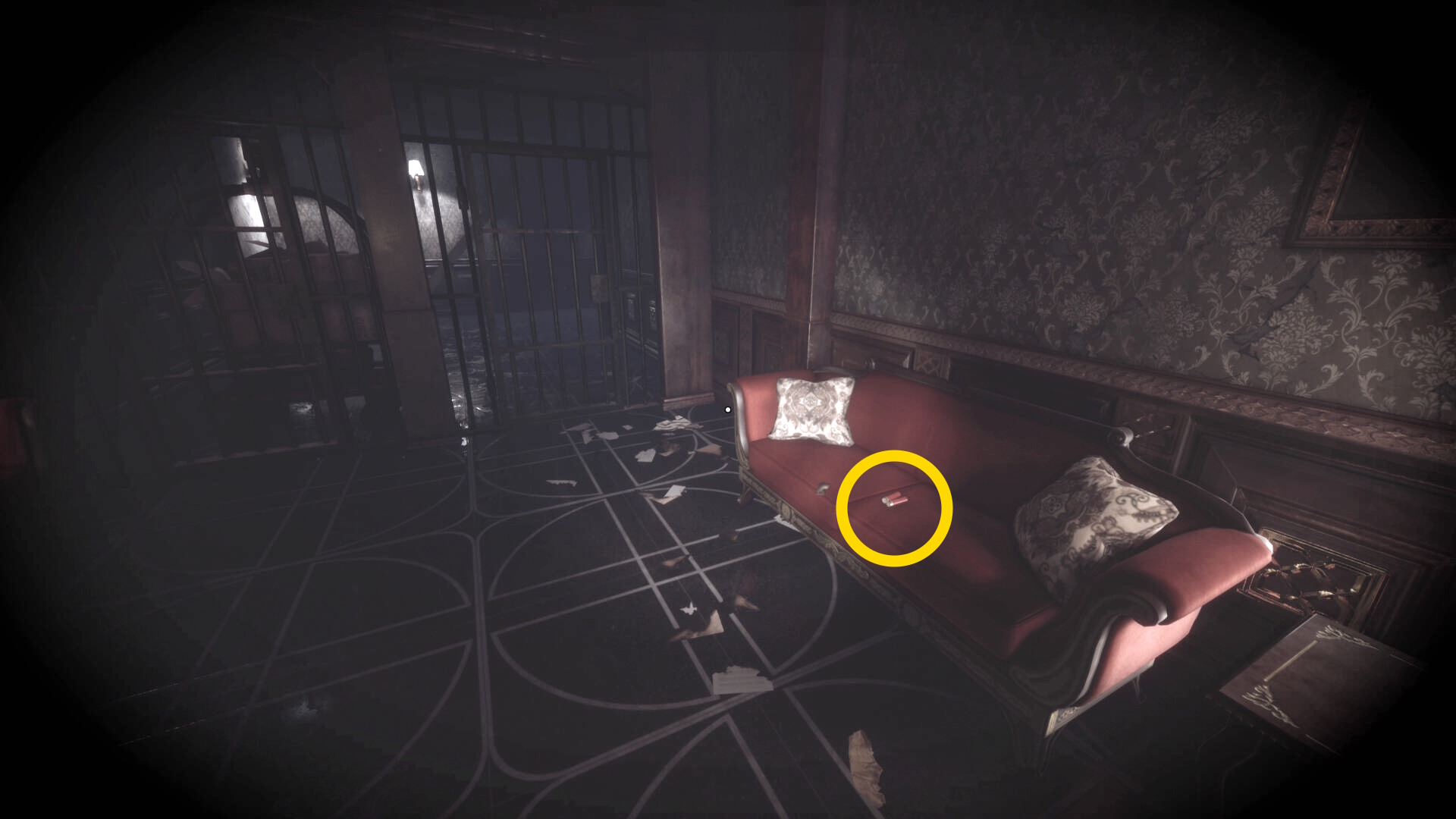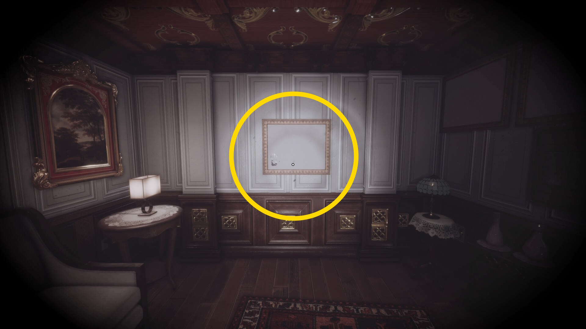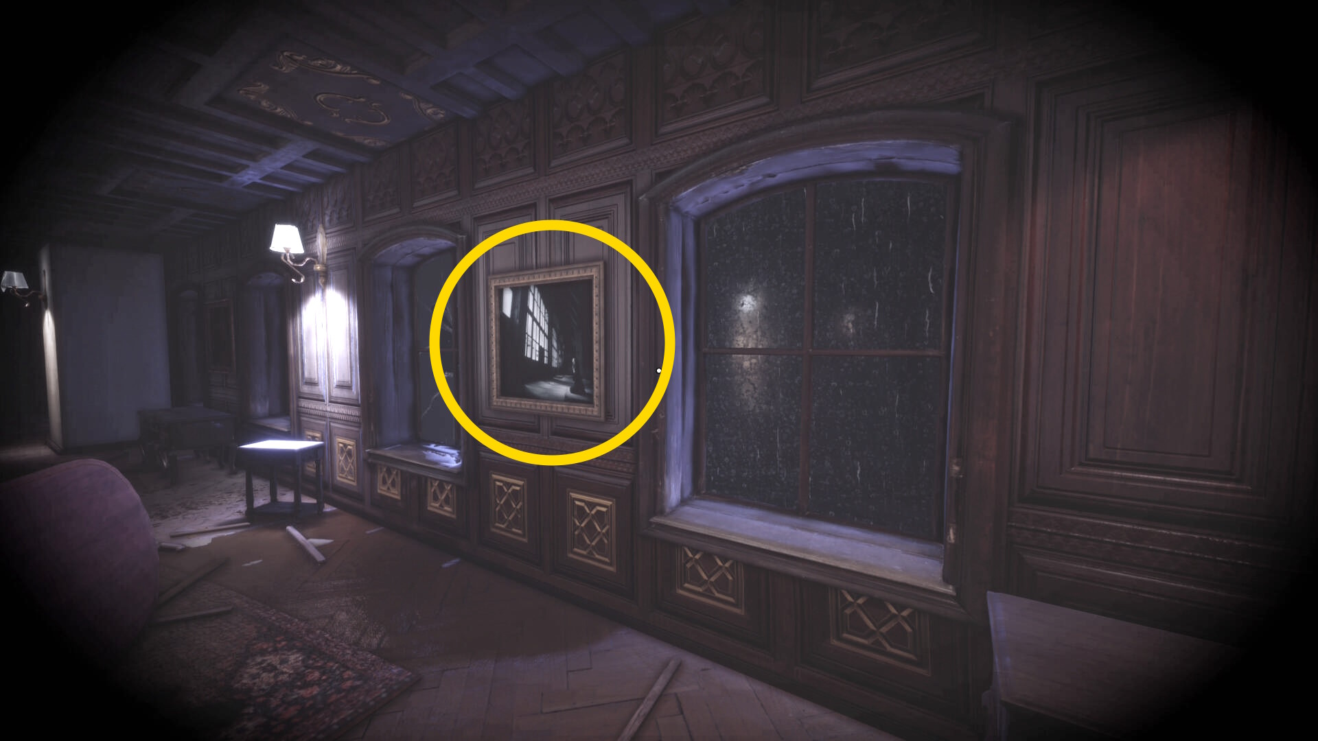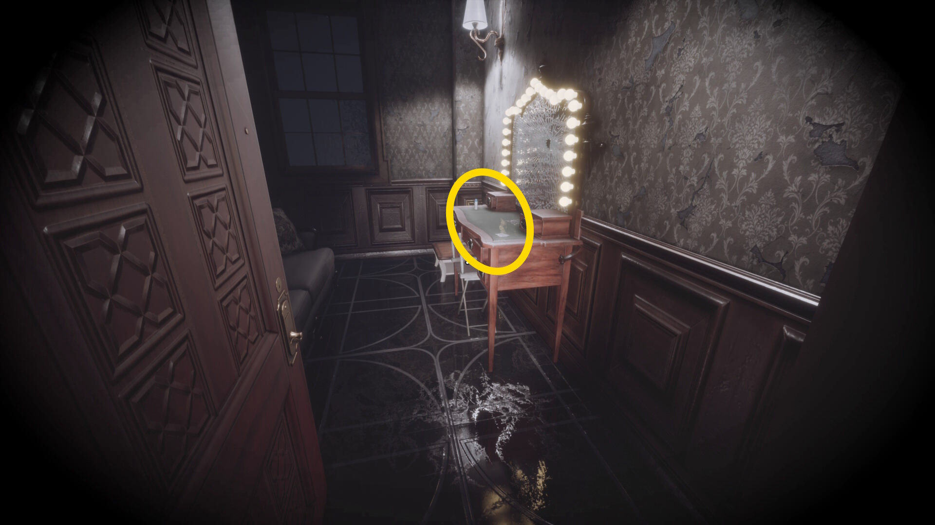 • なお、この机の奥の暗がりに敵が1体おり、かなり気づきにくいので注意(下画像:緑◯)(敵を倒す:9/10)