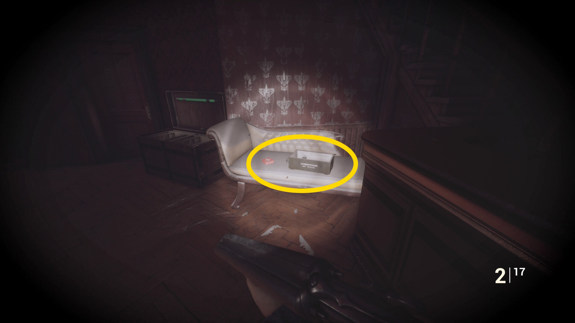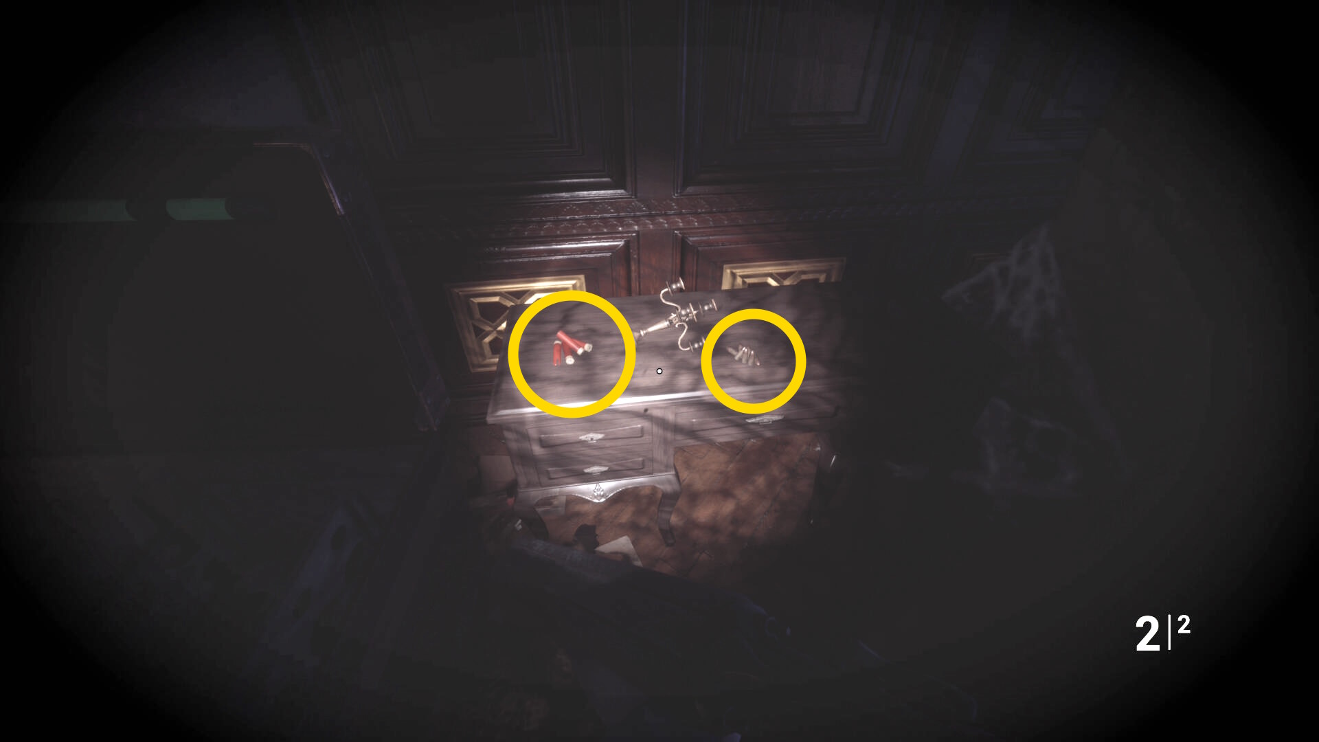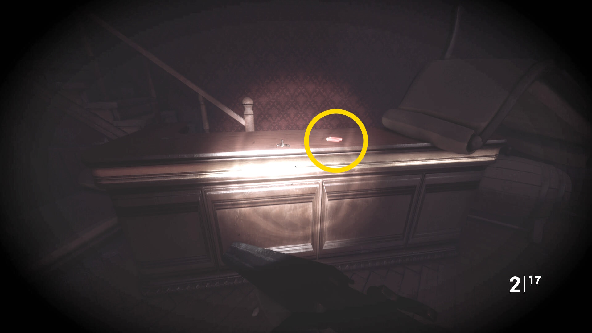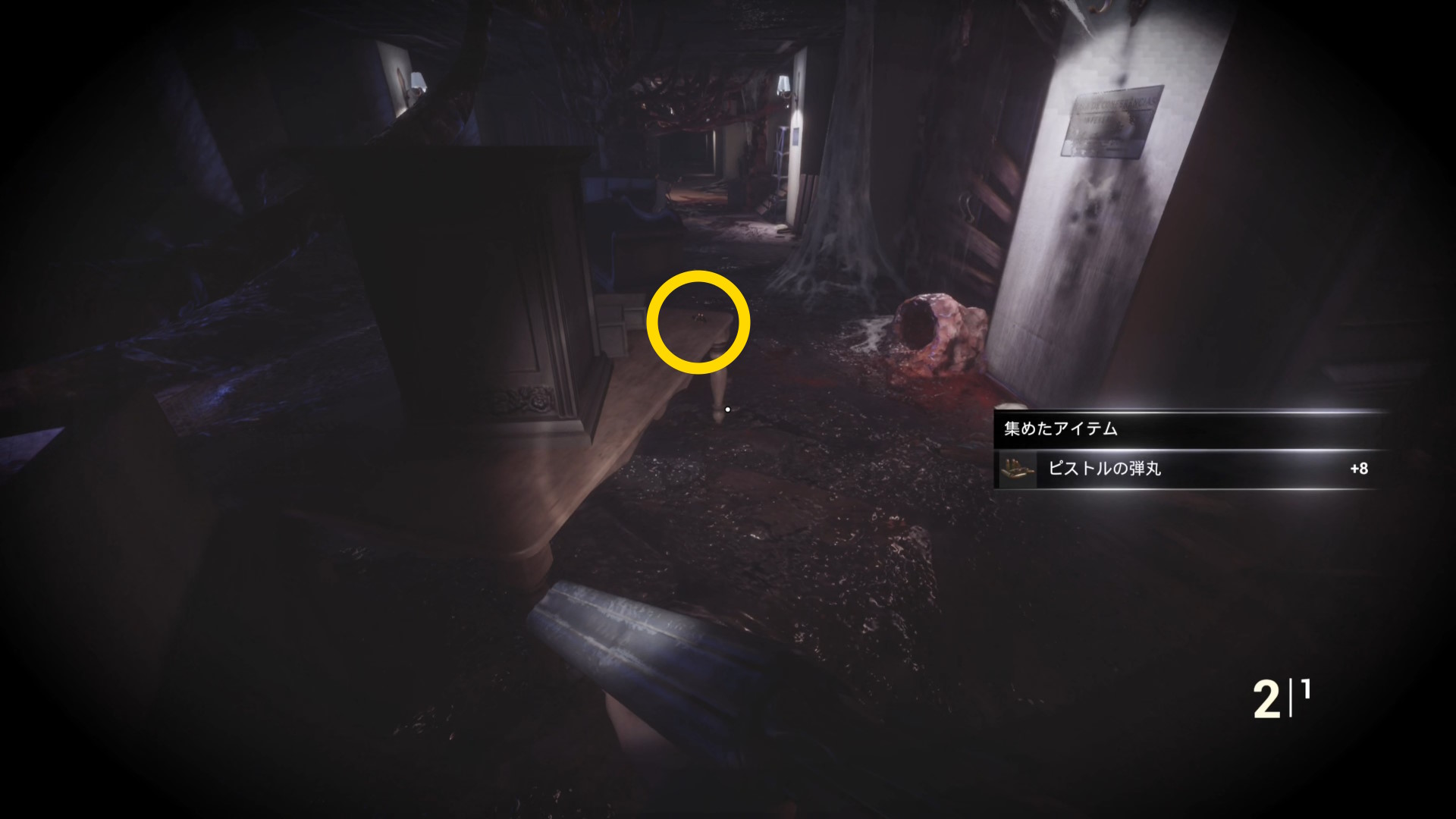 • 後ろを向くと花瓶が乗った台に ピストル弾薬 あり