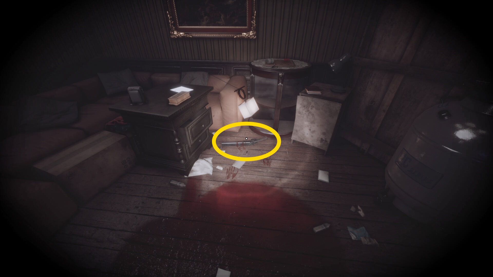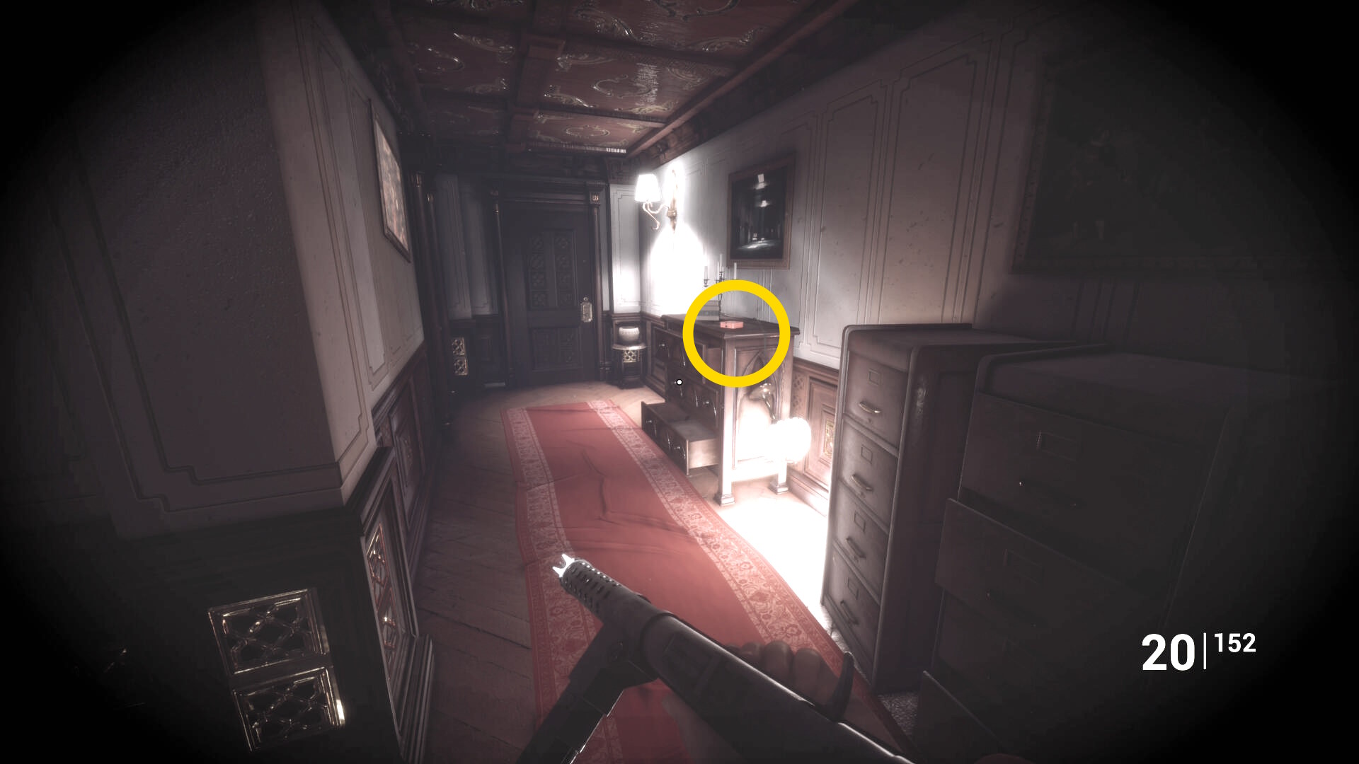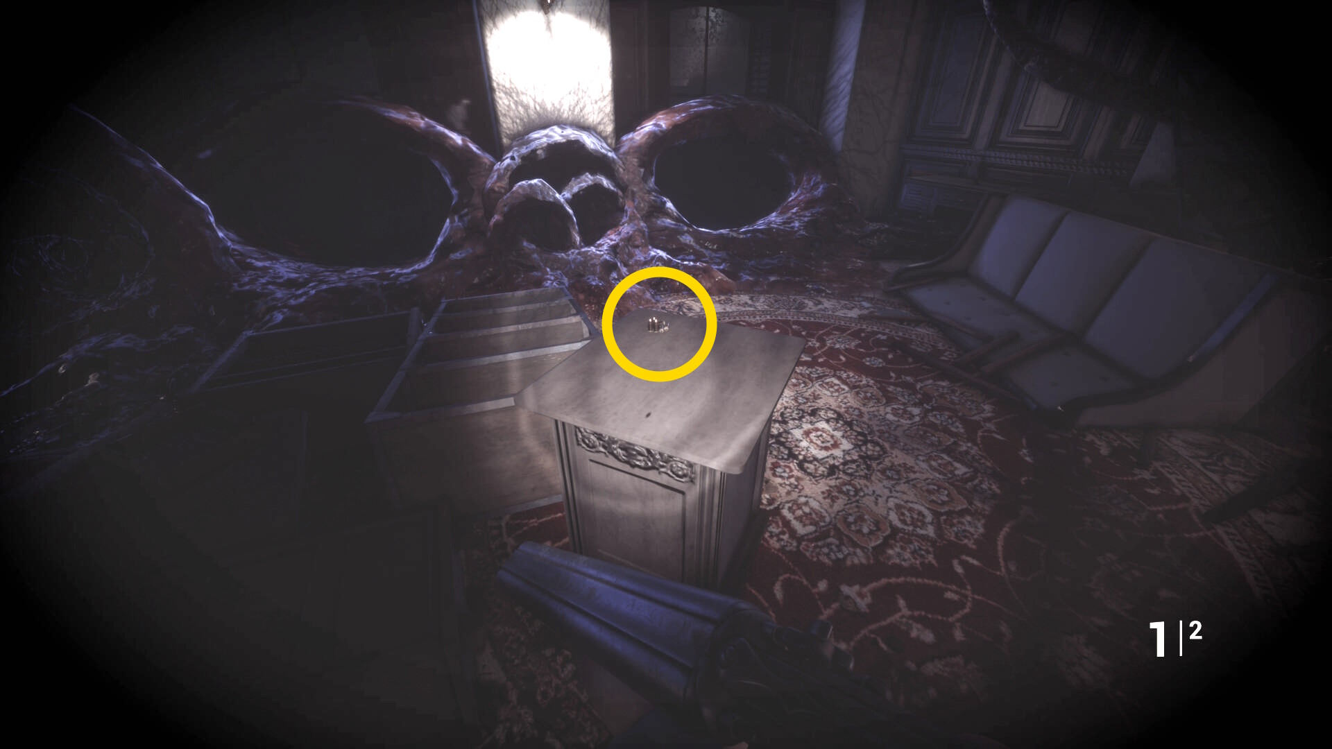 • 後ろを向くと花瓶が乗った台に ピストル弾薬 あり