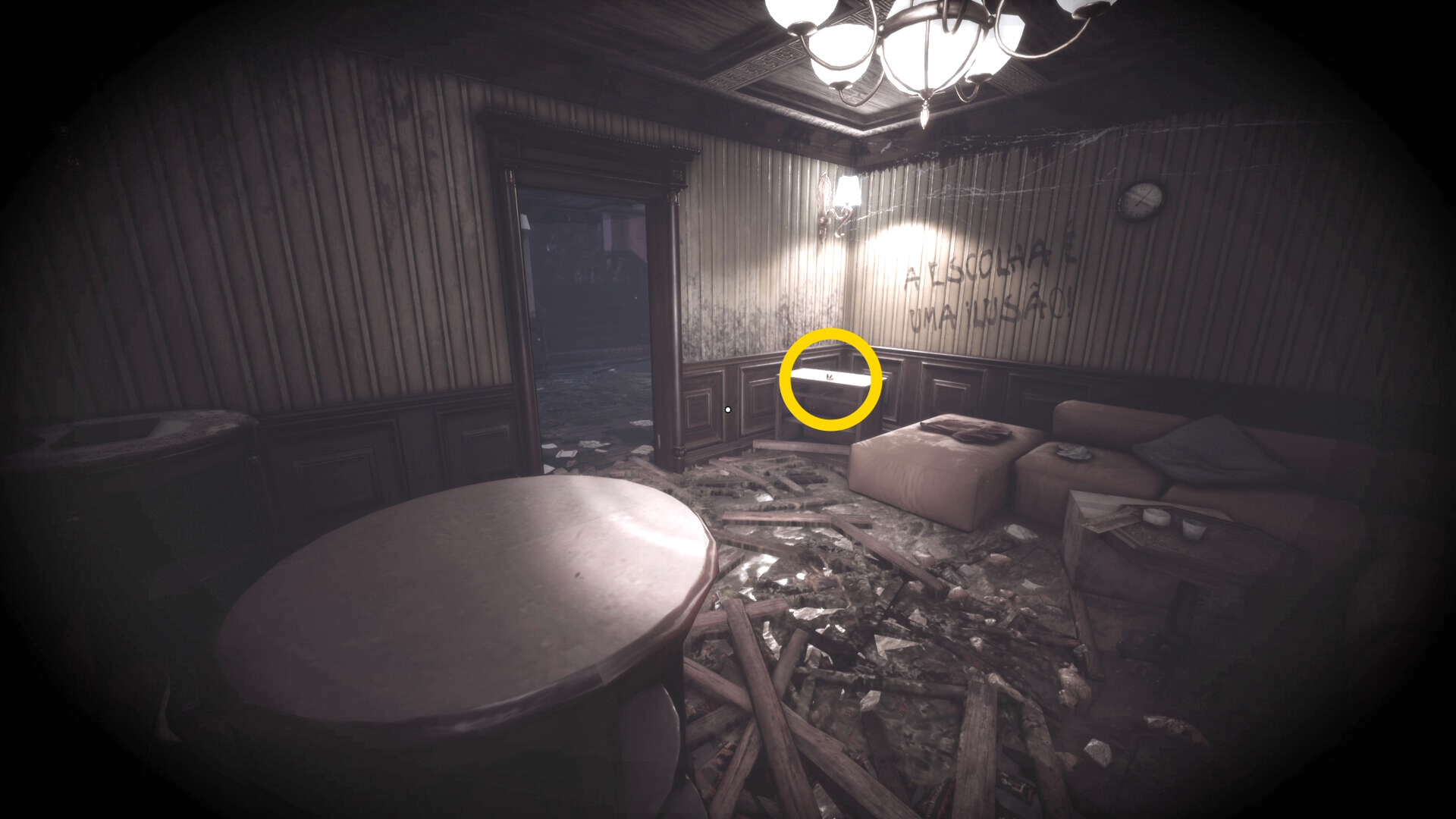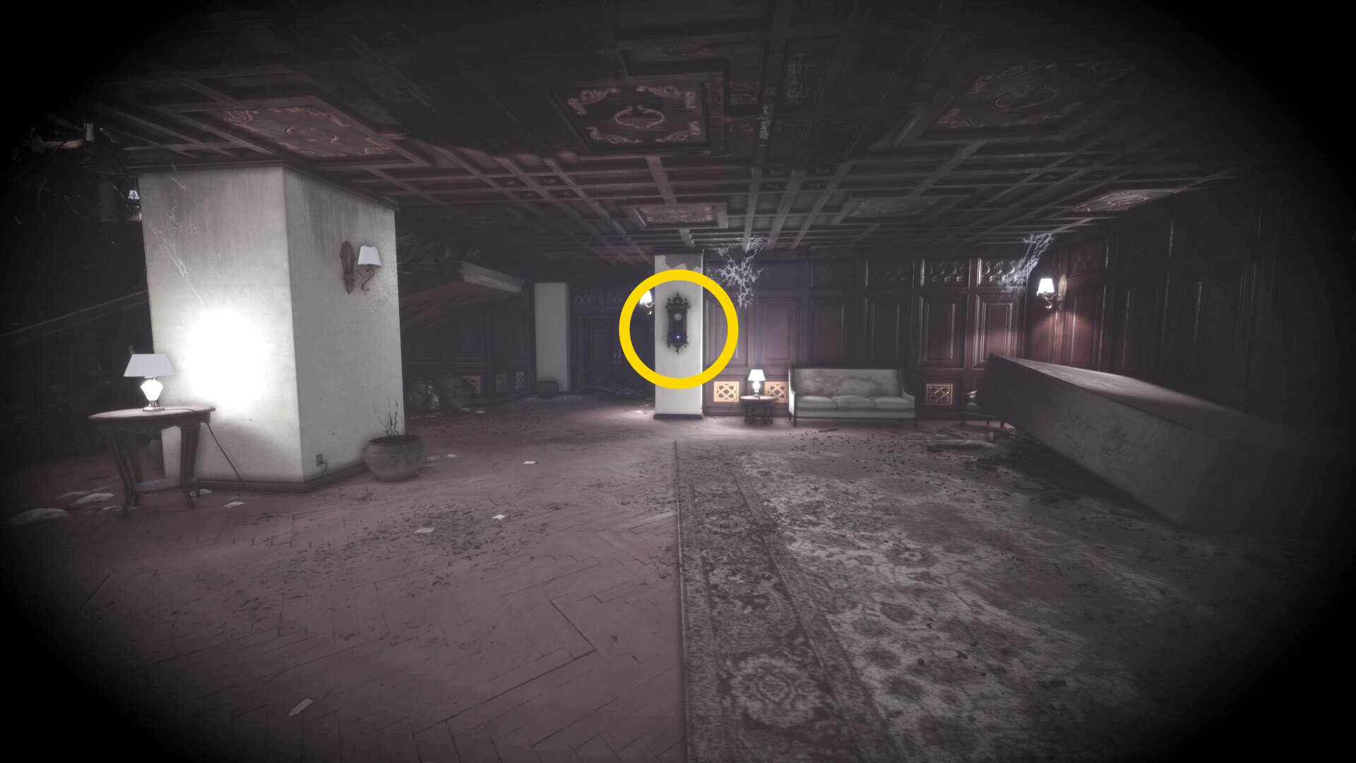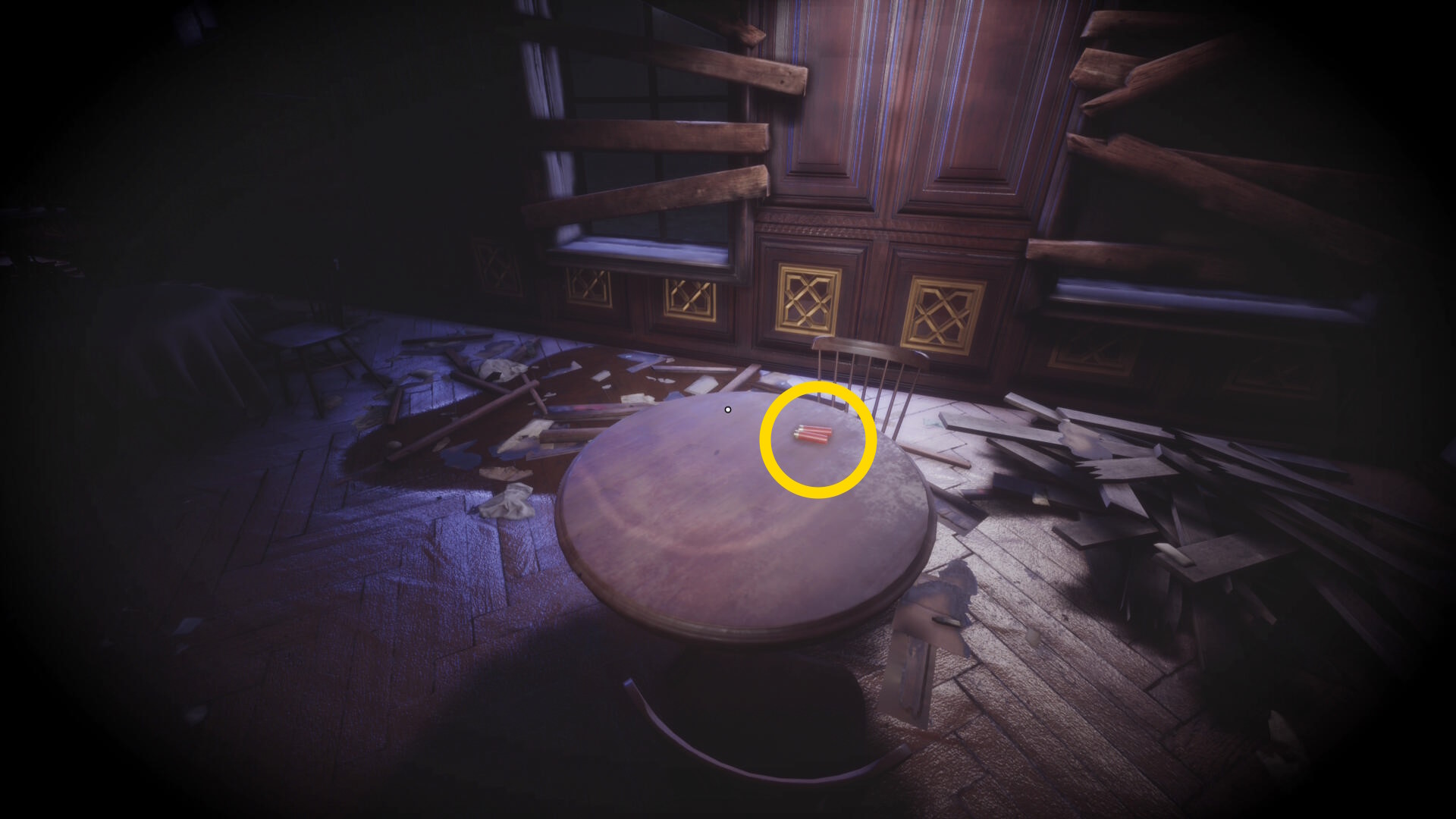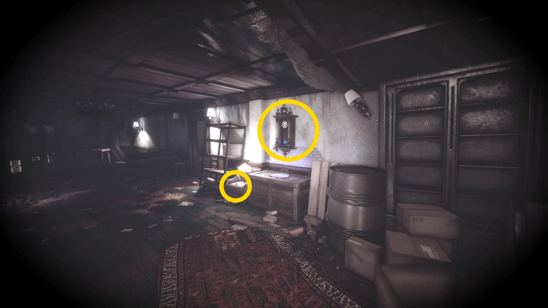 • 壁掛け時計の右にある丸机に ピストル弾薬 あり